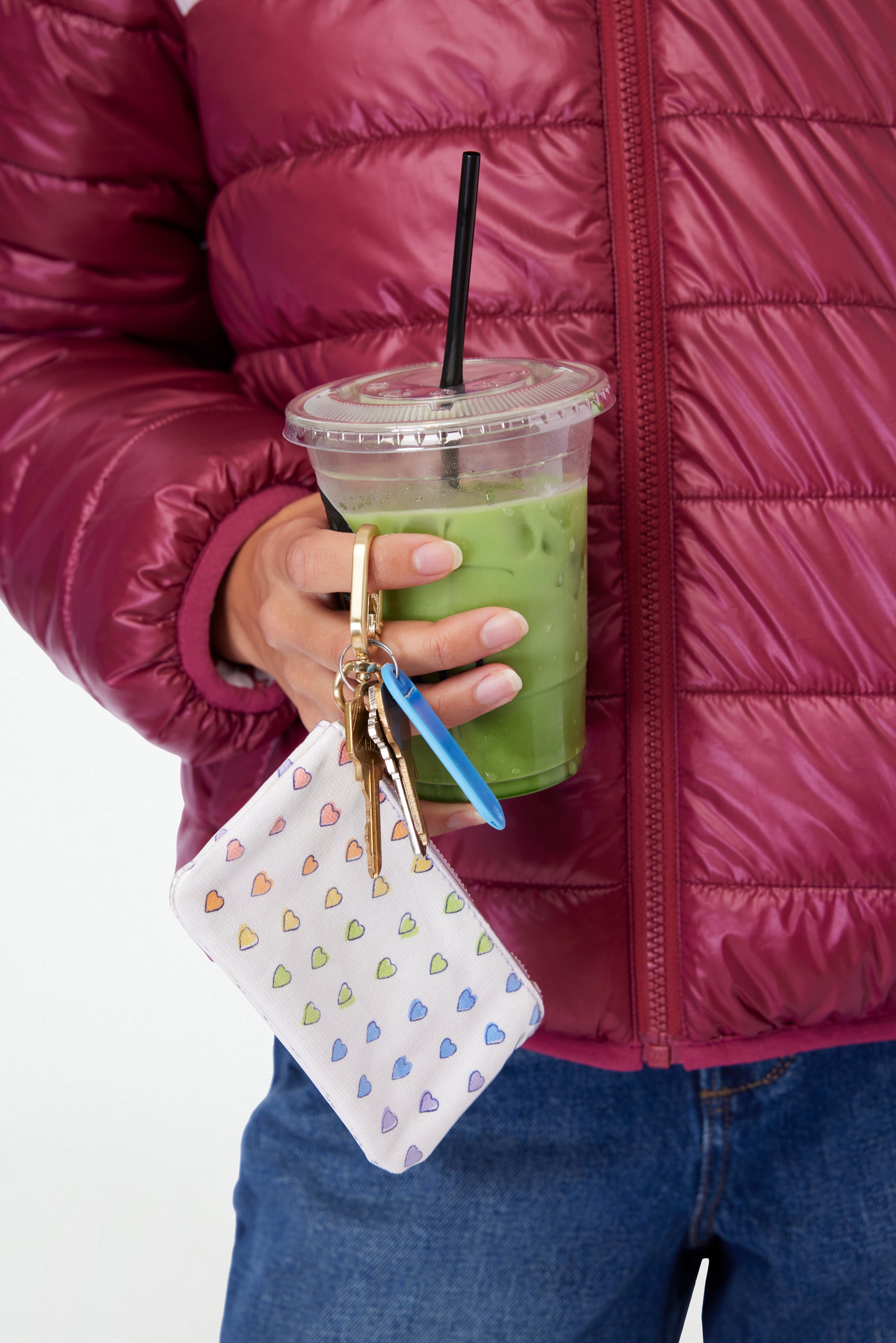With you wherever you need to go, the Disco Hearts Coin Pouch is a cute cotton canvas pouch for credit cards, cash, and coins. Clip it into your bag or on your keys when you're out and about.