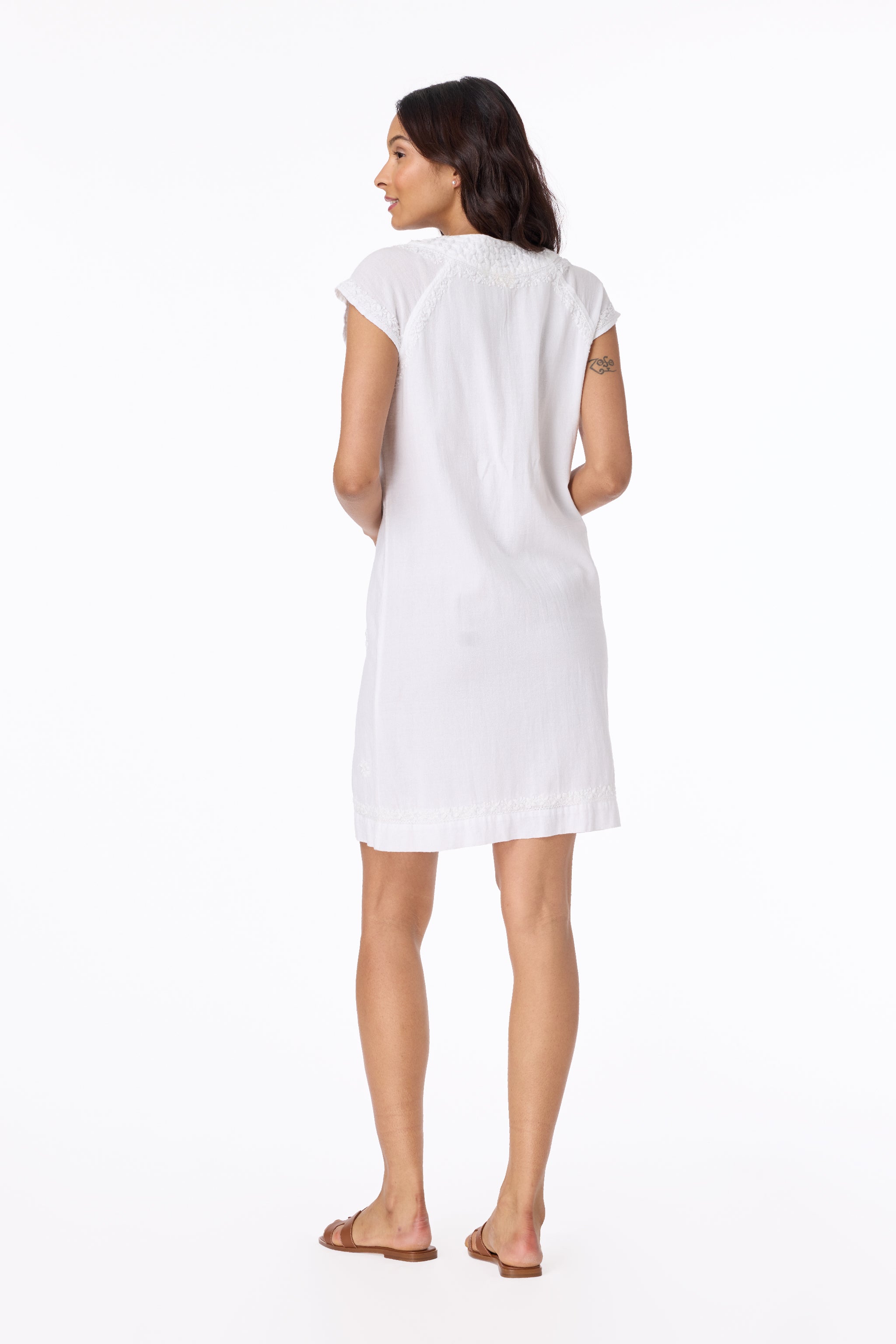 Our classic Faith dress symbolizes elegant, effortless style, and is a must-have for your wardrobe. It features a lightly lined slip, cap sleeves, a notch neckline, and intricate embroidery throughout.