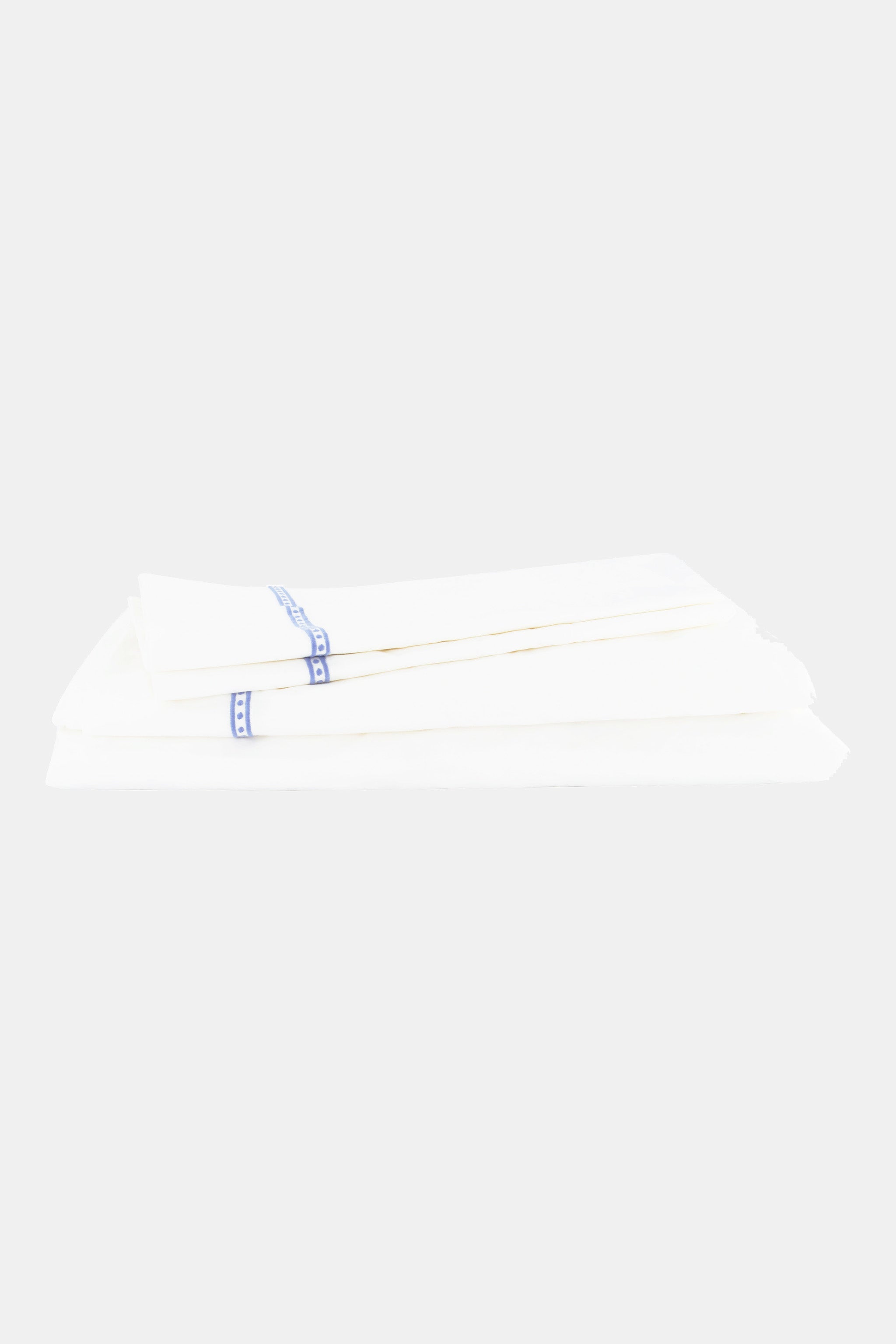 Sink into the crisp, airy feel of these 300-thread count cotton sheets on warm summer nights. Embroidered trim in sky blue adds just enough visual interest. This sheet set is available in twin, queen and king sizes.