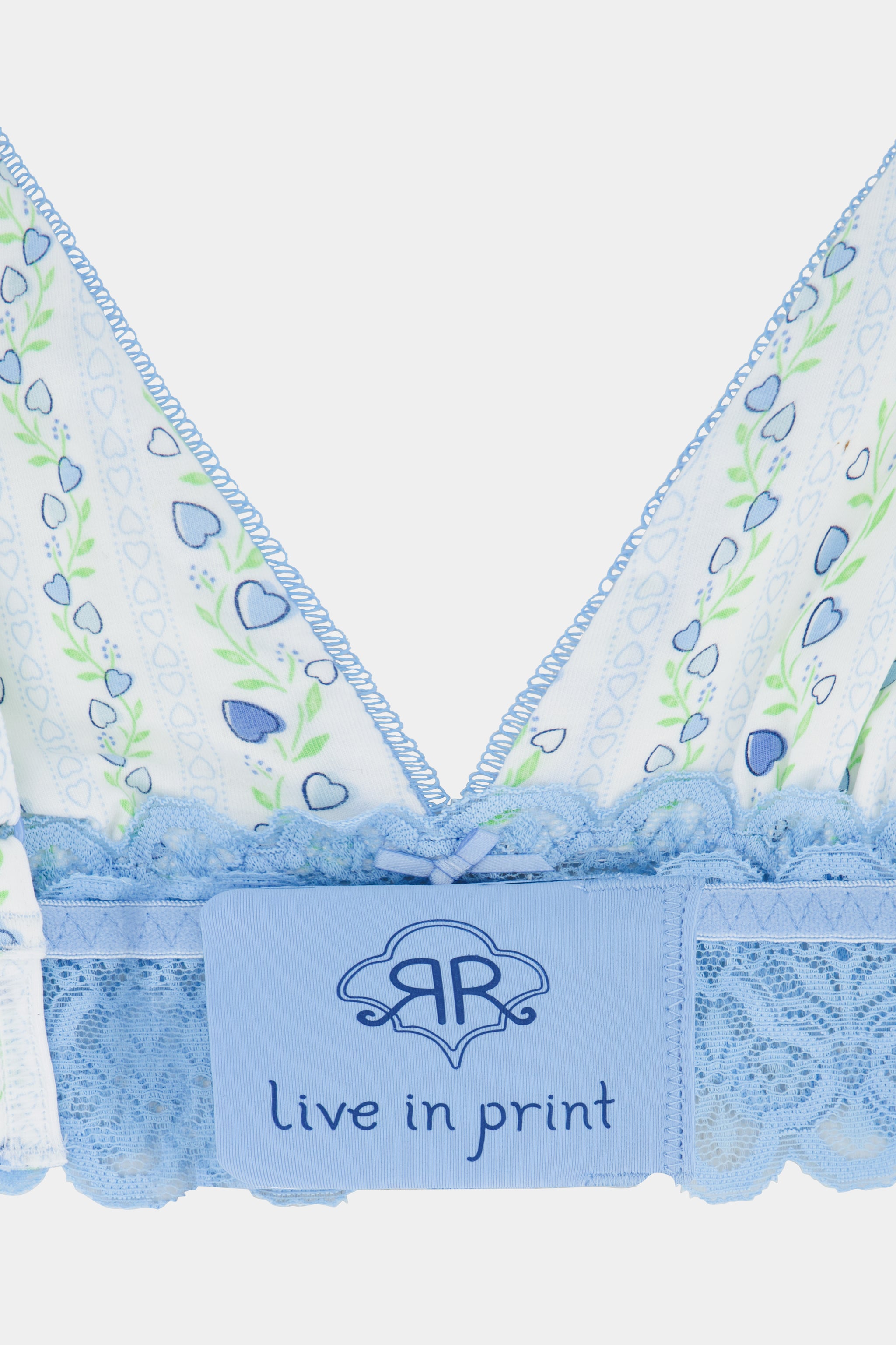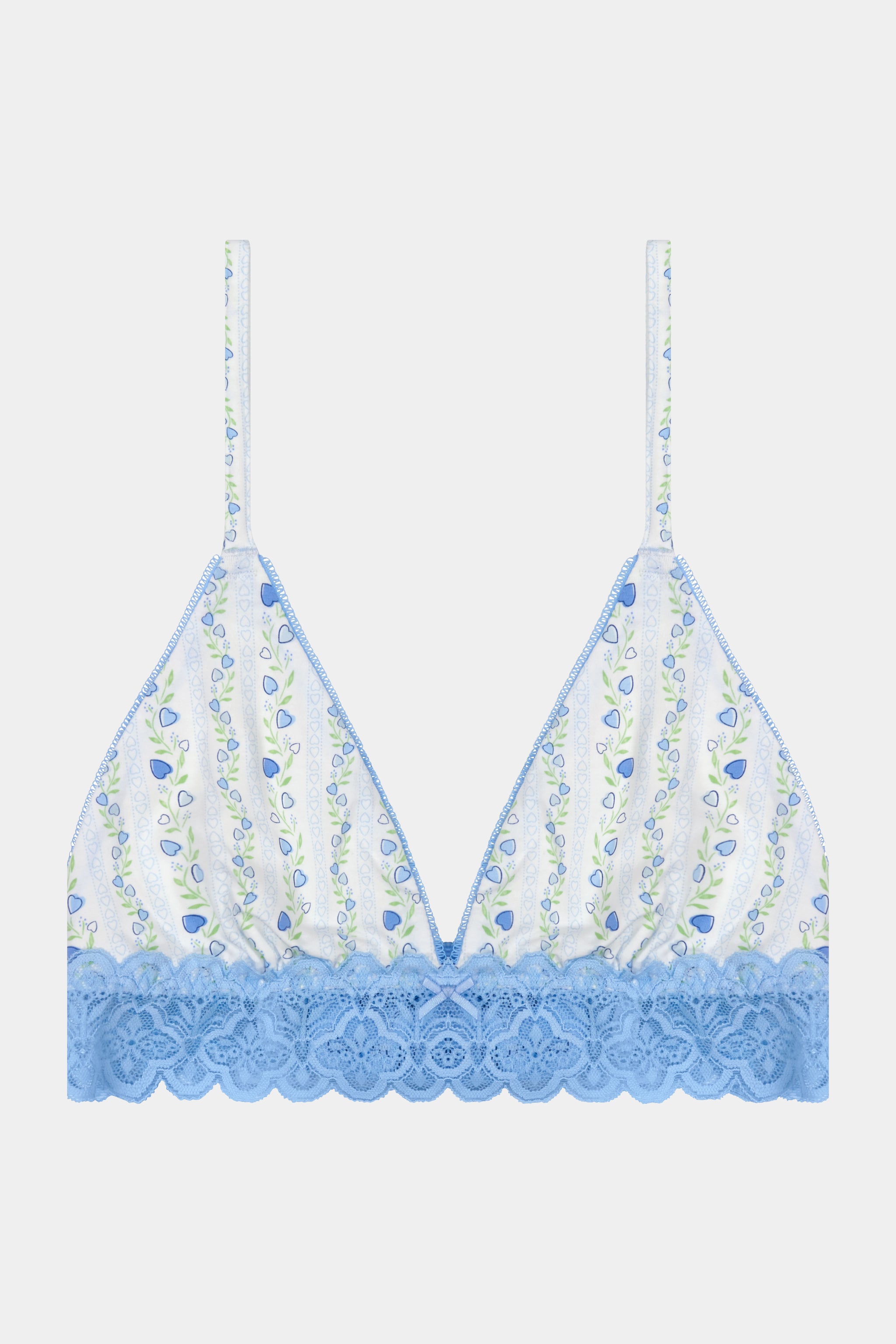 Perfect for weekends or everyday wear, our Mercer Bralette is a soft, comfortable triangle-style top made of cotton modal and covered in a sweet blue heart and vine print. Slim straps and a clasp back offer light support. Pair it with the matching Cornelia Hipster or Waverly Bikini for a matching set.