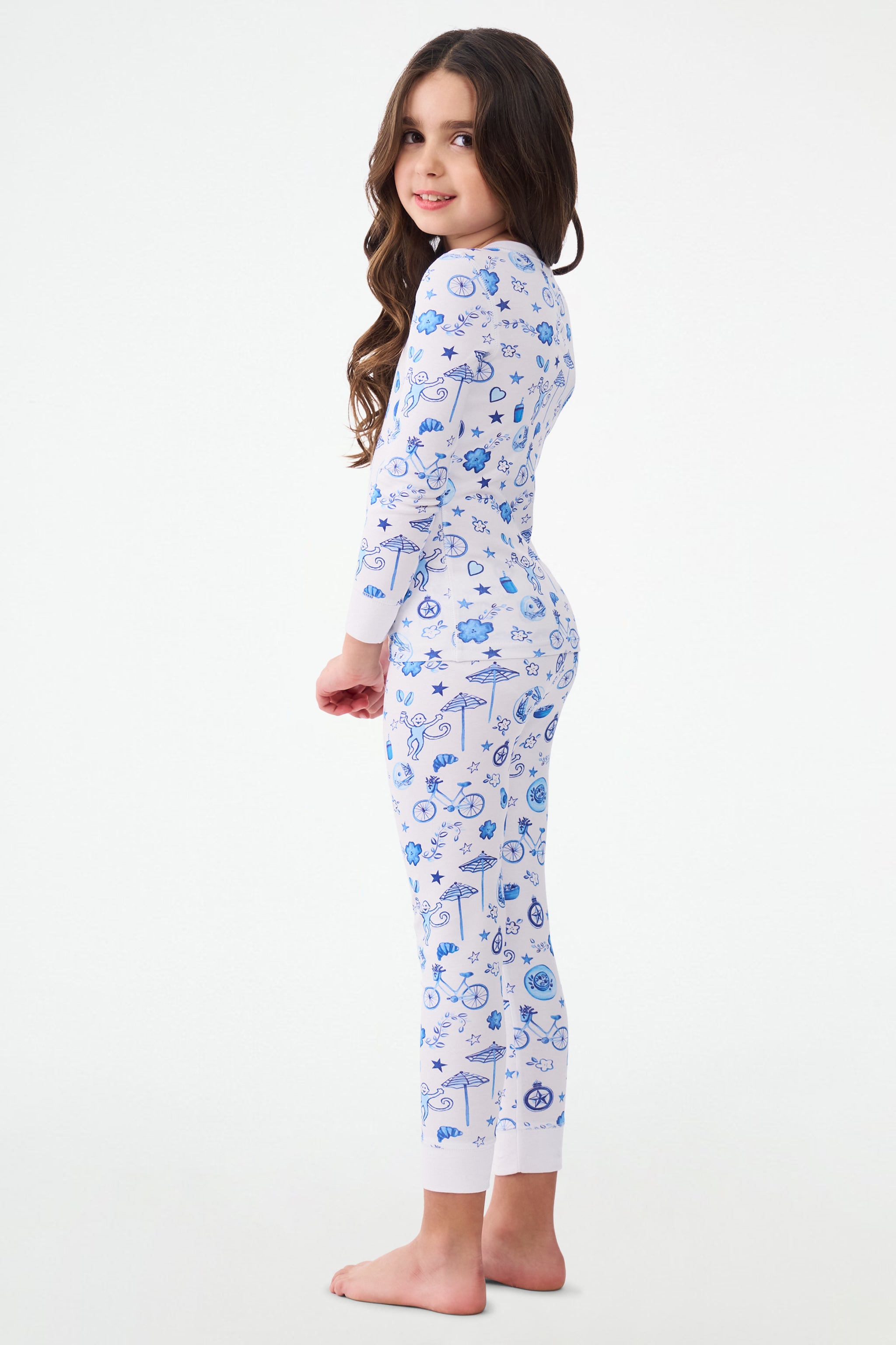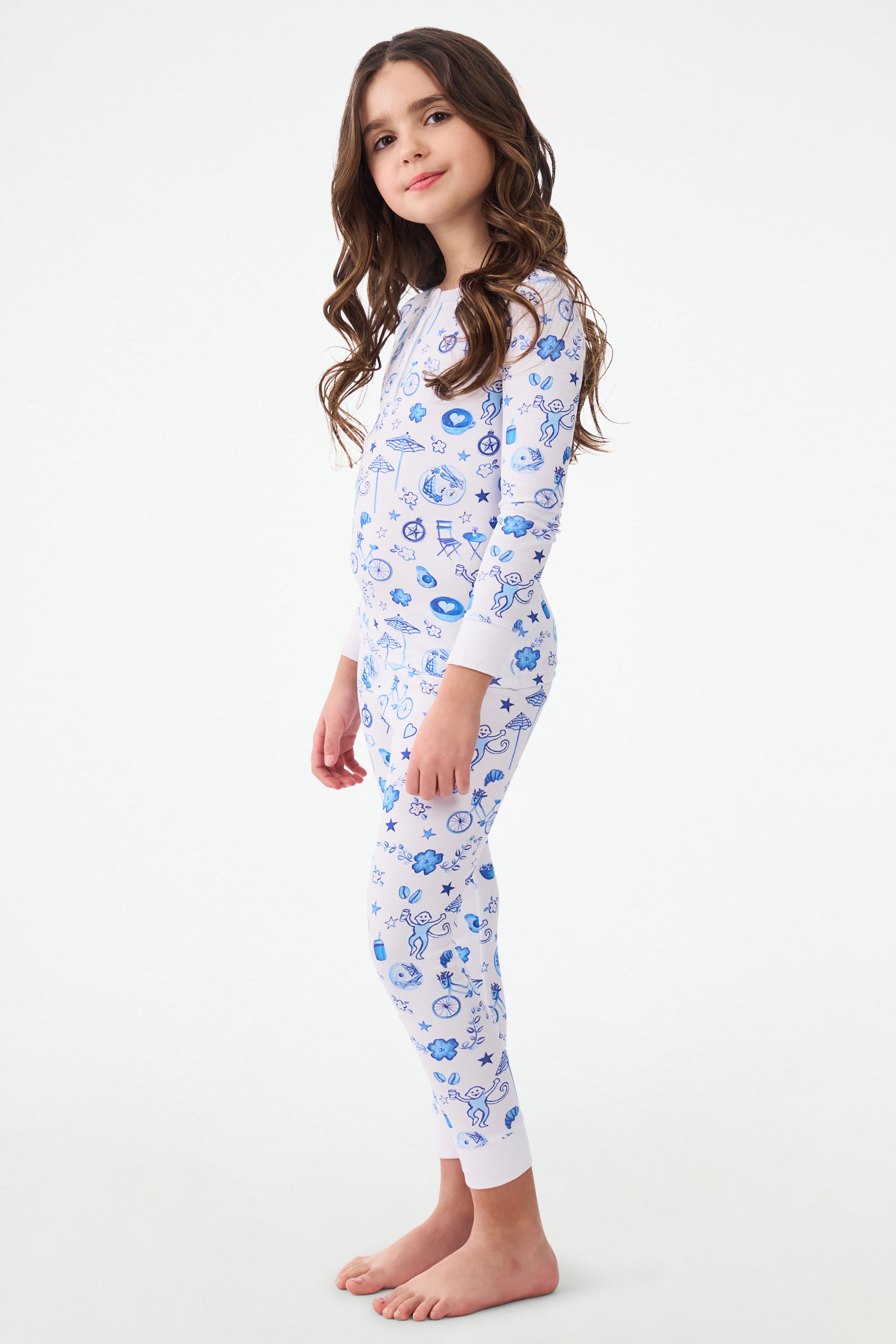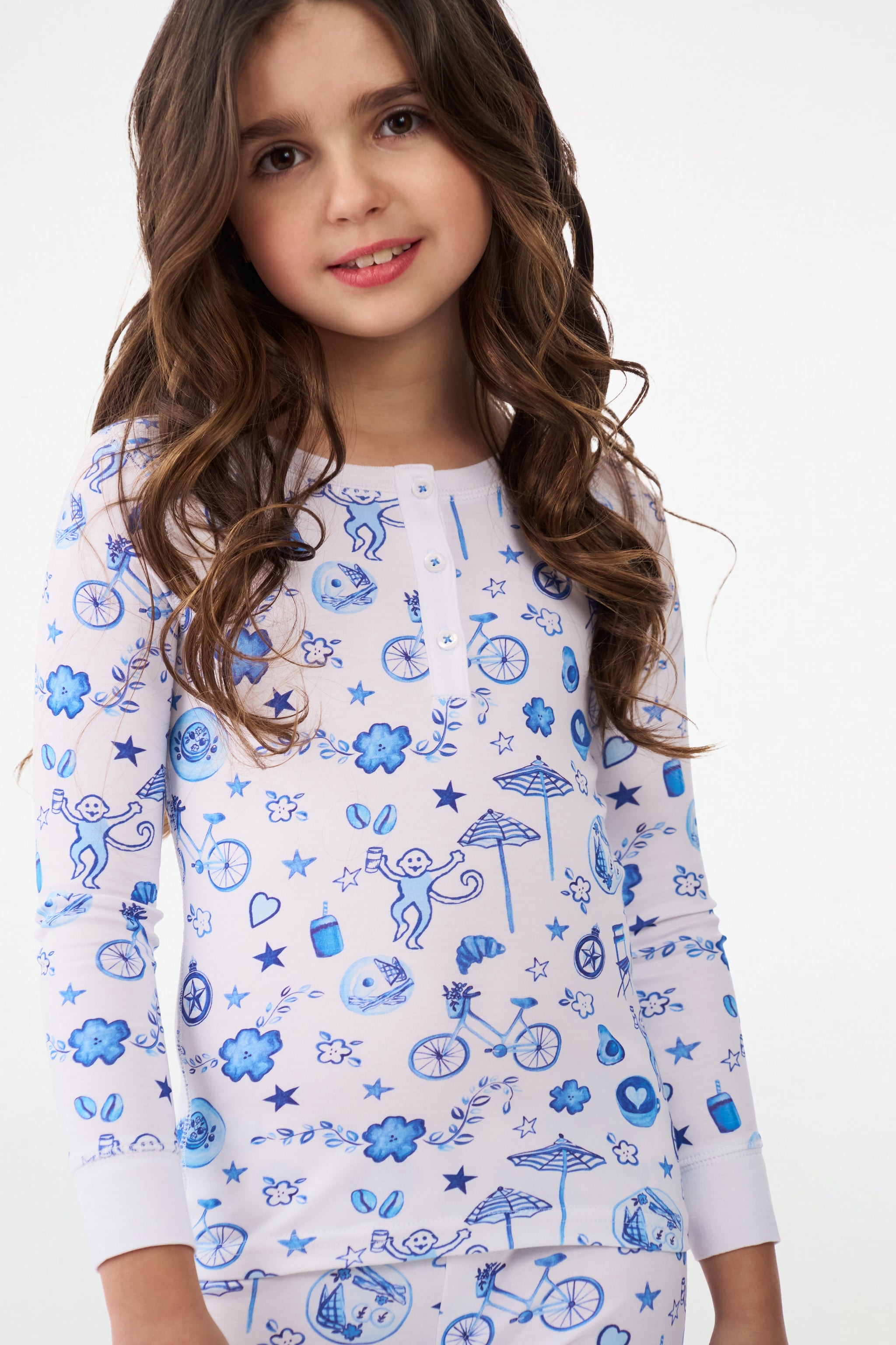 A sweet summery scene in the crispest, brightest blue! Your kids will love examining every delightful detail in these dreamy Pima cotton PJs, including our signature monkeys paired with Bluestone's summery scrumptious snacks.