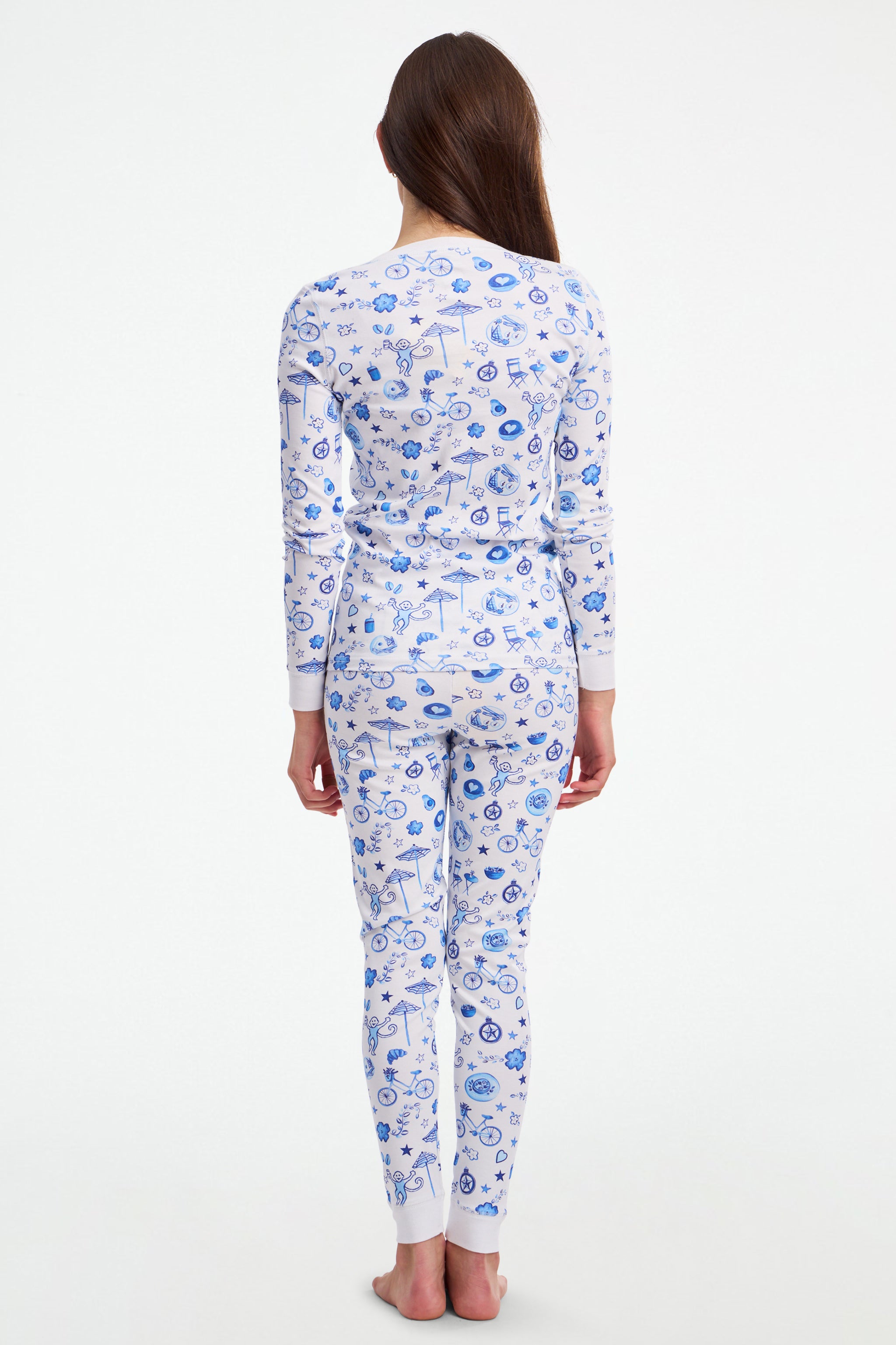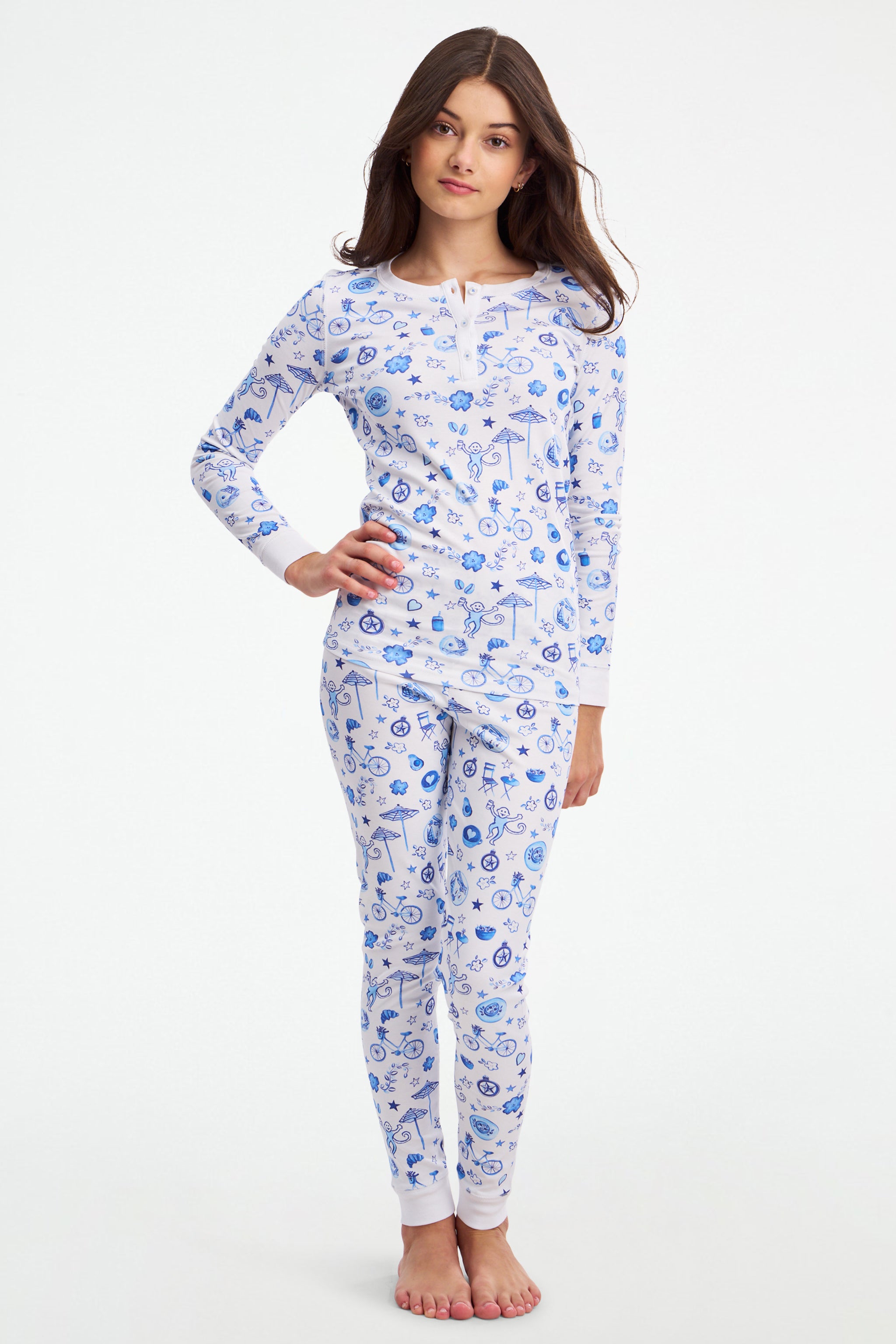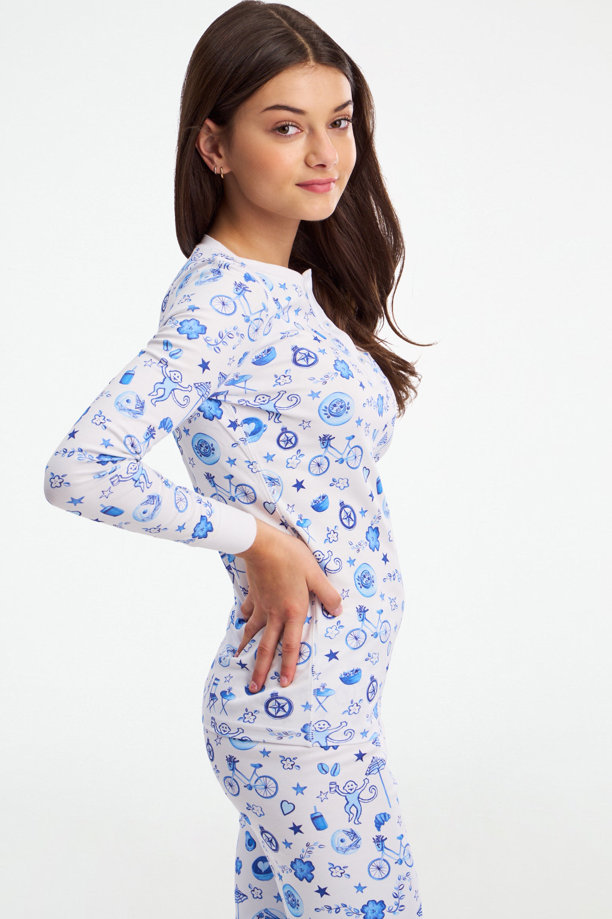 A sweet summery scene in the crispest, brightest blue! Your kids will love examining every delightful detail in these dreamy Pima cotton PJs, including our signature monkeys paired with Bluestone's summery scrumptious snacks.