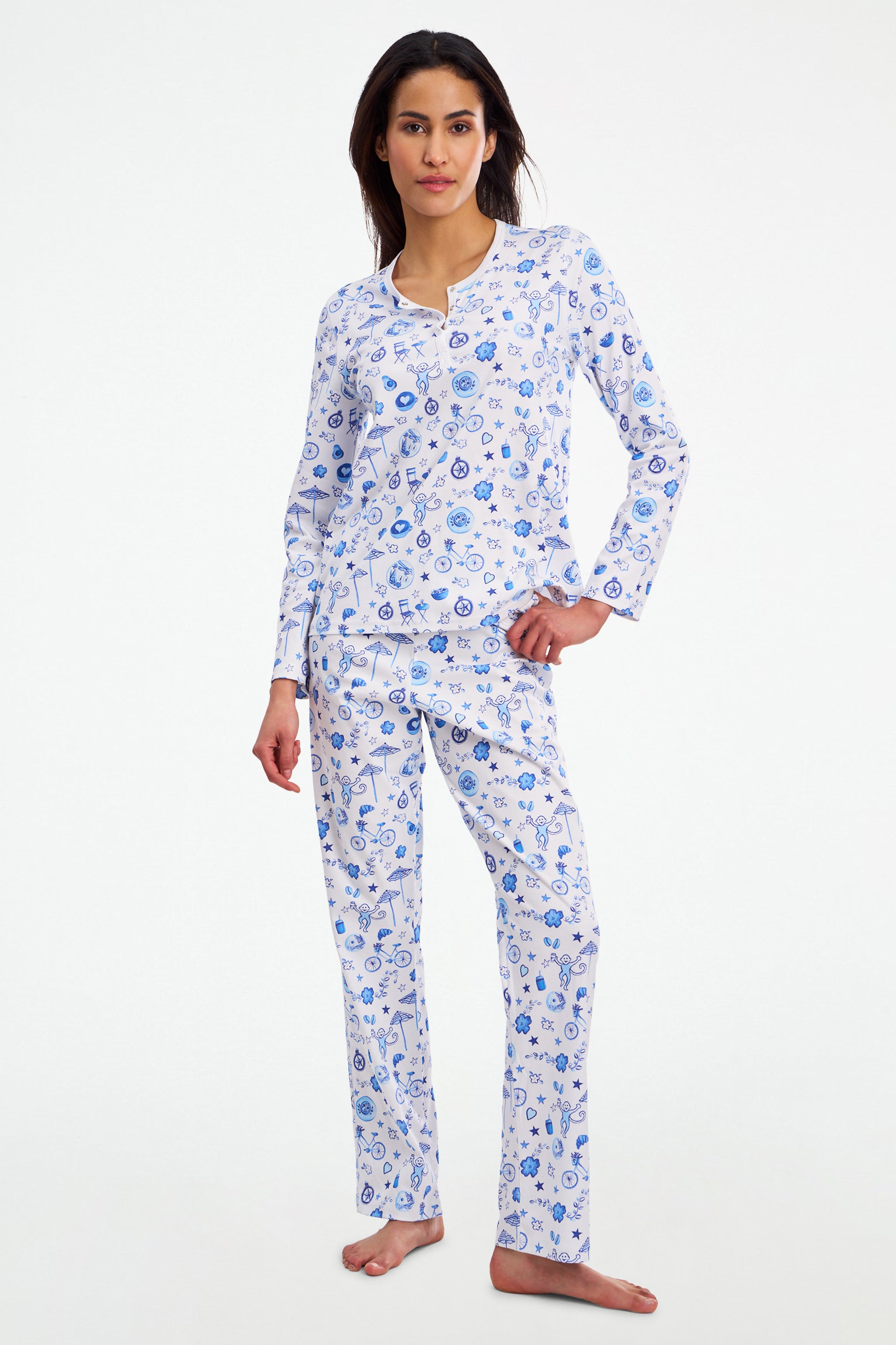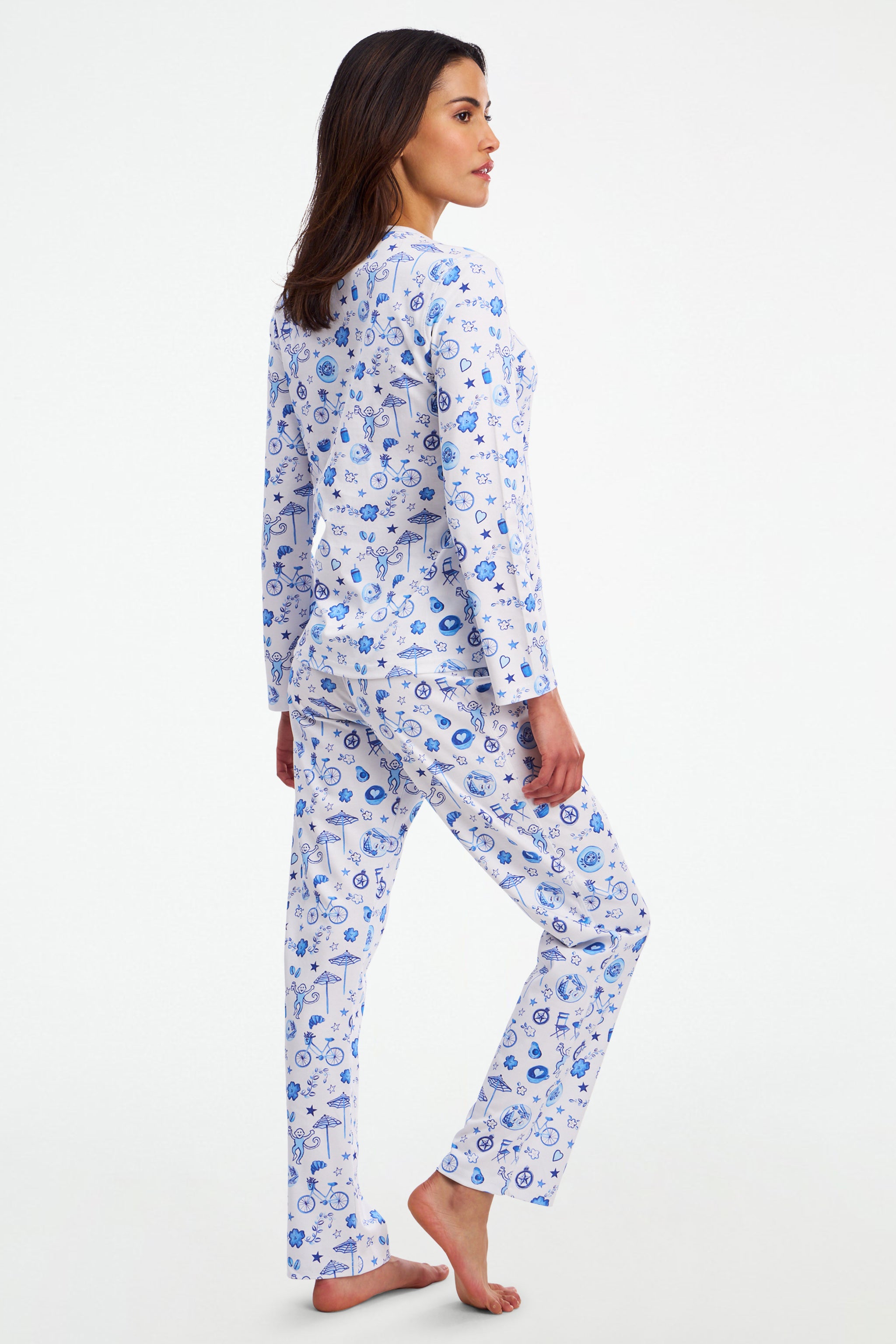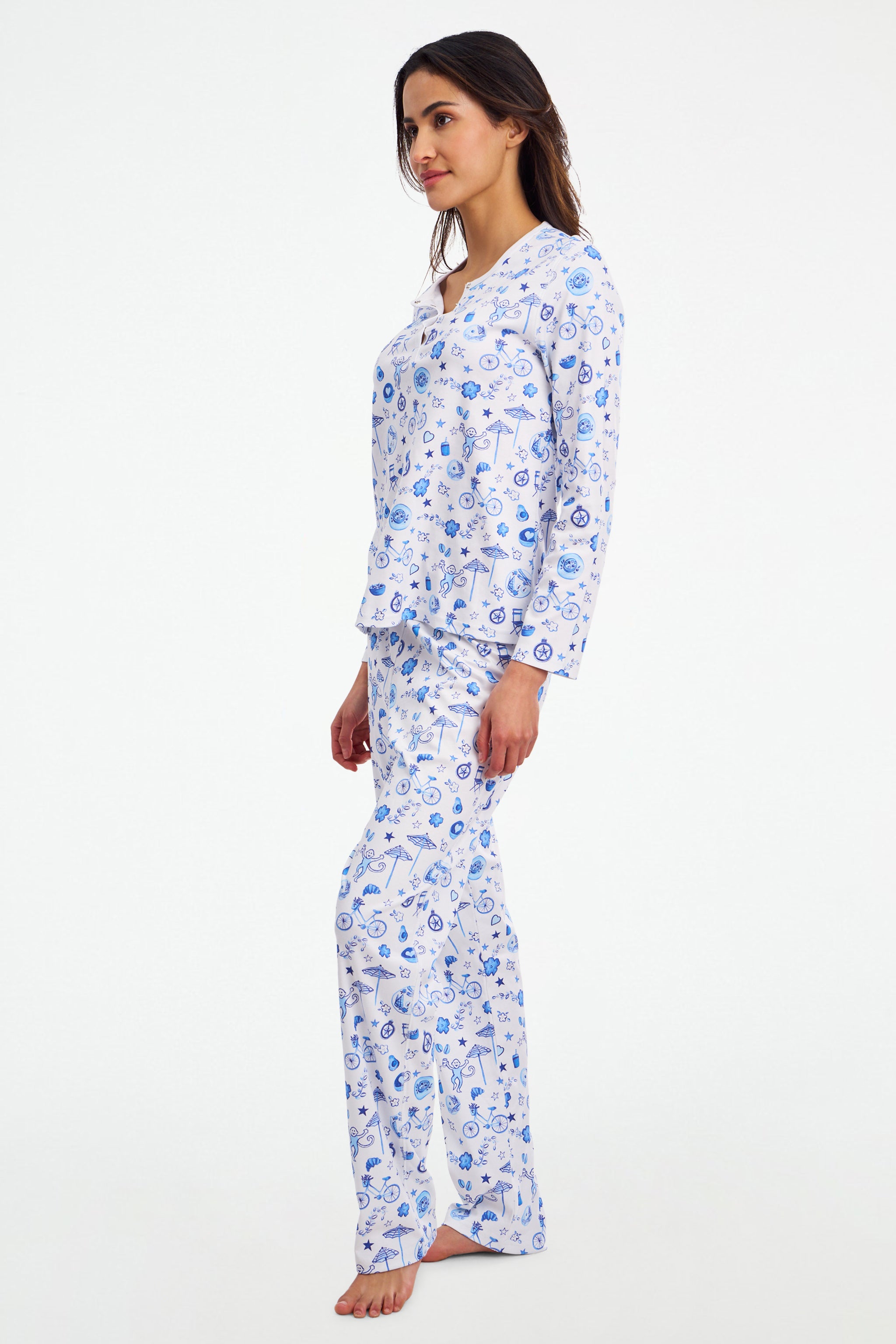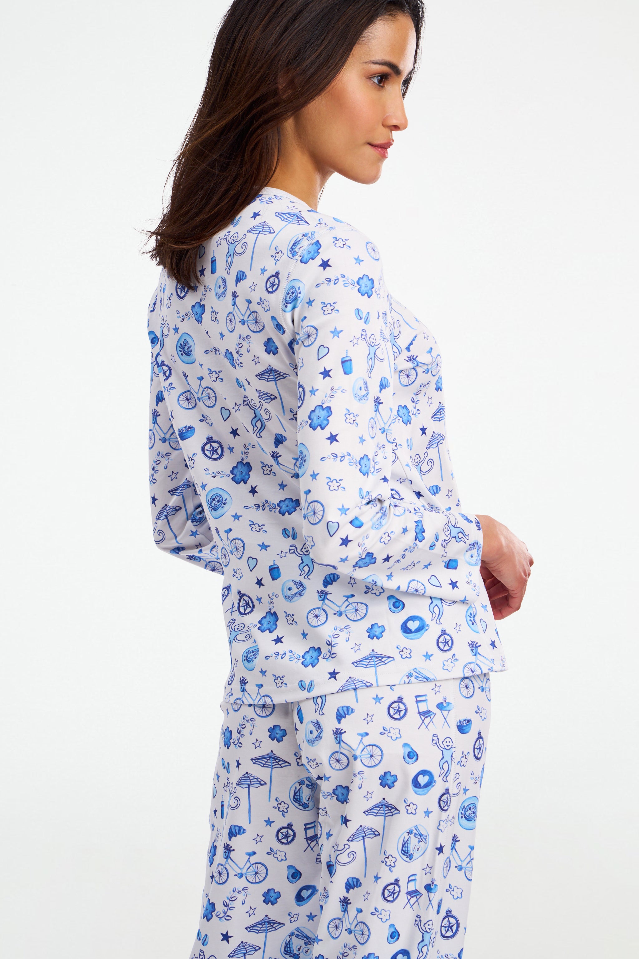 A crisp, blue and white print elevates a simple long-sleeved top and pants pajama set. With the Bluestone café ambiance, the Women's Pajamas will be your go-to all season long.