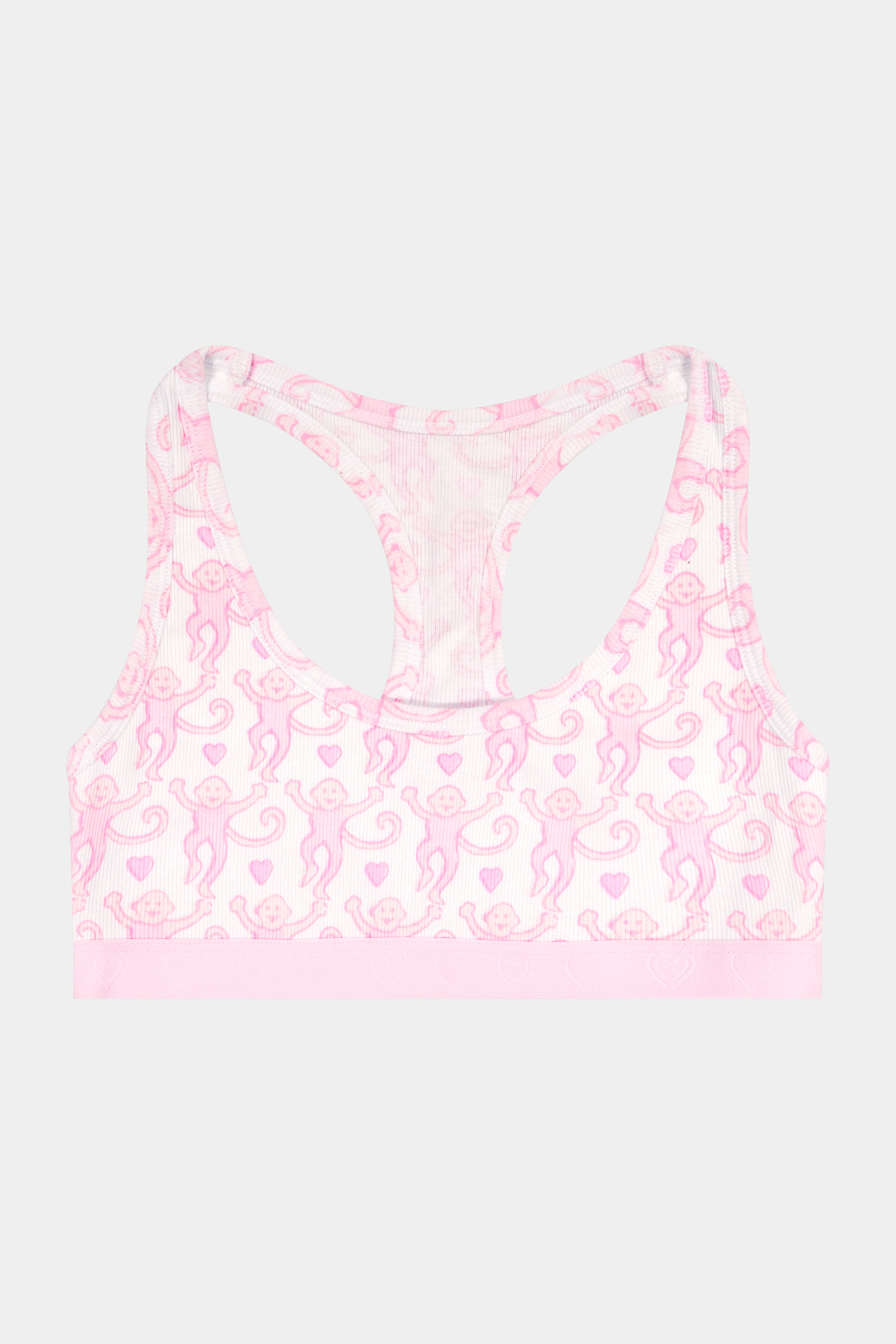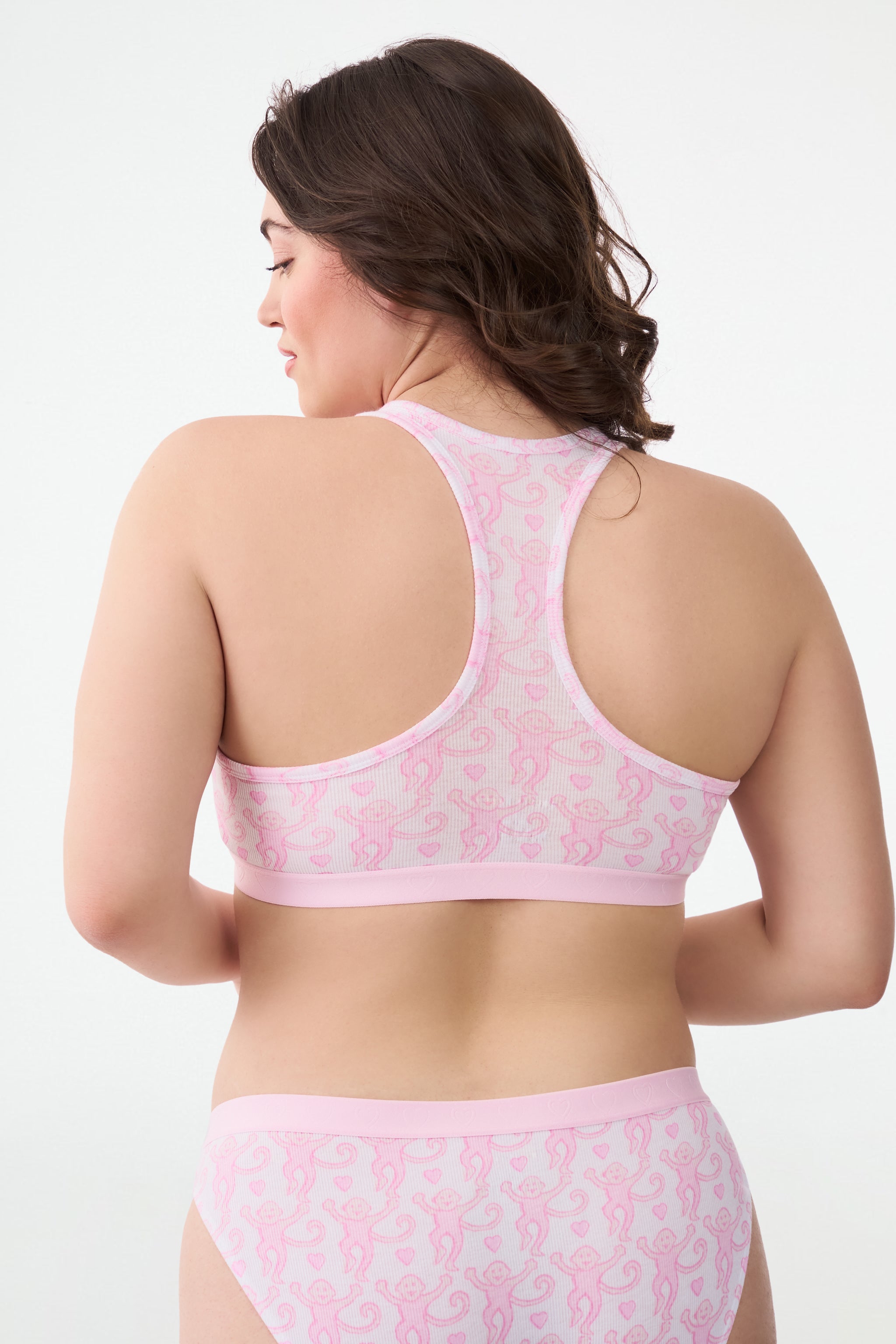 Getting dressed is so much more fun with the Madison Racerback Bralette. This pullover style in soft pima modal is lightly supportive and comes in the most whimsical, pale pink monkey print.