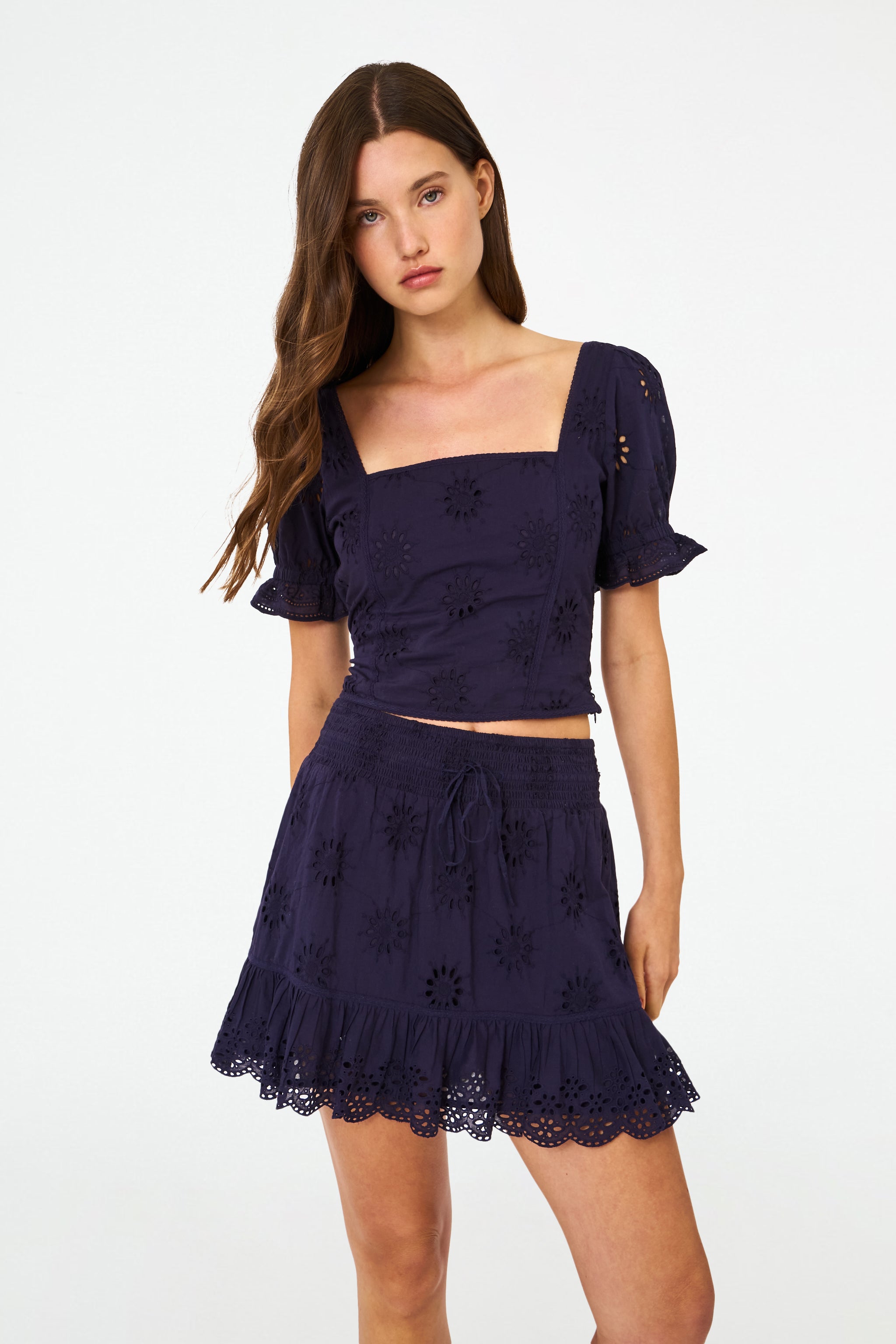 A little eyelet miniskirt comes in handy. Just ask our Peyton Skirt, a navy cotton skirt with a smocked tie waistband and flirty ruffled hem. We love it paired with the Kayla Top, but it looks just as good with a sweater, cardigan, or T-shirt.