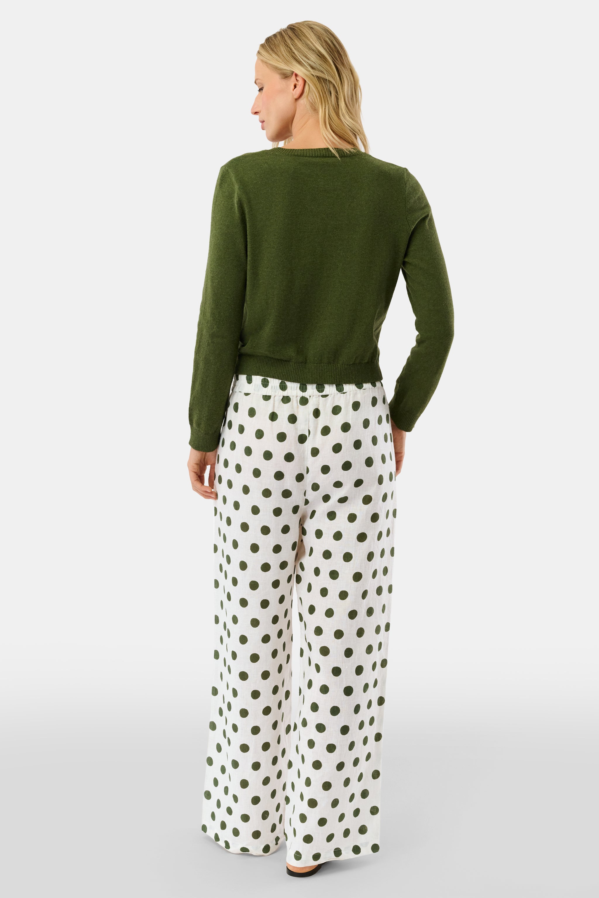Linen pants are a warm-weather mainstay, so why not have a little fun with a new pair? The Kaylee Pant is a full-length, pull-on linen pant in our olive Polka Dot print.