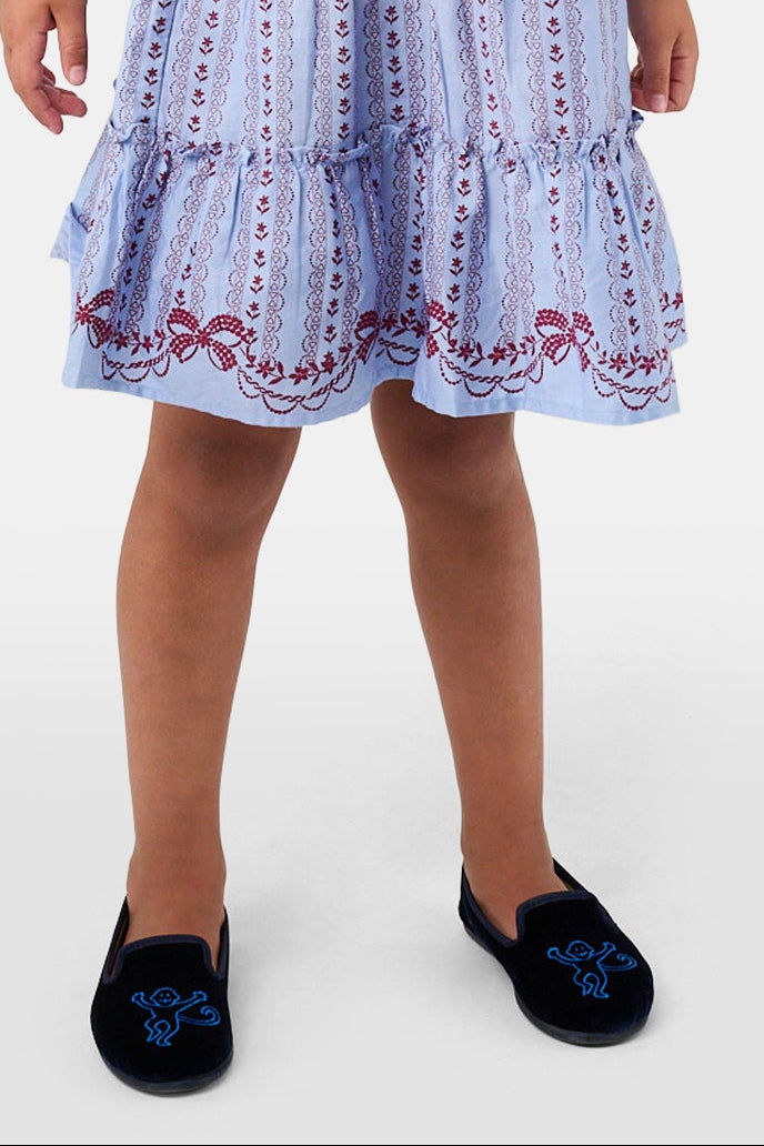 The Verona Navy Slip-on from our limited edition holiday collection, with Roller Rabbit. Our acclaimed navy velvet, now embroidered with Roller Rabbit’s signature monkey, brings playful charm to this classic style. These shoes are perfect for holiday parties, special occasions, and everyday twirls. Designed for comfort, style, and holiday magic, make every step memorable with Roller Rabbit for ChildrenChic.