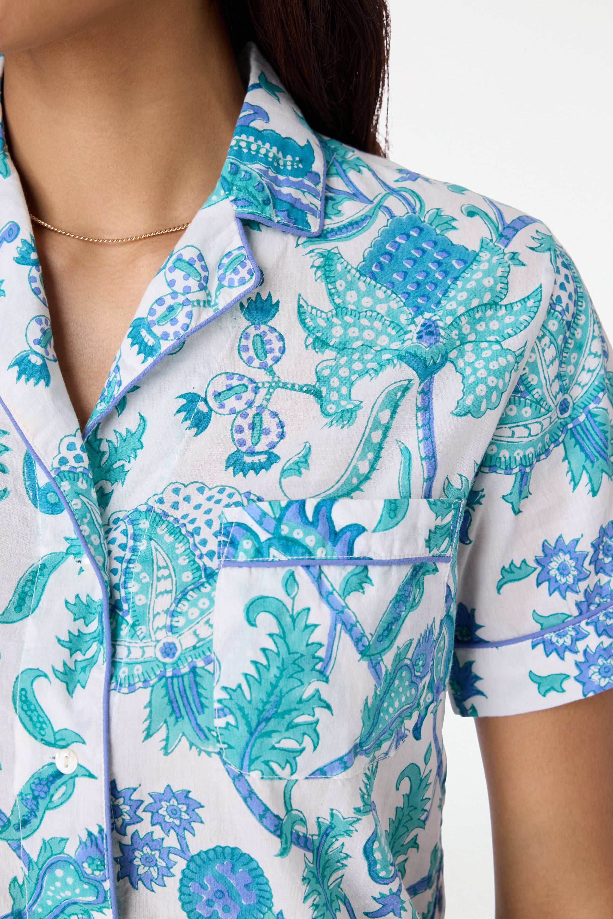 Laidback weekends and the Amanda Lulu Set go together like avocado and toast. This adorable cotton short set in a bright turquoise floral print includes shorts with split sides and a classic short-sleeve button-up top with a front pocket.