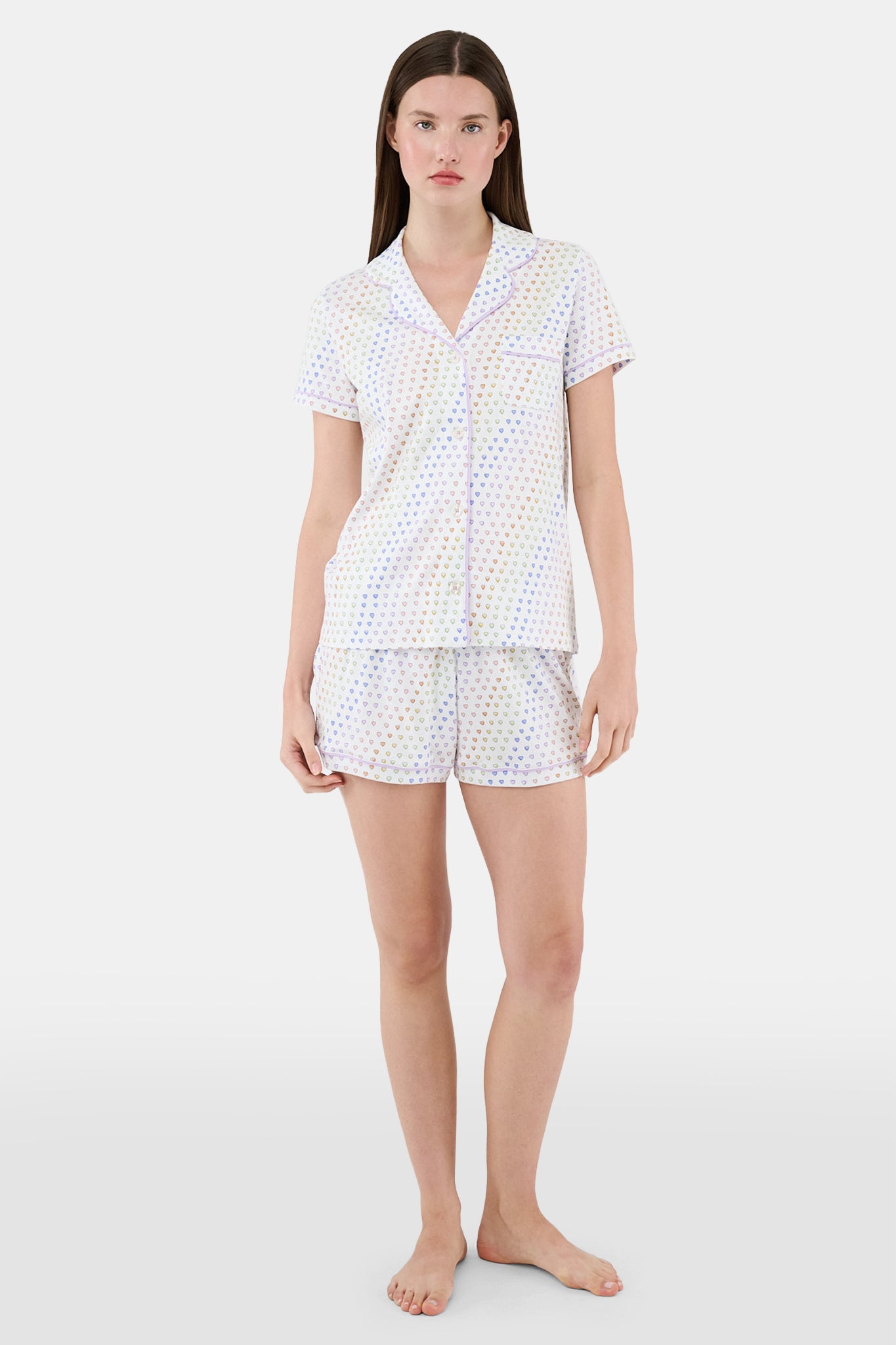 Spread some love while getting cozy in our Disco Hearts Pajama Set that features a mood-boosting print of rainbow-hued hearts. This set includes elastic shorts and a matching polo top. The soft cotton fabric ensures breathable comfort all through the night.