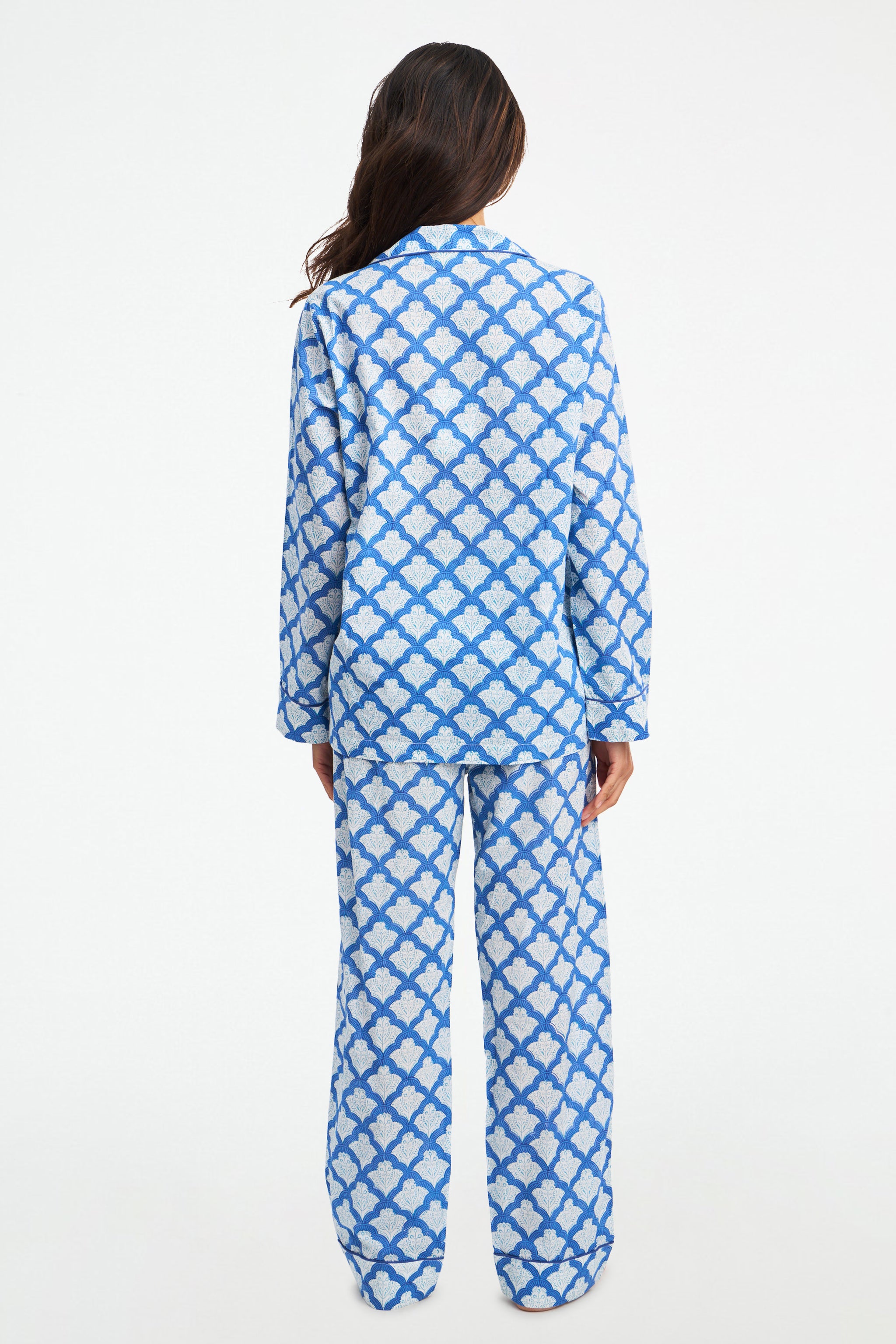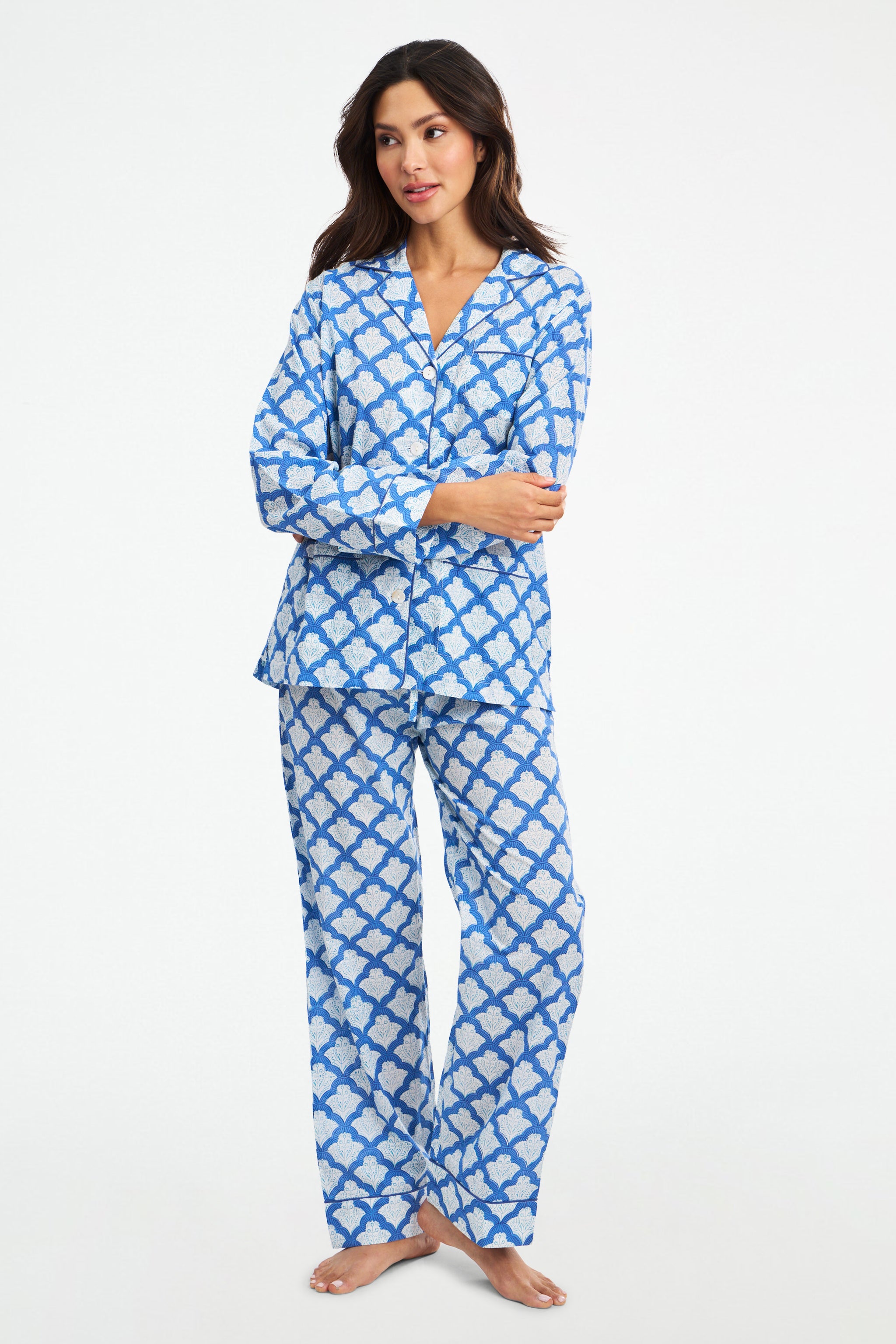 Our classic medallion-style Jemina print gets a fresh look in your fan-favorite red and blue colorway. This loungewear set includes a long-sleeve button-up top and matching pants, each crafted with cotton silk and beautiful pipping. Online only!