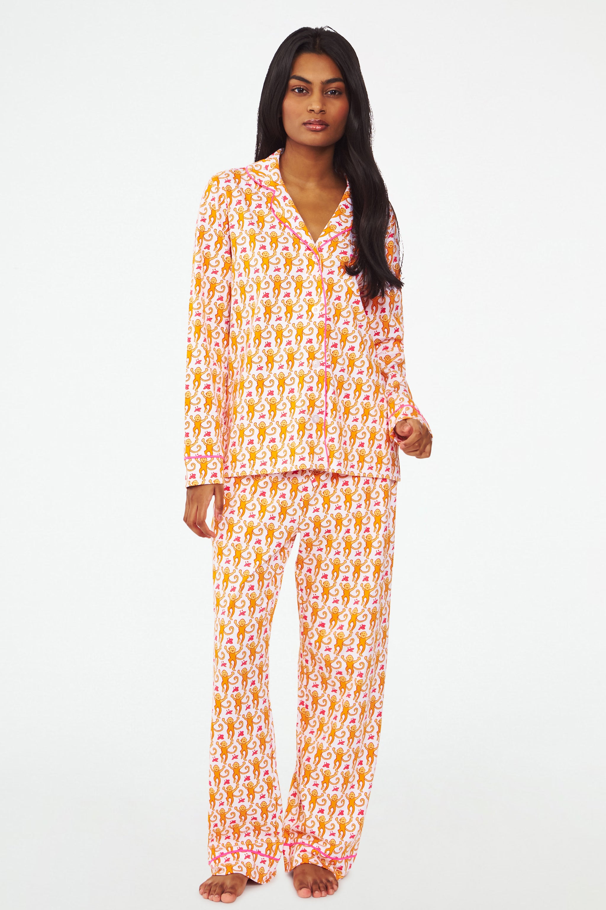 Give yourself permission to monkey around at bedtime in these comfy PJs that feature our playful monkey print in bright colorways. This pajama set includes a long-sleeve polo top and matching bottoms.