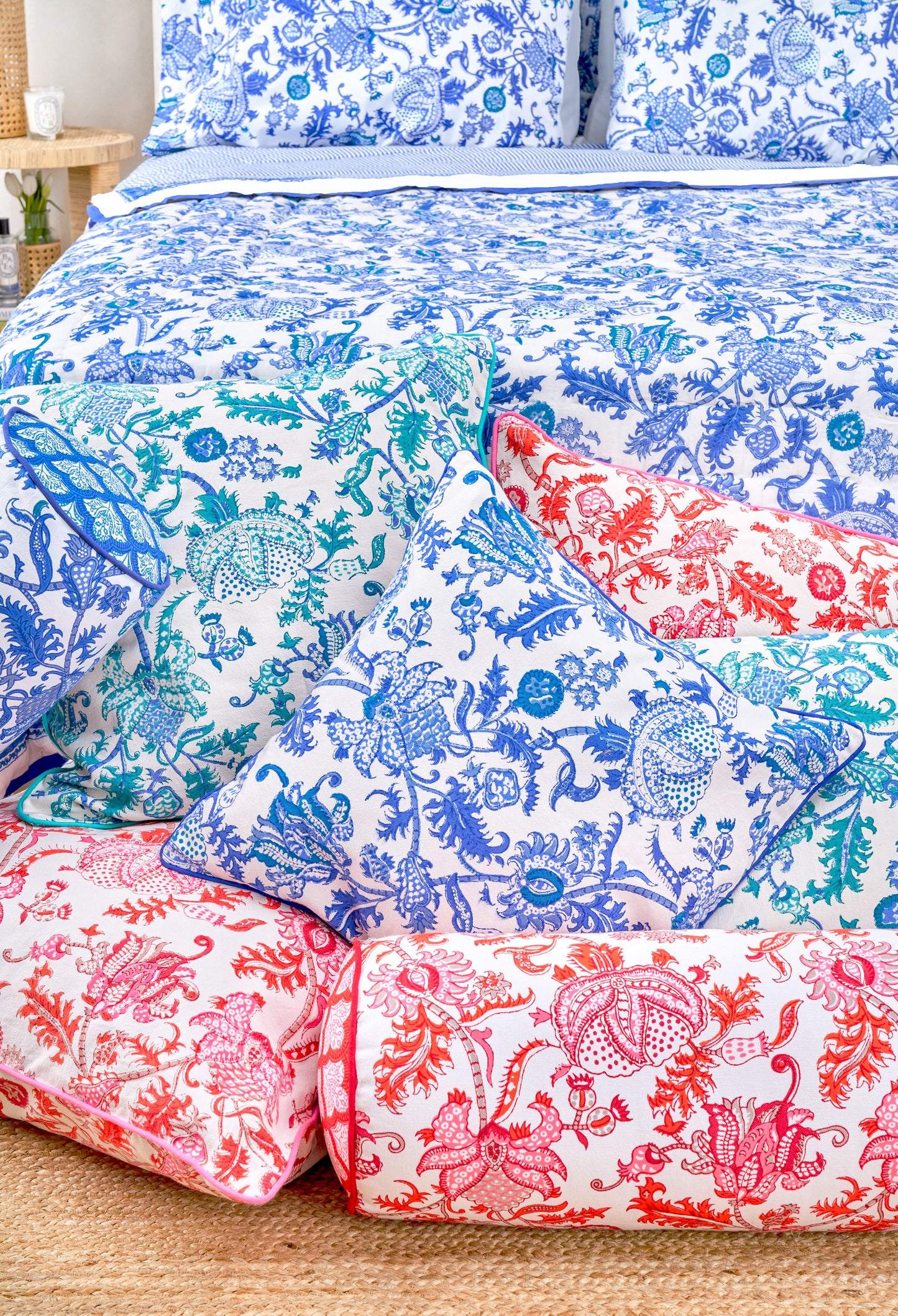 Want to add that extra special touch to a room? Look no further than our Amanda Decorative Pillow Cover. This pillow cover has our hand-blocked Amanda print throughout, is finished with contrast piping, and has a zip closure along the bottom.