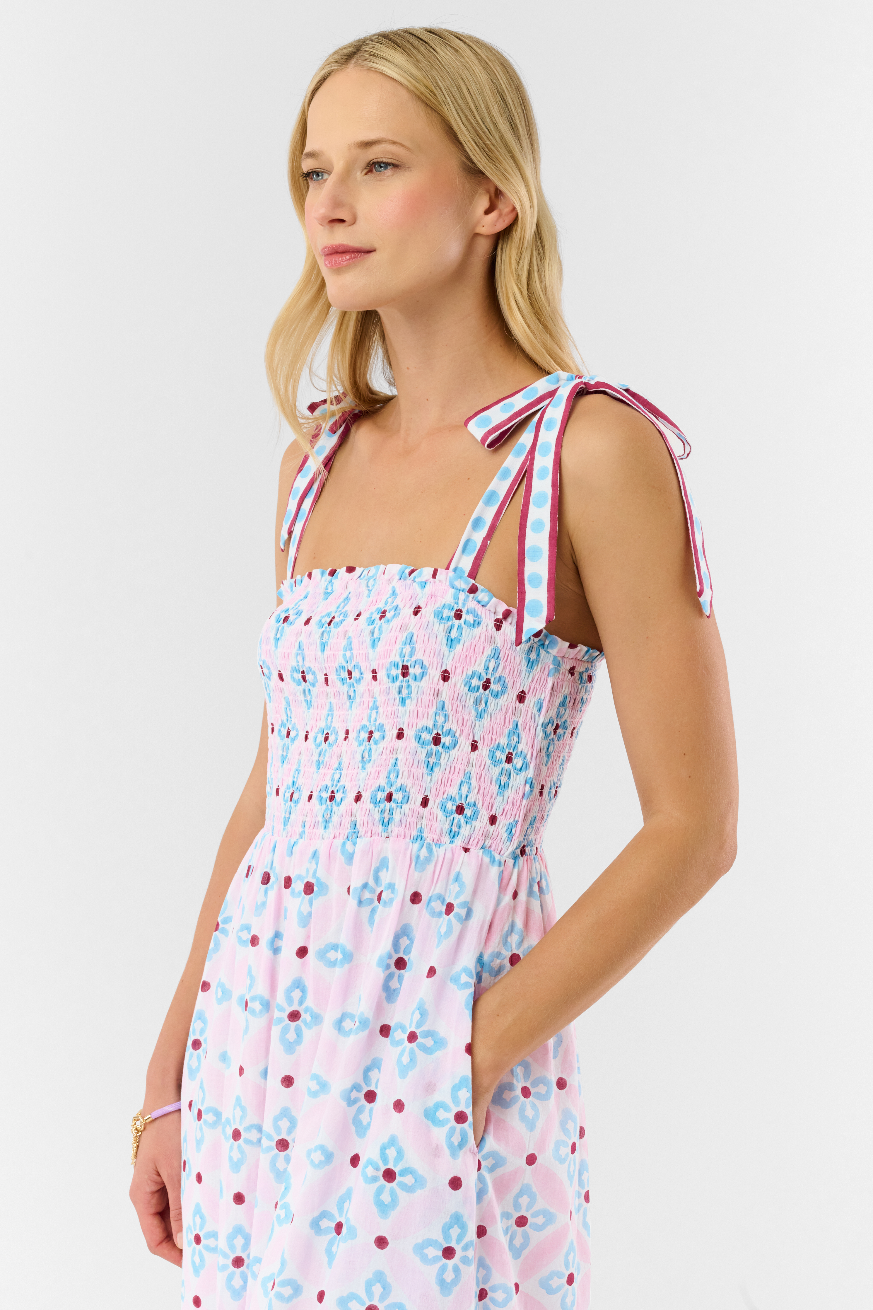 With its graceful silhouette and easy, dreamy fit, the Georgina Dress will be your new go-to for all your spring events. This cotton voile maxi has a smocked bodice, adjustable ribbon straps, and the prettiest pink and blue Lerato print.