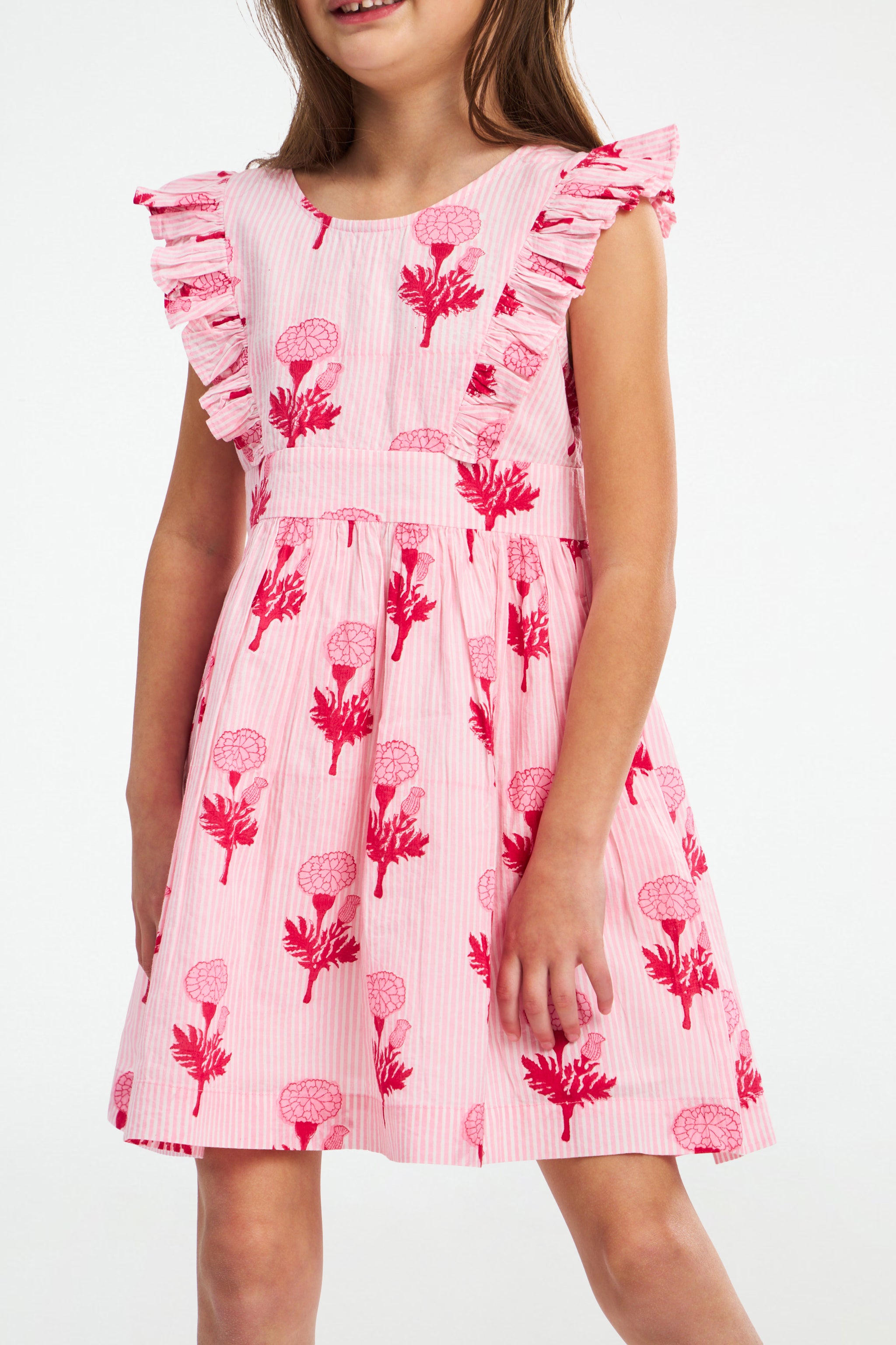 Pretty in pink! If you're planning family pics or heading to a wedding, dress your mini in our beyond adorable Kids Harumi Dress, a pale pink cotton voile sundress with a floral block print. The pinafore-style dress feels dressed-up but never fussy.