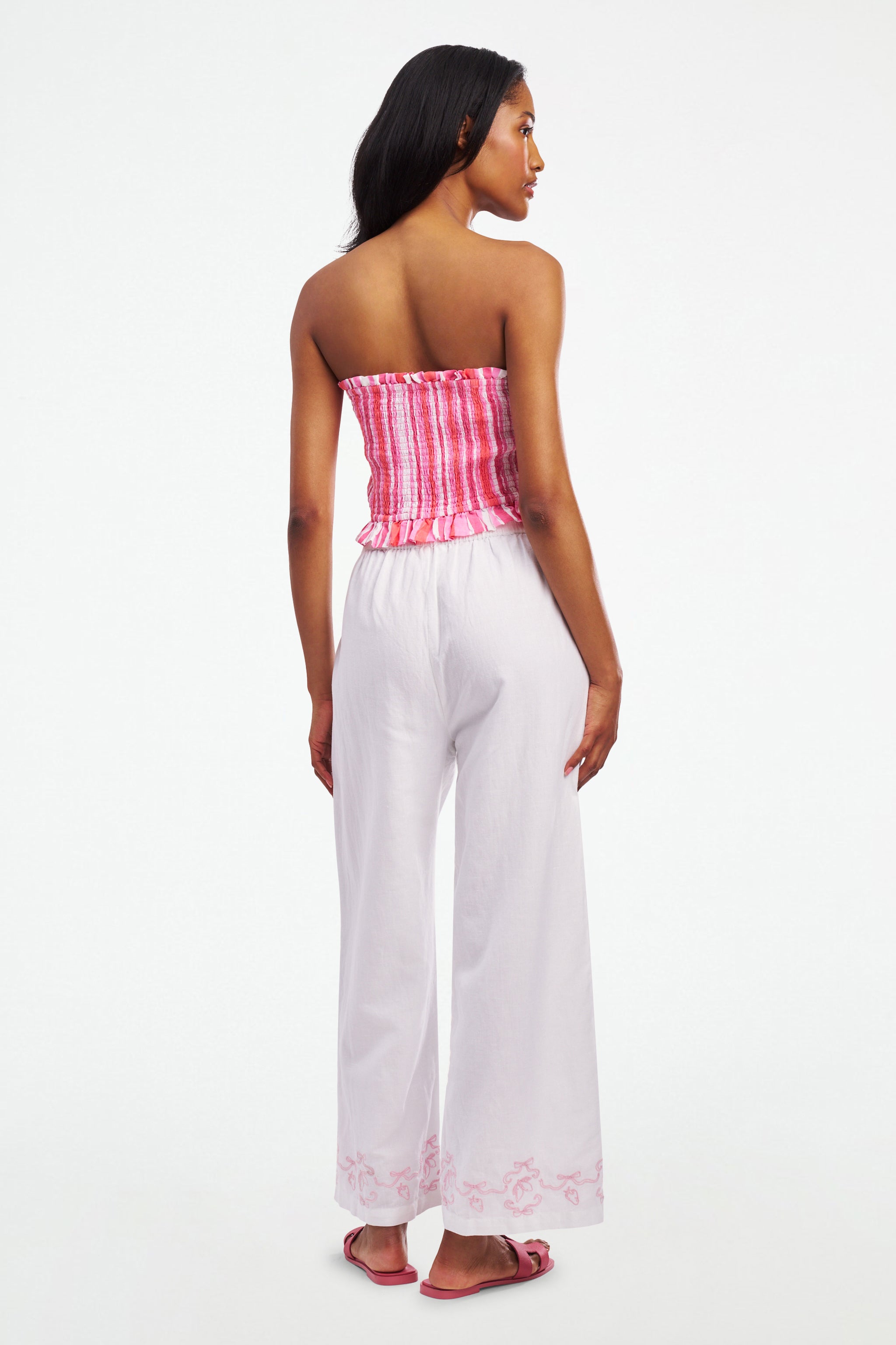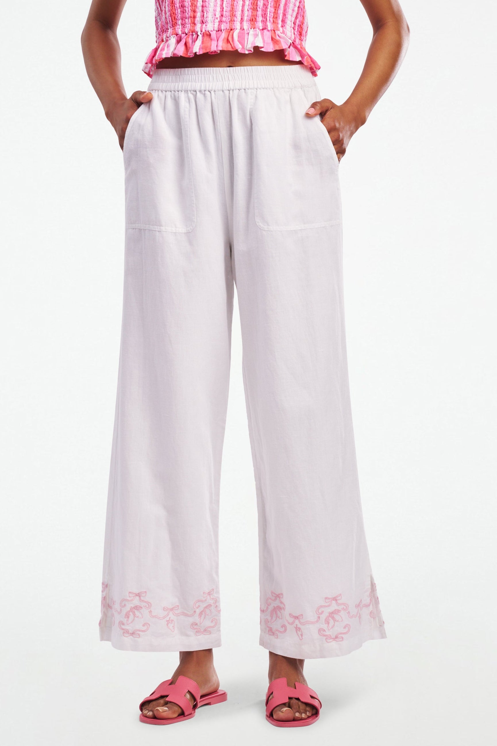 So crisp, so clean, so chic. Our iconic Chloe Pant, a elastic-waisted cotton linen trouser with a wide-leg silhouette, gets an update featuring delicate, whimsical pink embroidery at the hem.