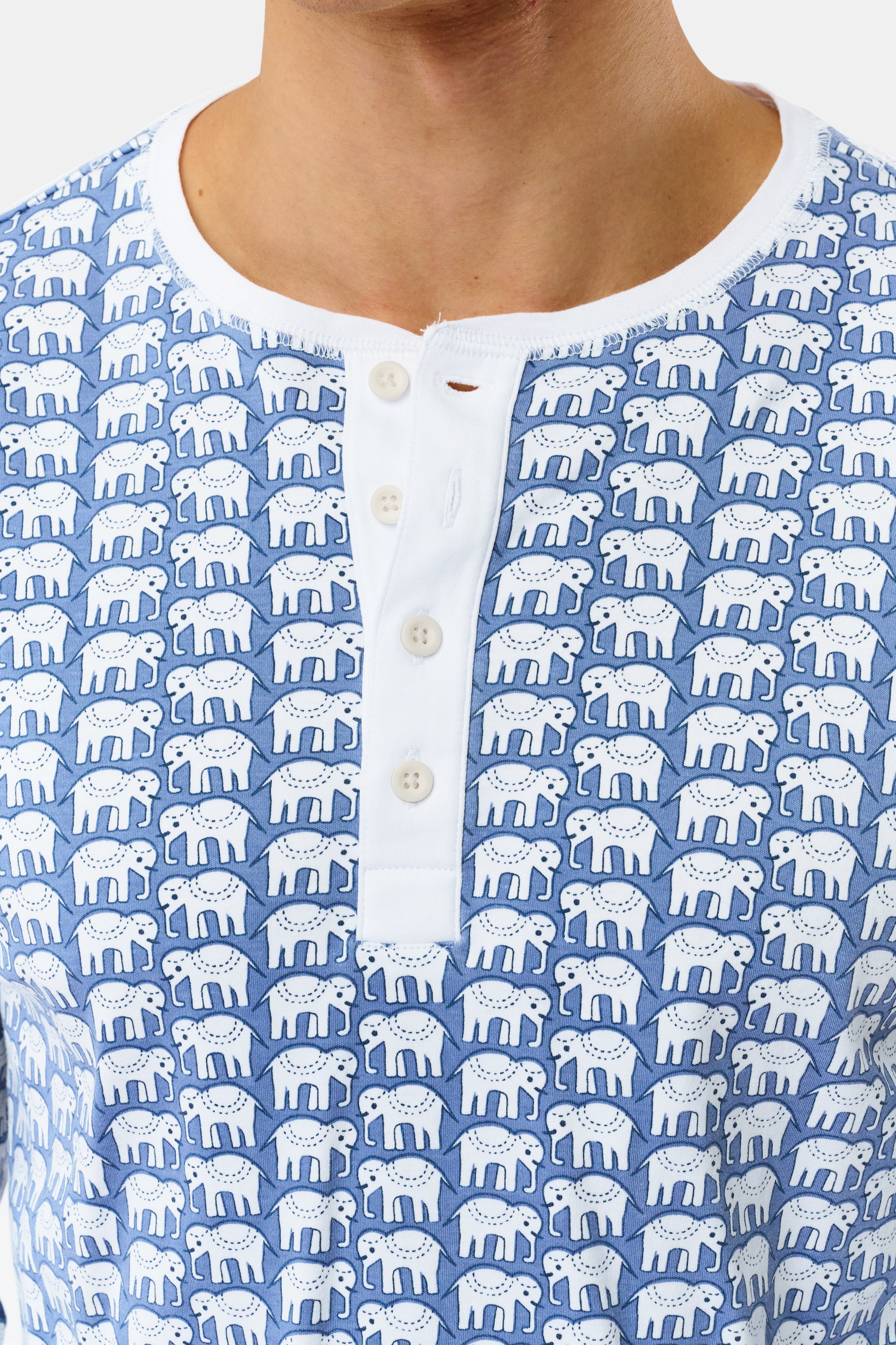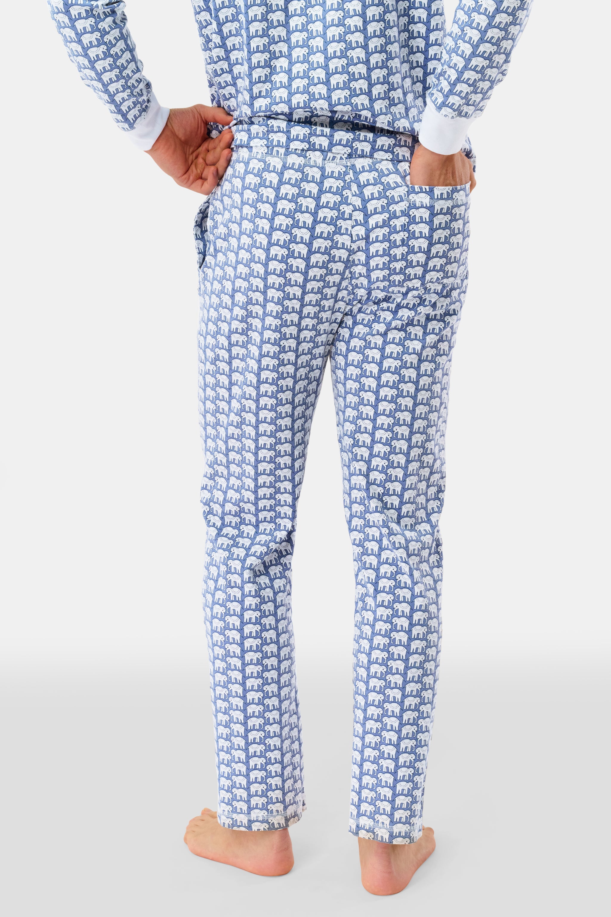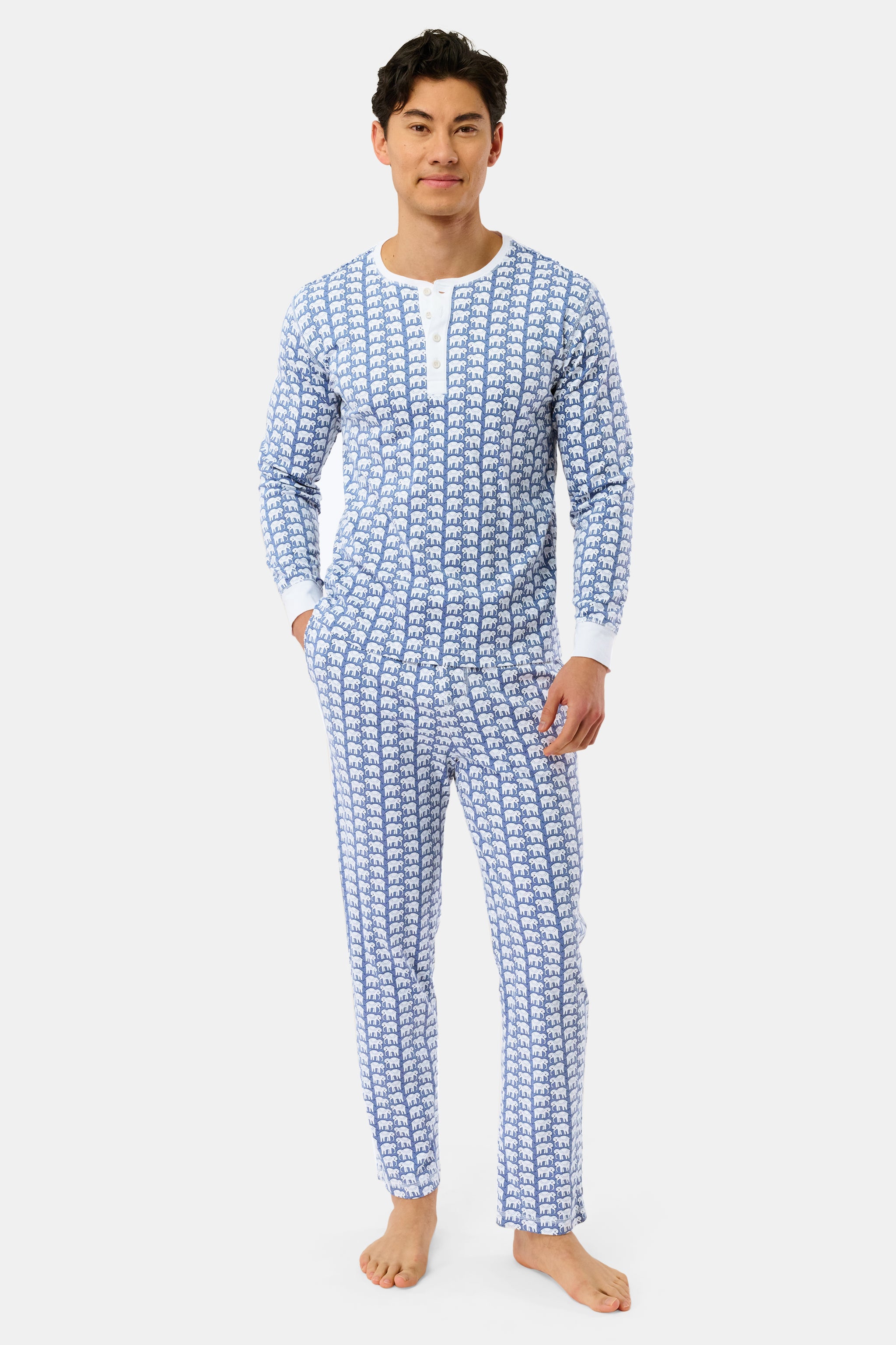 The whole family can partake in the pajama party fun thanks to our Men's Hathi Spencer Pajamas. Crafted with 100% premium cotton, this pajama set includes a solid long-sleeve top with a button placket and drawstring pants embellished with the original Hathi elephant print, featuring a soft color twist.
