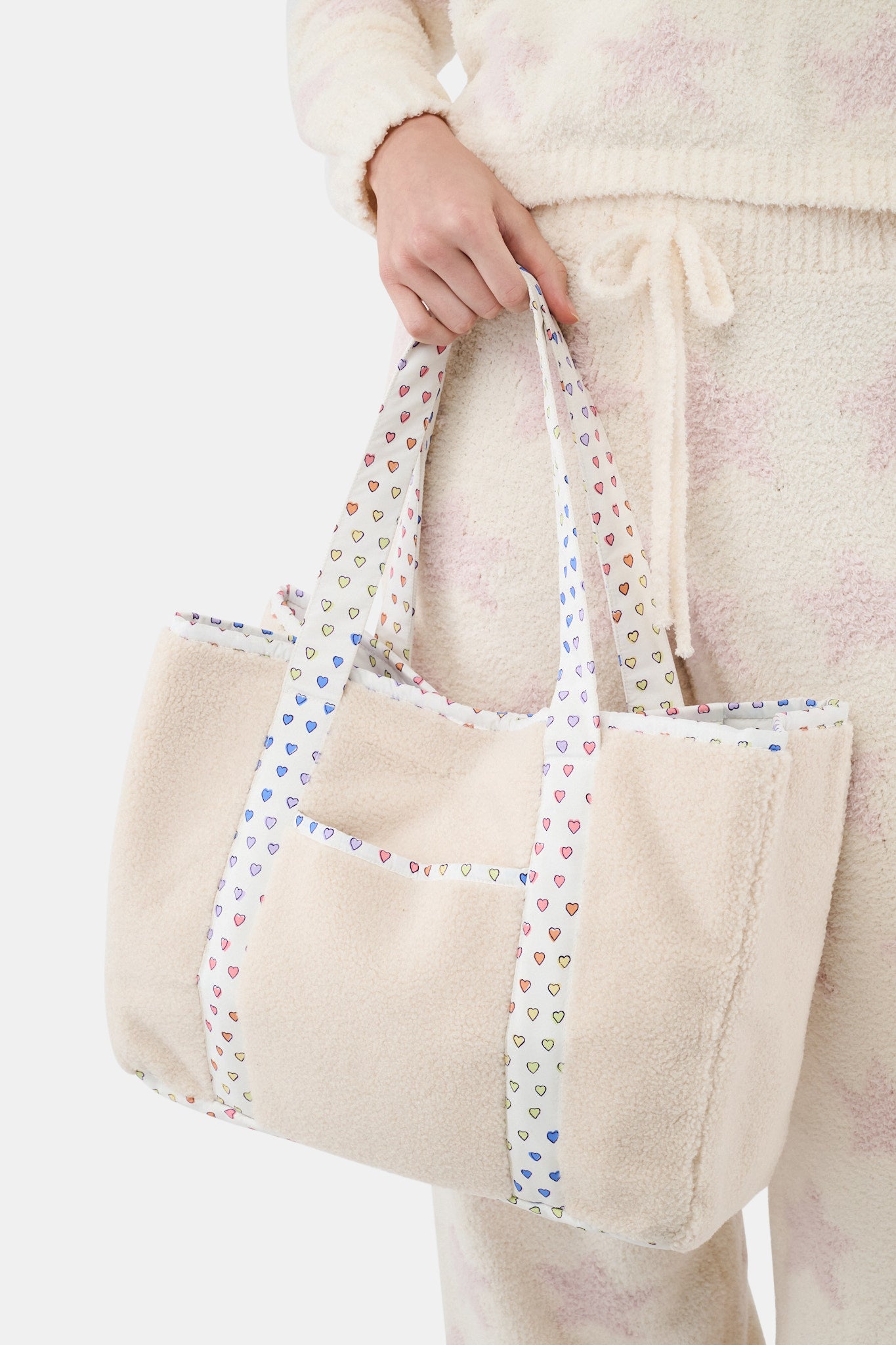 So cozy, so cute, so convenient. Our classic tote gets a wintry makeover in snuggly sherpa trimmed in our classic disco hearts print. Use it as a work bag, diaper bag or weekender!