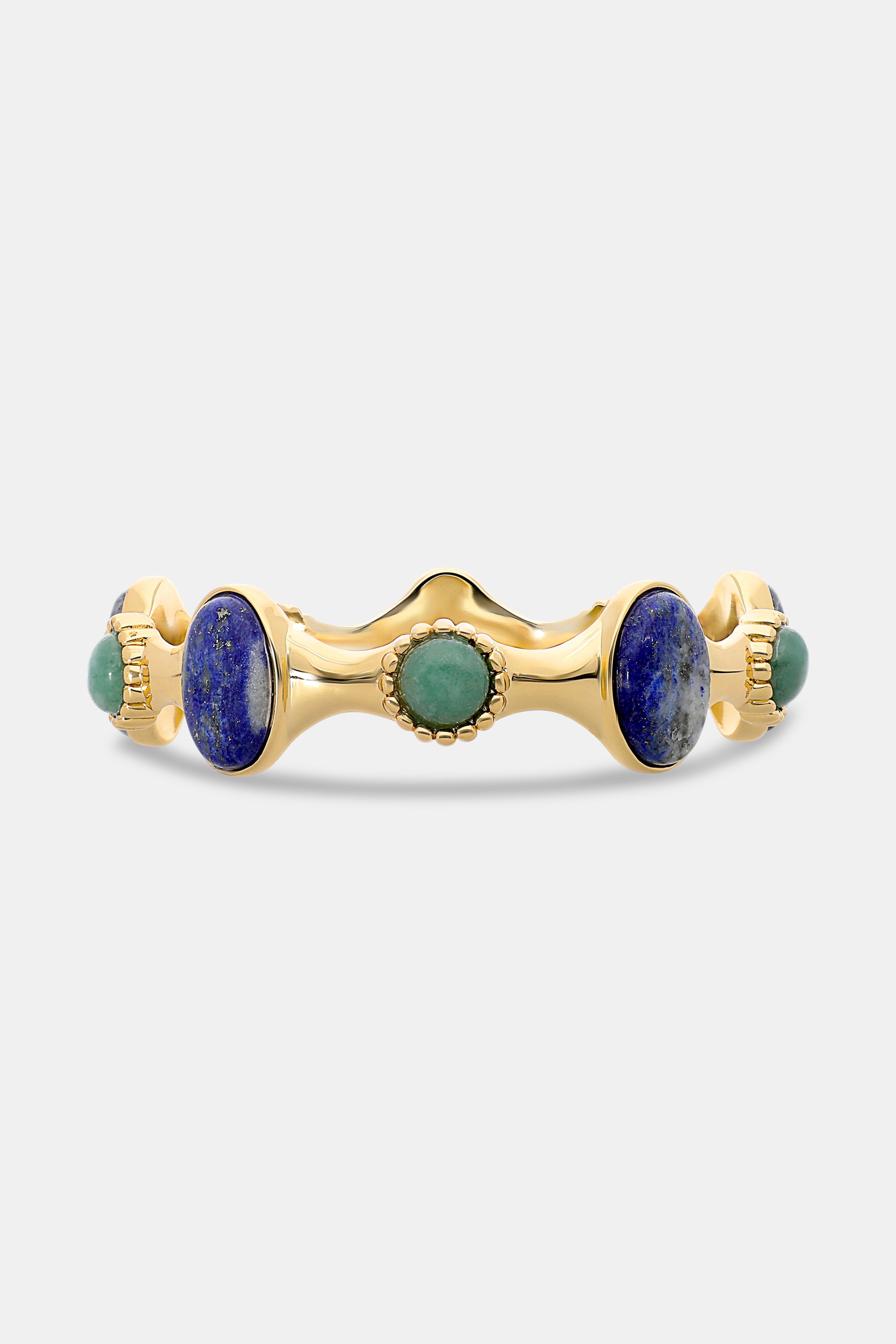 Get bejeweled in a chunky gold bangle set with oversized green and blue stones.