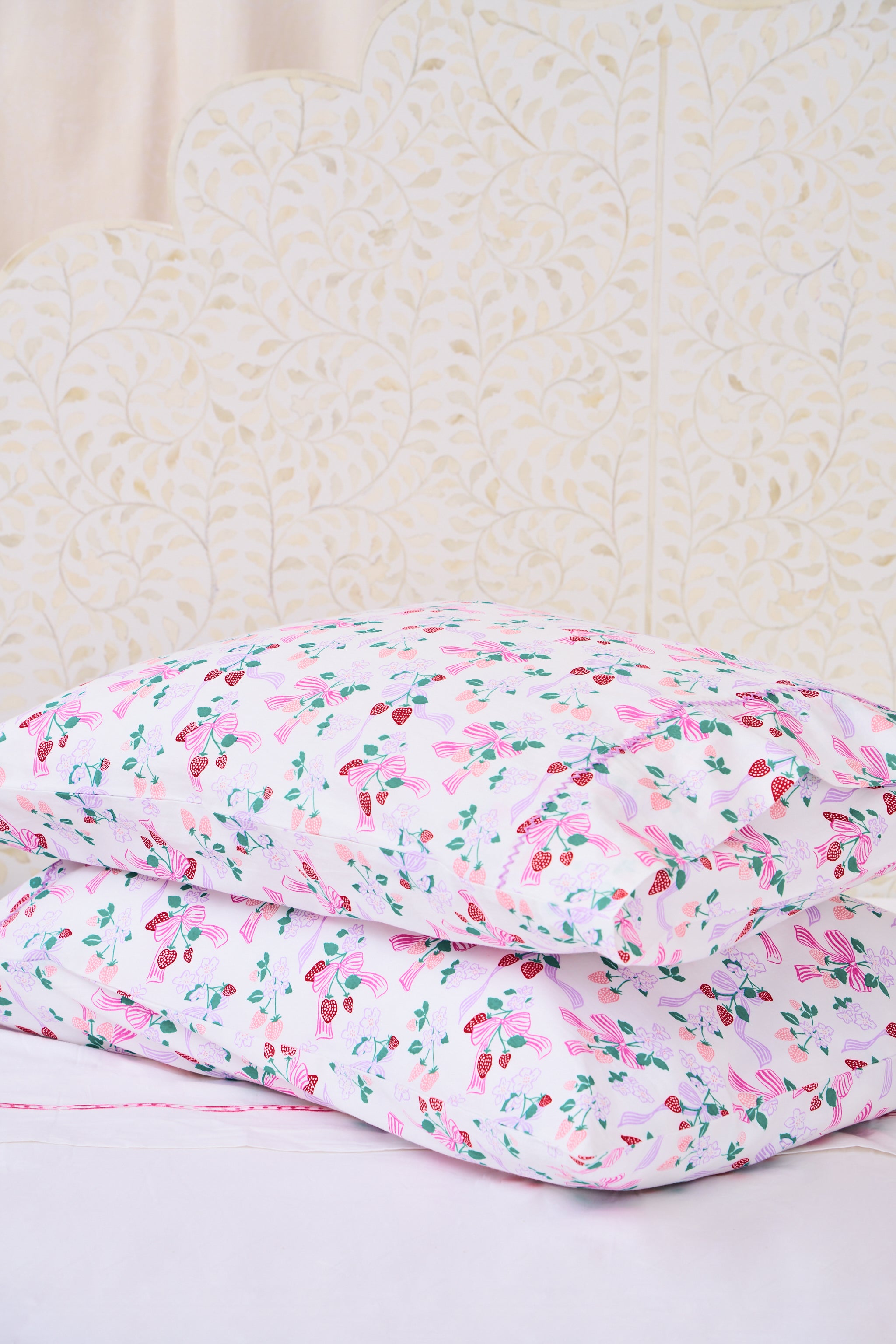 Elevate your beauty sleep with soft, 300-thread-count cotton pillowcases in a whimsical strawberry print.