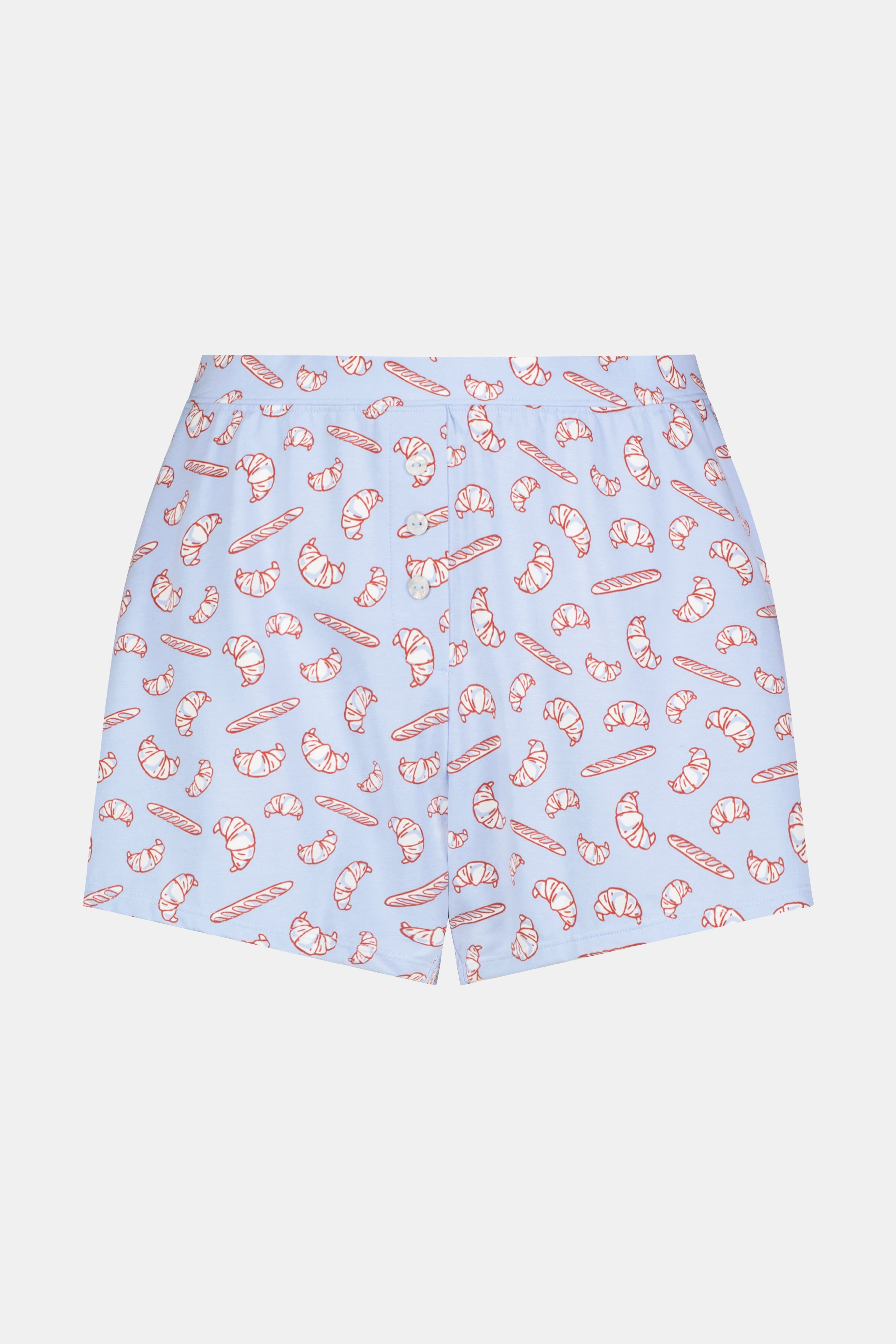 Your weekend bagel ritual just got so much cuter. Lounge around in these baby blue cotton boxer-style shorts dotted with a baguette and croissant print by Lilly Sisto.