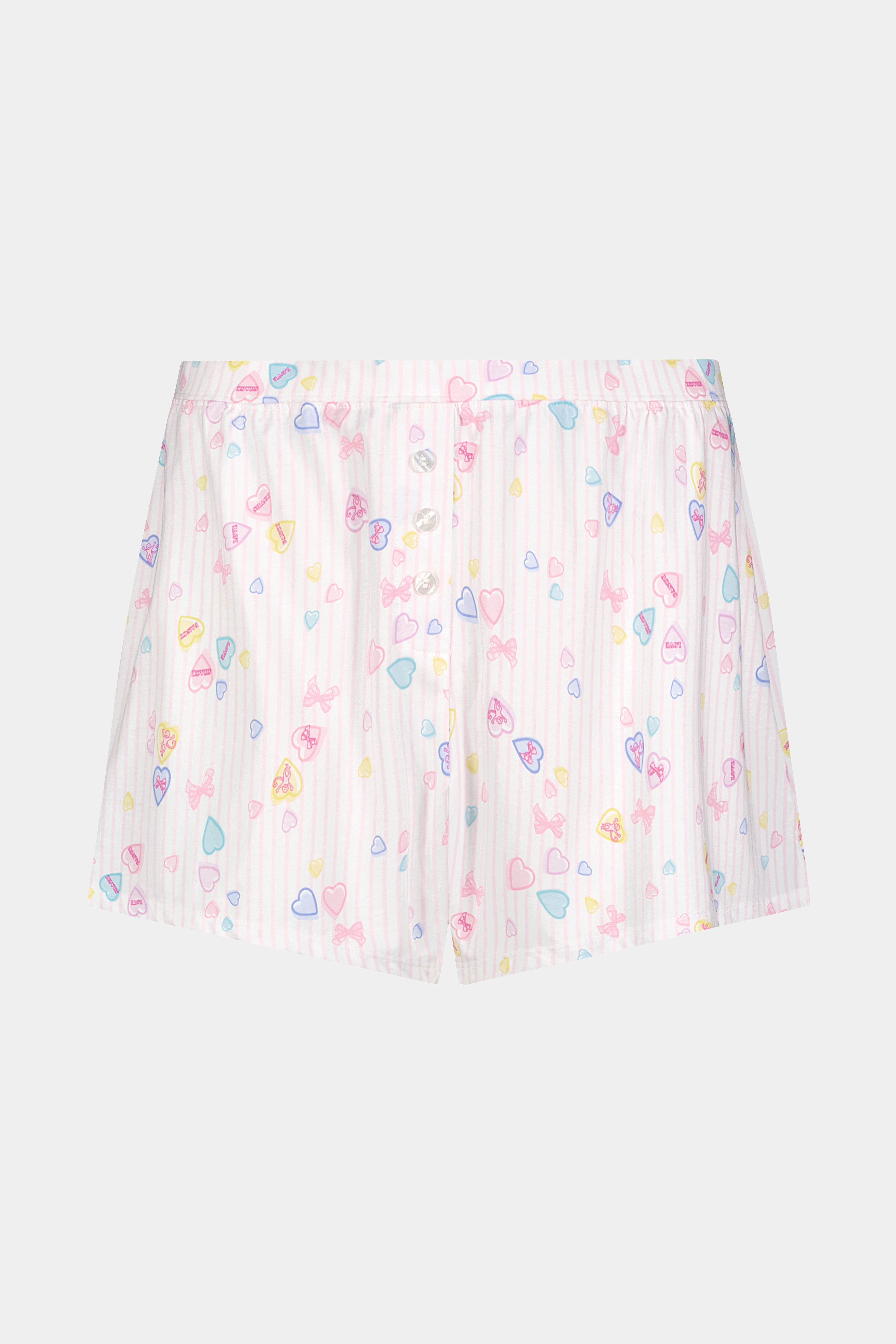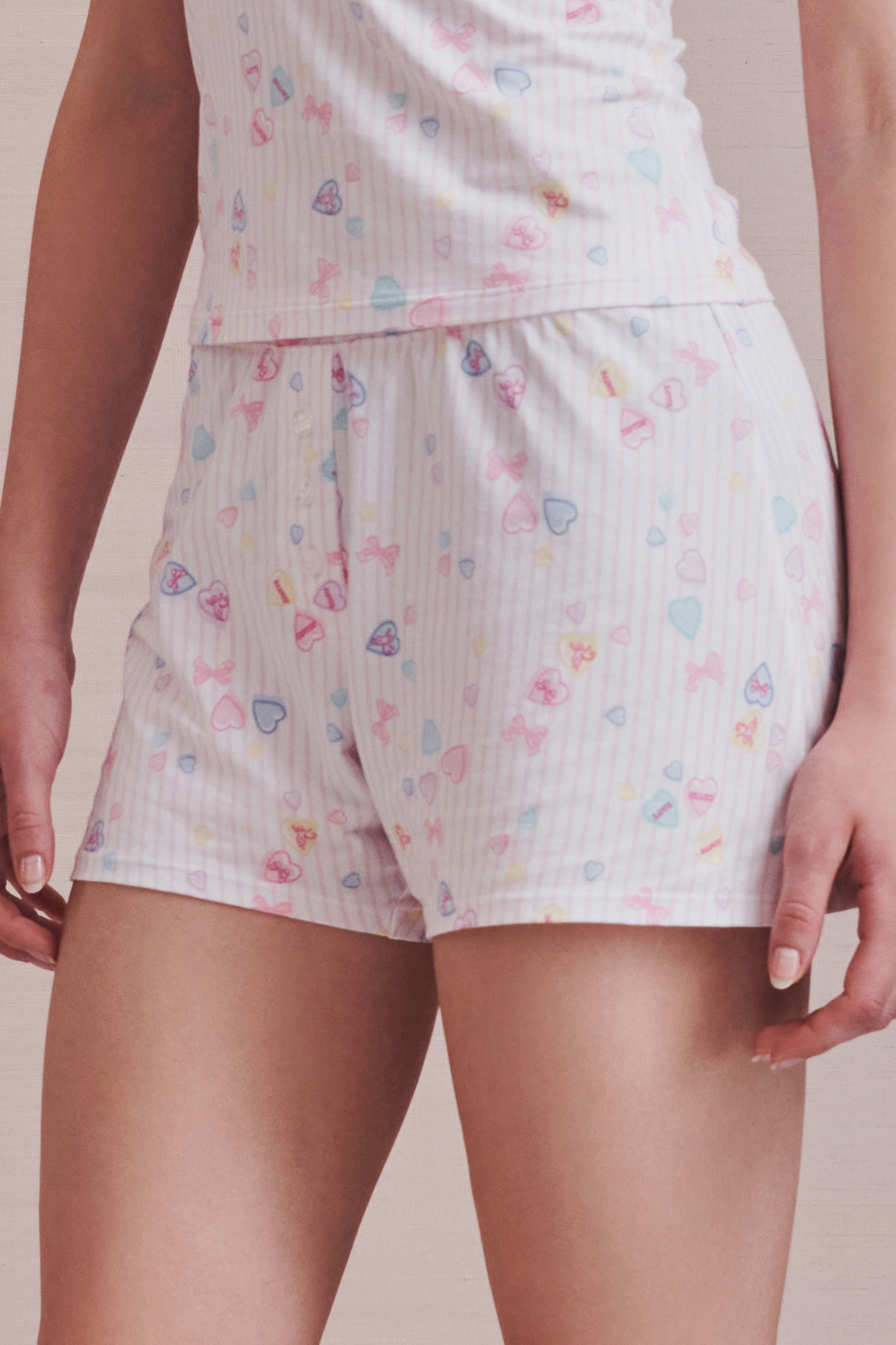 Boxers gone girly! Our Jones Shortie is a borrowed-from-the-boys style with a feminine fit and precious pastel Candy Hearts Stripe print, designed in collaboration with LoveShackFancy. Add the matching Perry Cami for a flirty loungewear moment.