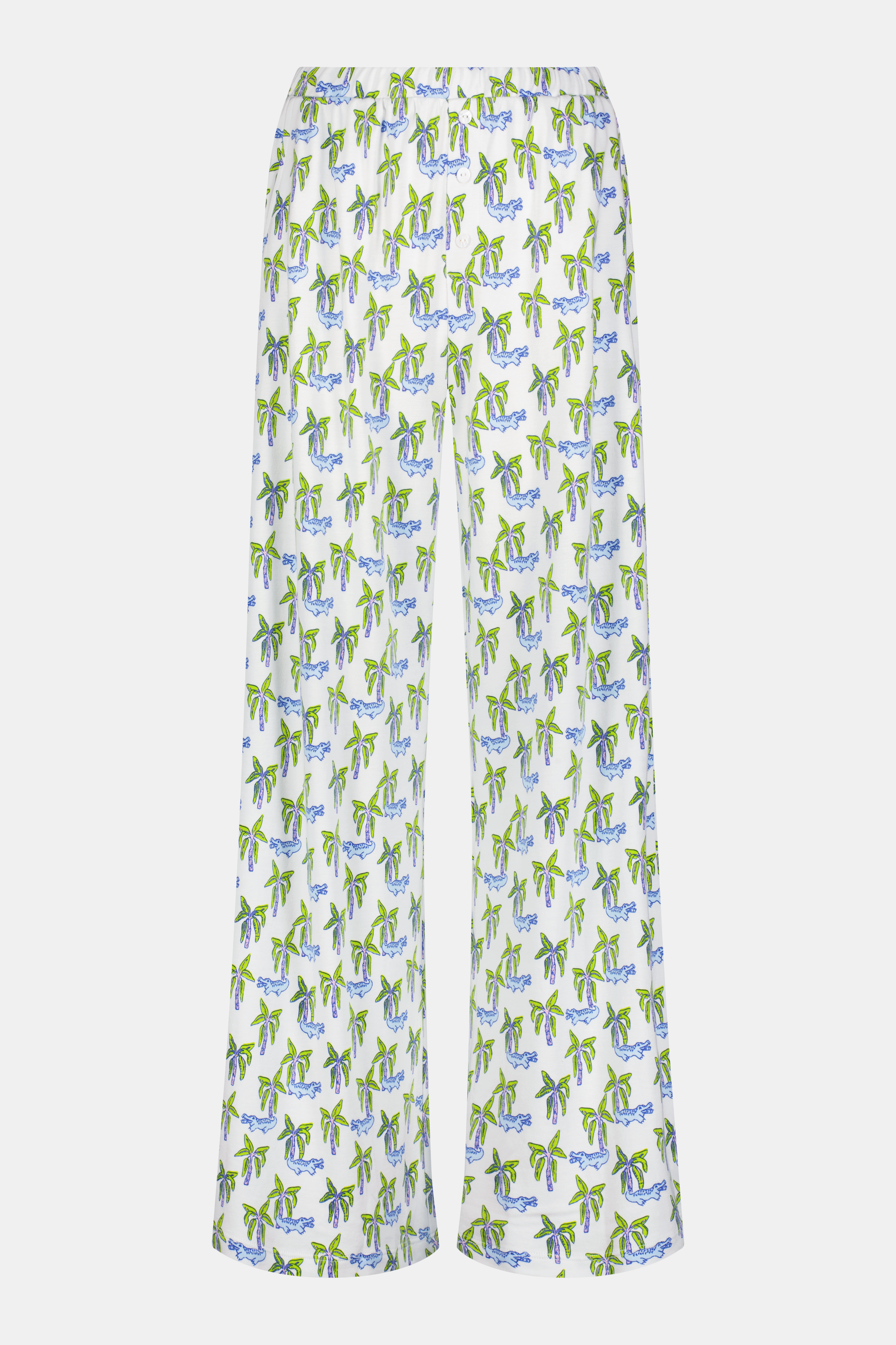 Pretend you're relaxing on the Florida sand, a cold drink in your hand and a pair of comfy pants layered over your bikini. Then make that fantasy a reality in our Boden Pant, a laid-back wide-leg style in silky soft Pima modal with a palm and gator print by Lilly Sisto.