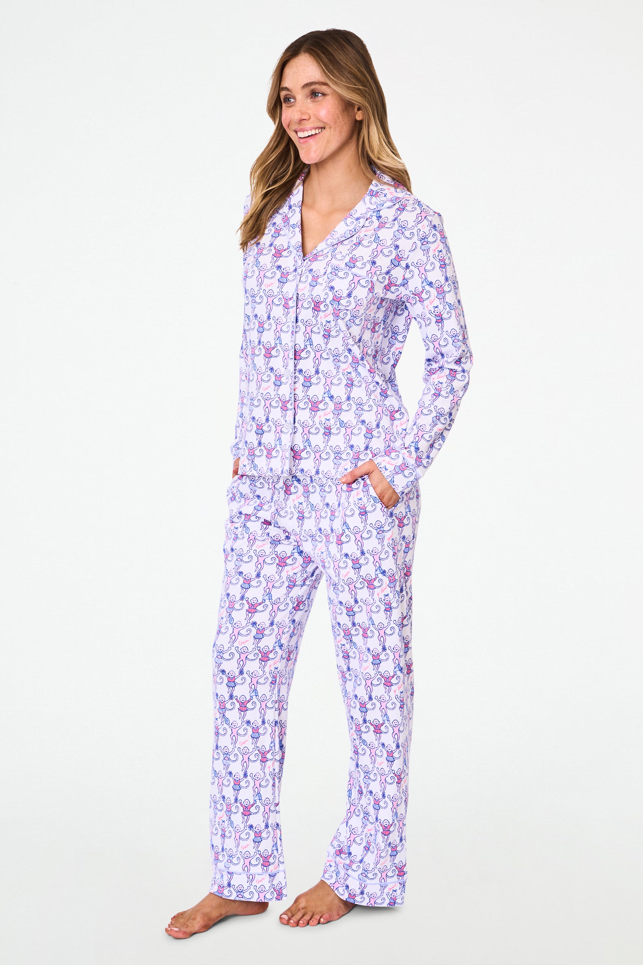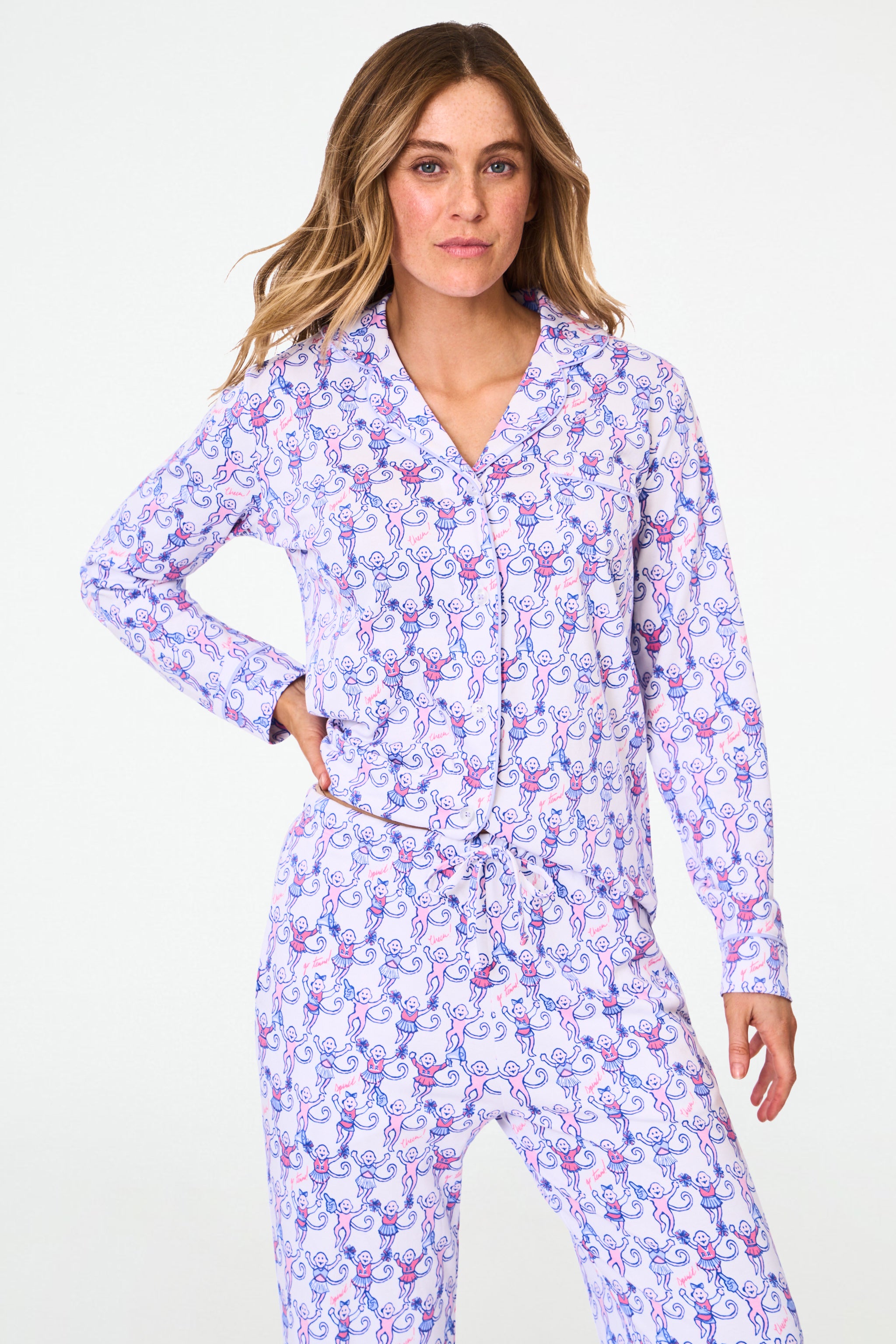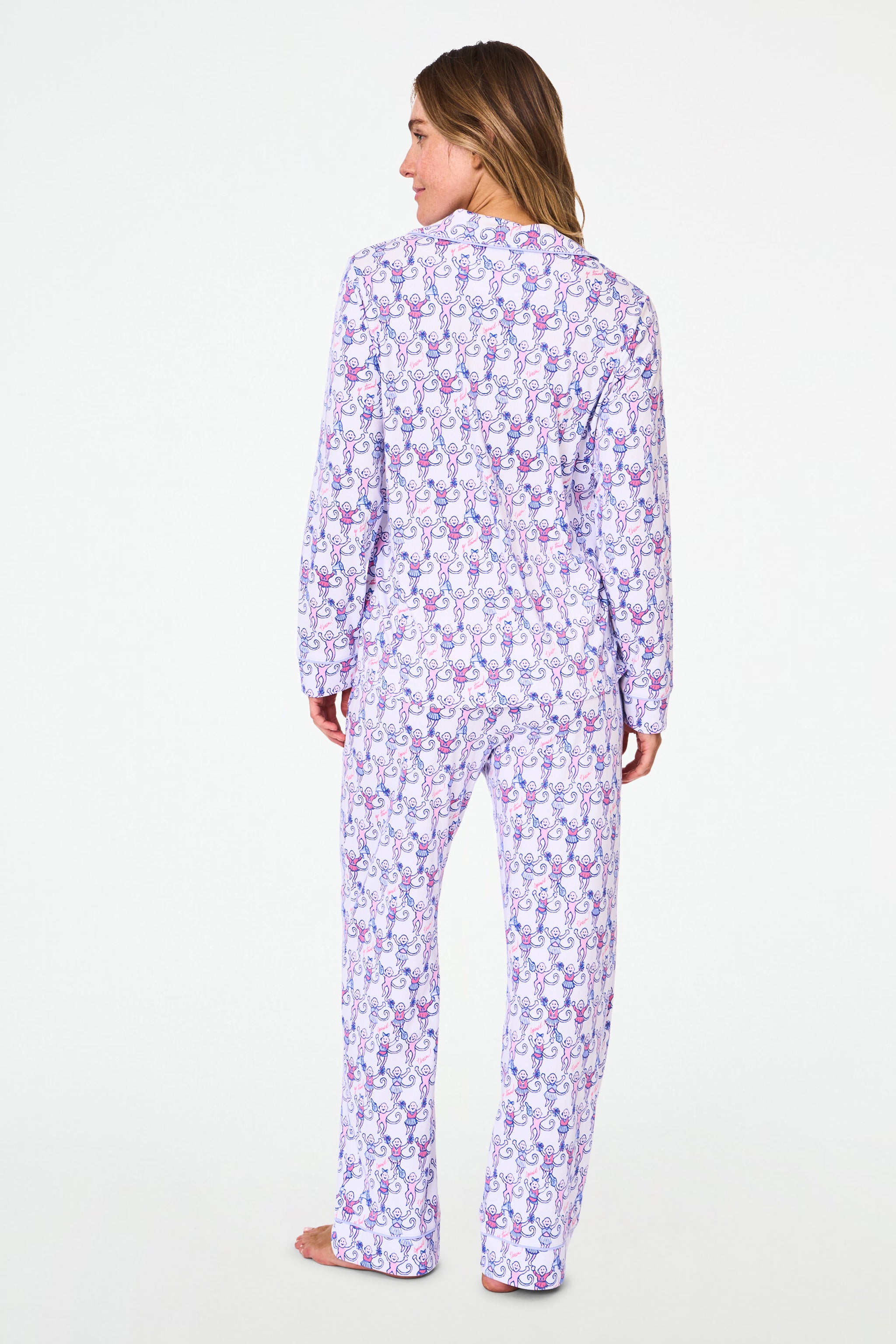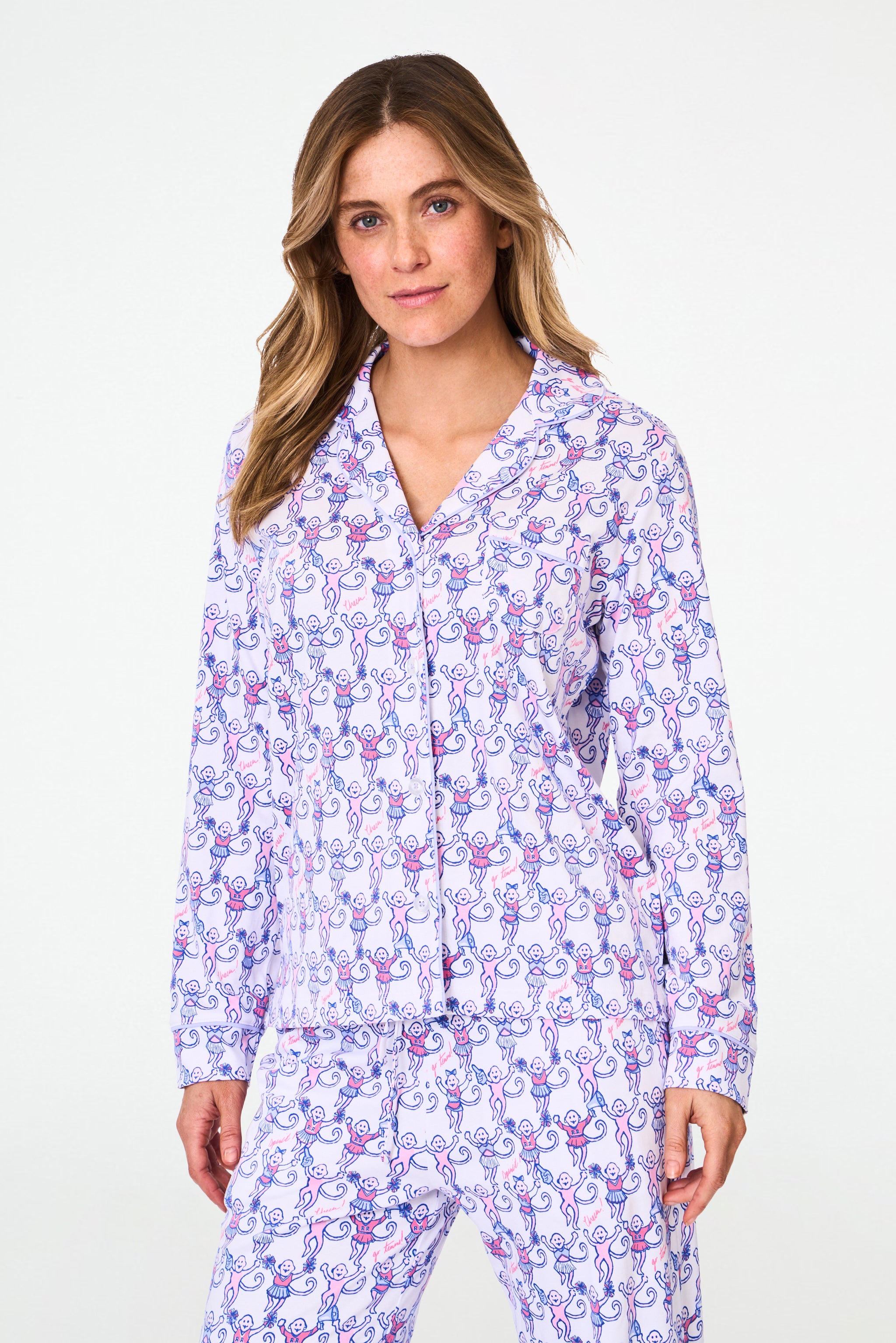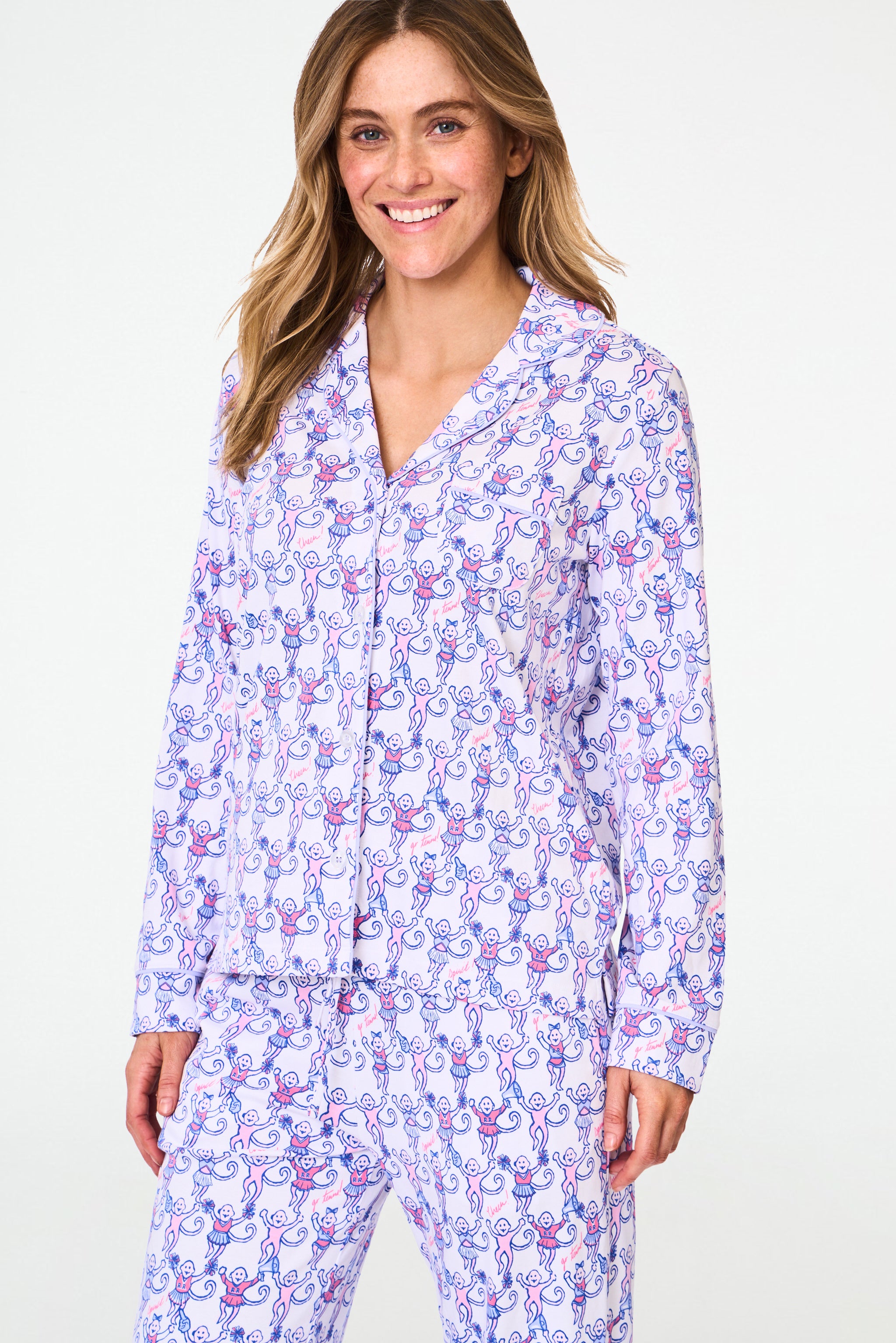 So berry cheerful! The Women's Long Sleeve Polo Pajama is a traditional long-sleeved PJ set with a button front top and long pants, covered in a cheeky Cheer Monkey print. The dreamy Pima cotton is made for all-day relaxing, watching the game on the couch, or hitting the snooze just a little bit longer.