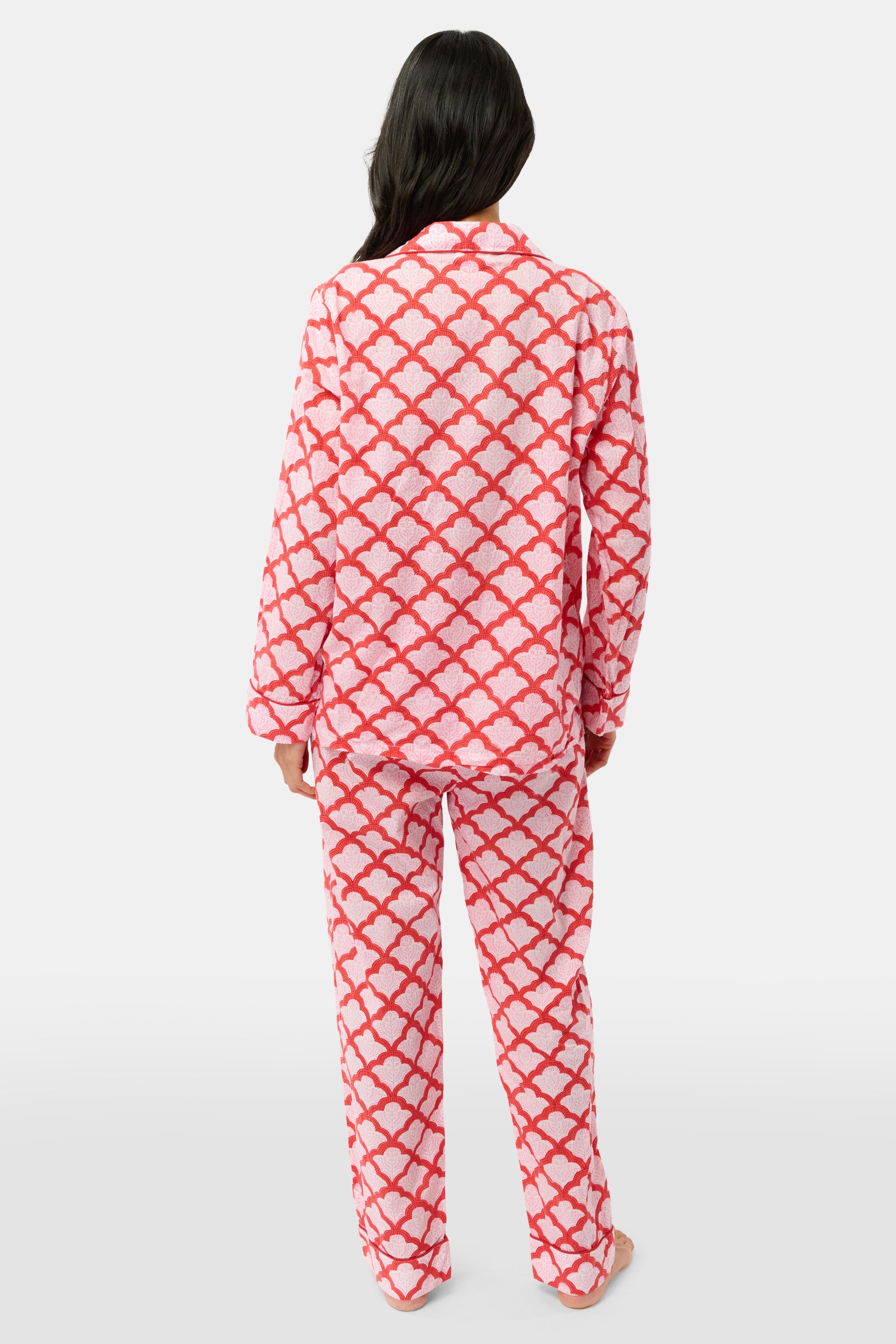 Our classic medallion-style Jemina print gets a fresh look in your fan-favorite red and blue colorway. This loungewear set includes a long-sleeve button-up top and matching pants, each crafted with cotton silk and beautiful pipping. Online only!