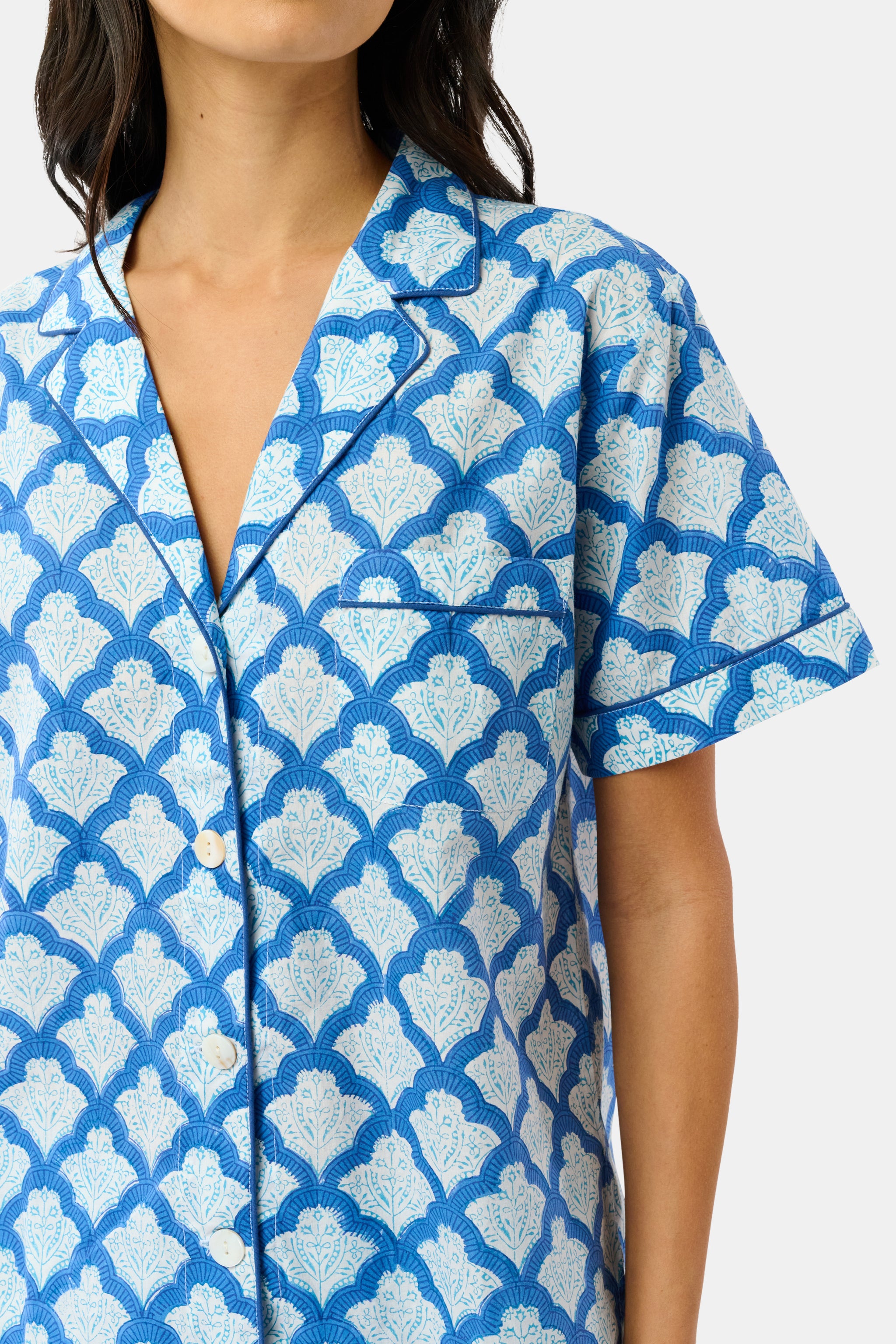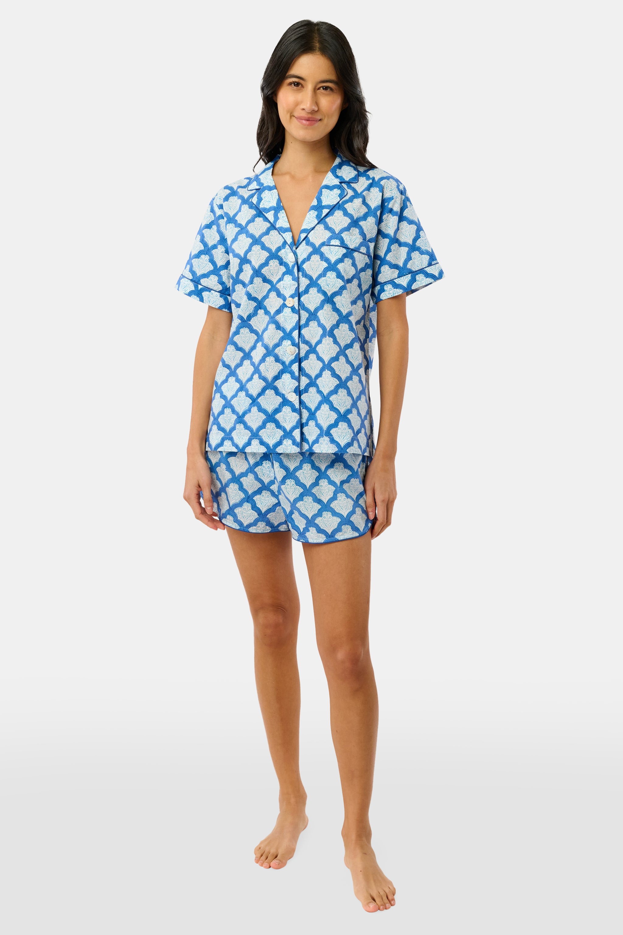 Laidback weekends and the Jemina Lulu Set go together like avocado and toast. This adorable cotton short set in the stunning Jemina blue print includes classic PJ shorts and a short-sleeve button-up top with a functional front pocket.