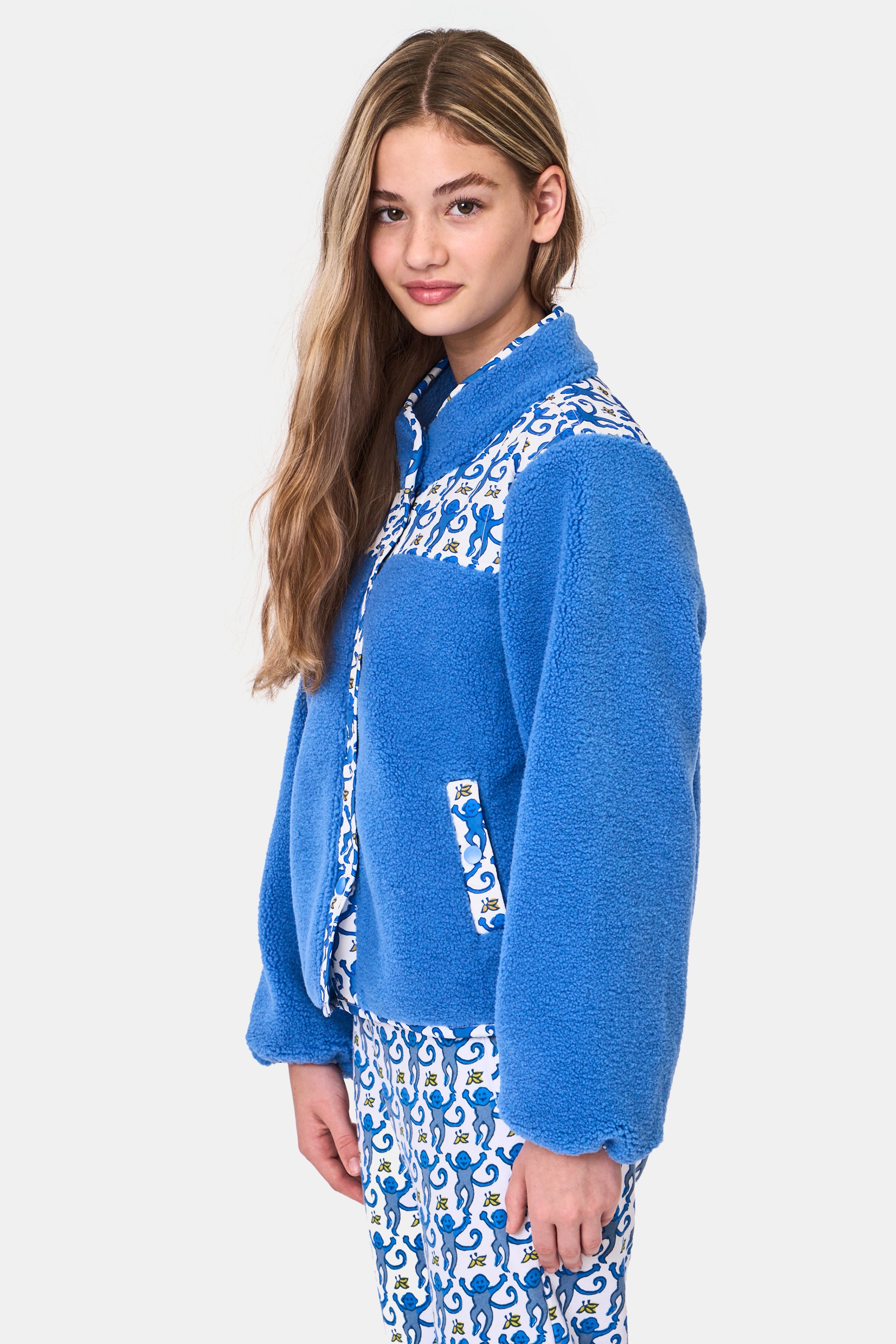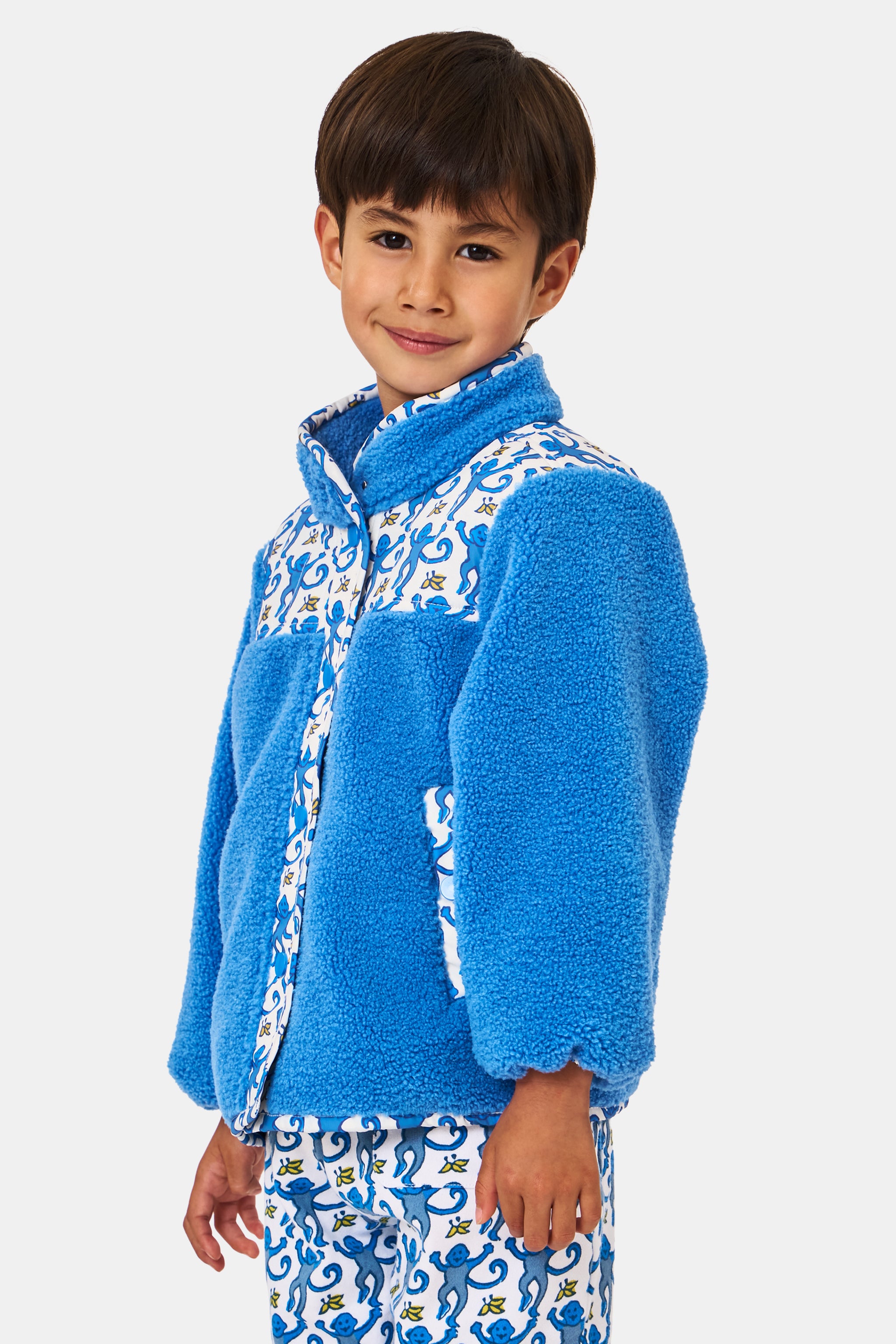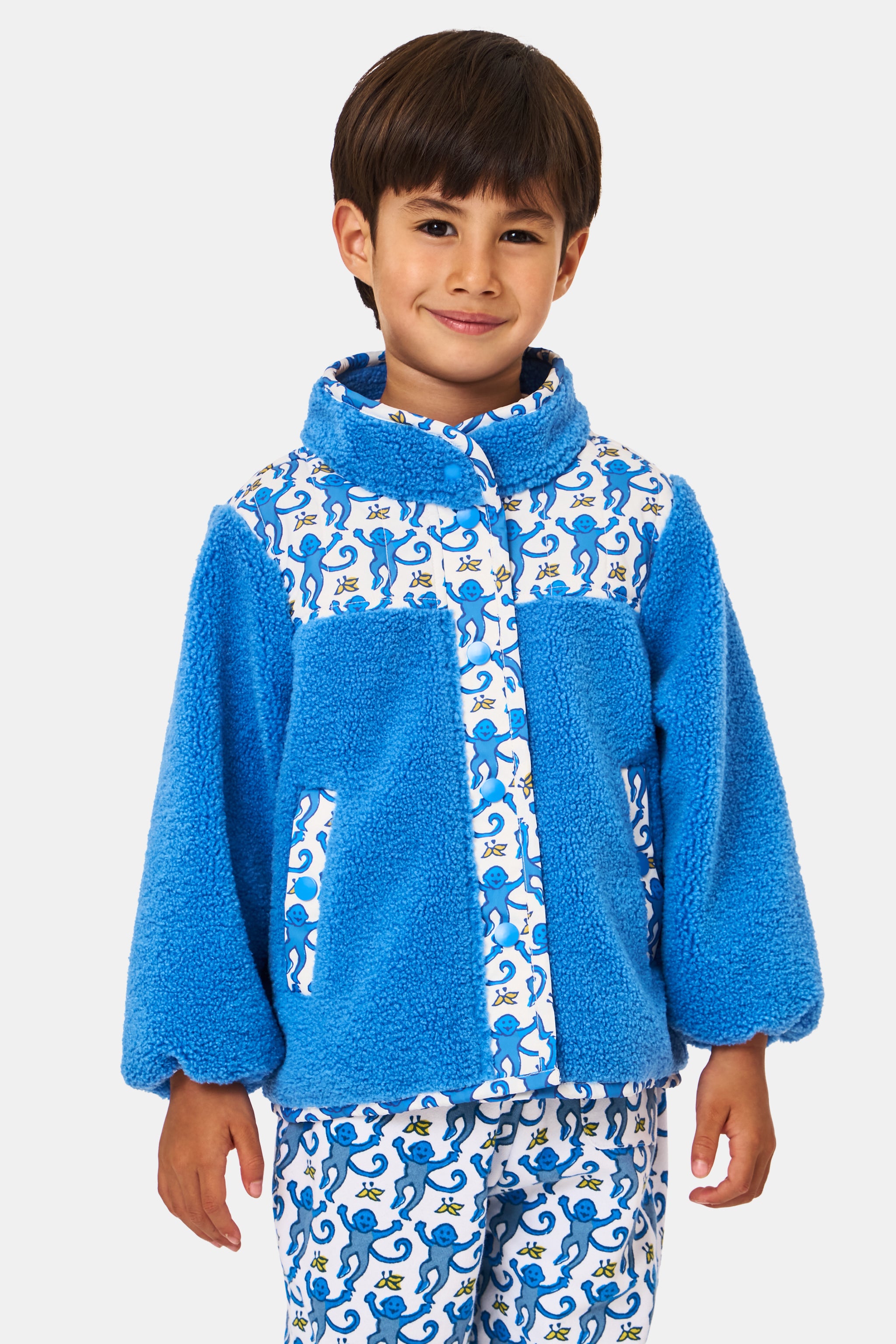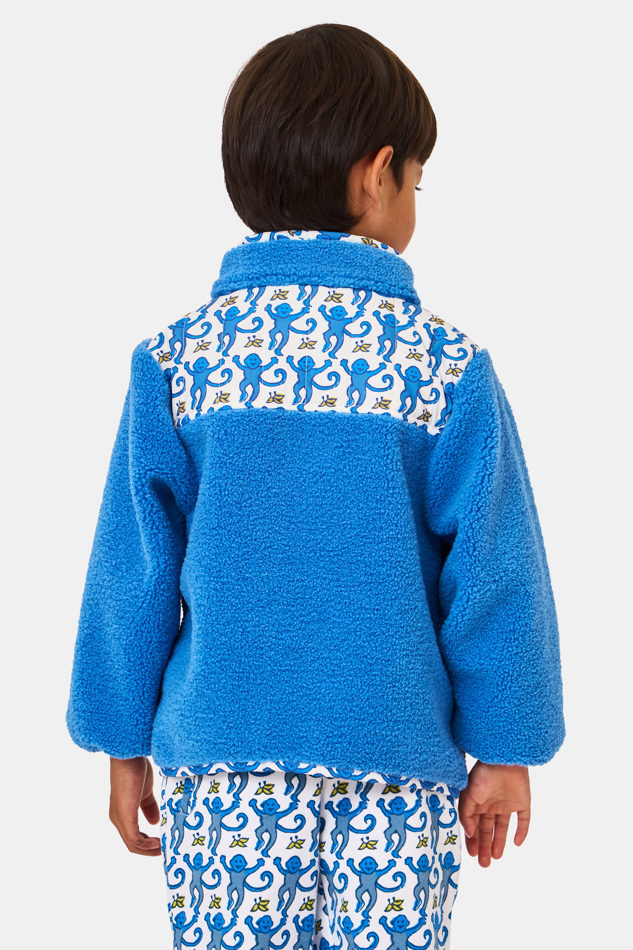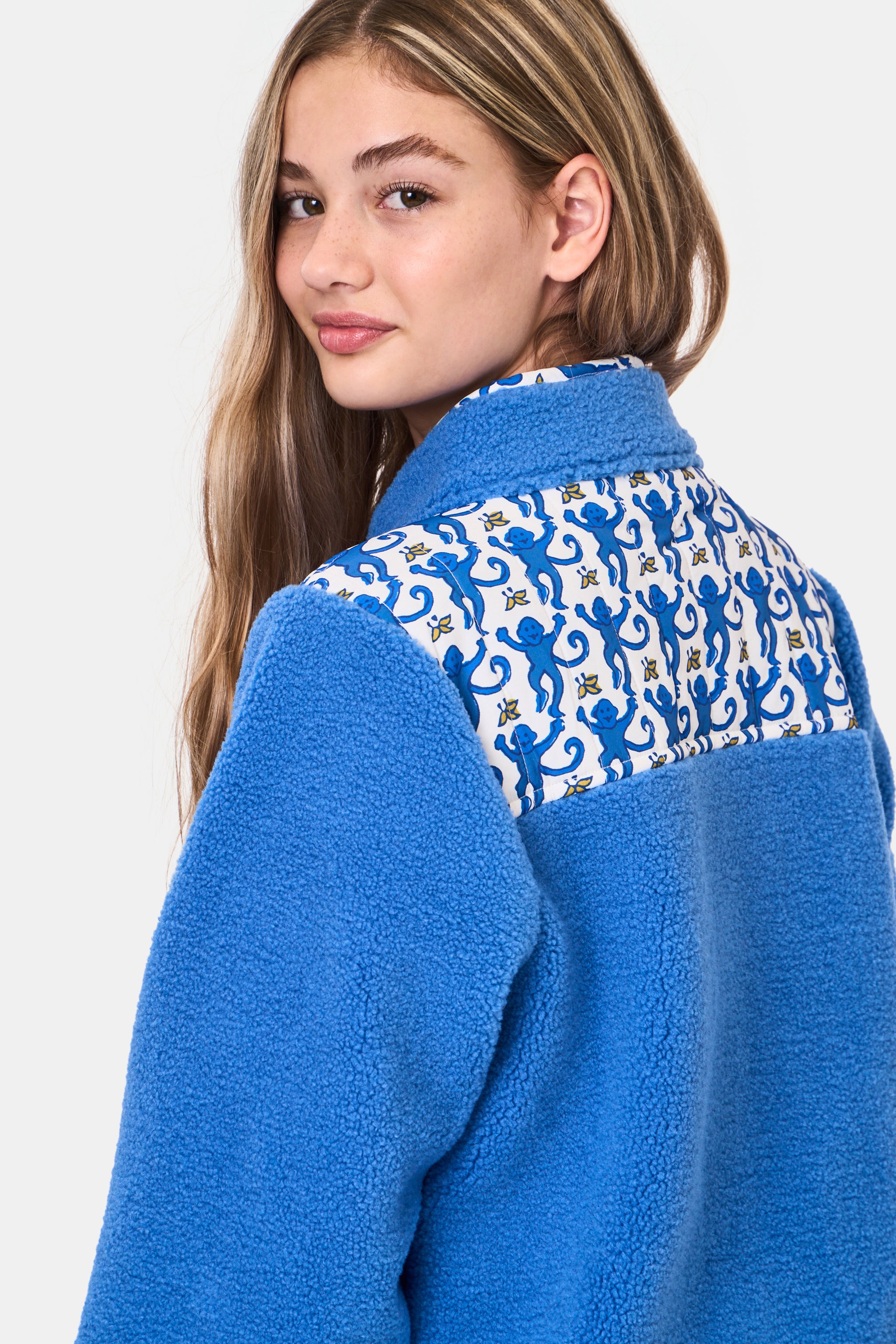The Kids Lizzie Fleece Jacket is ready for every fall and winter adventure. Made of snuggly fleece in a sweet blue and monkey print pattern, she can wear this pullover to school, the pumpkin patch, or playdates and stay warm and cozy.