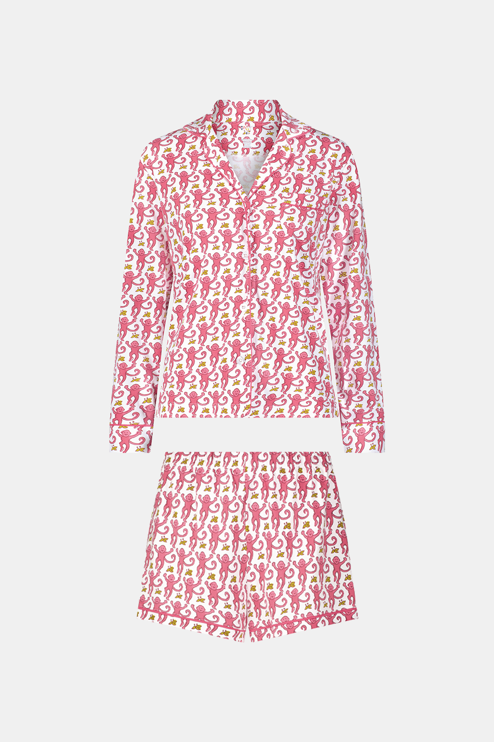 Expand your closet with these easygoing pajamas all dressed up in your favorite Monkey print. The Paola Polo Set features a long-sleeved button-front shirt and elastic waist shorts to make every day feel like Sunday!