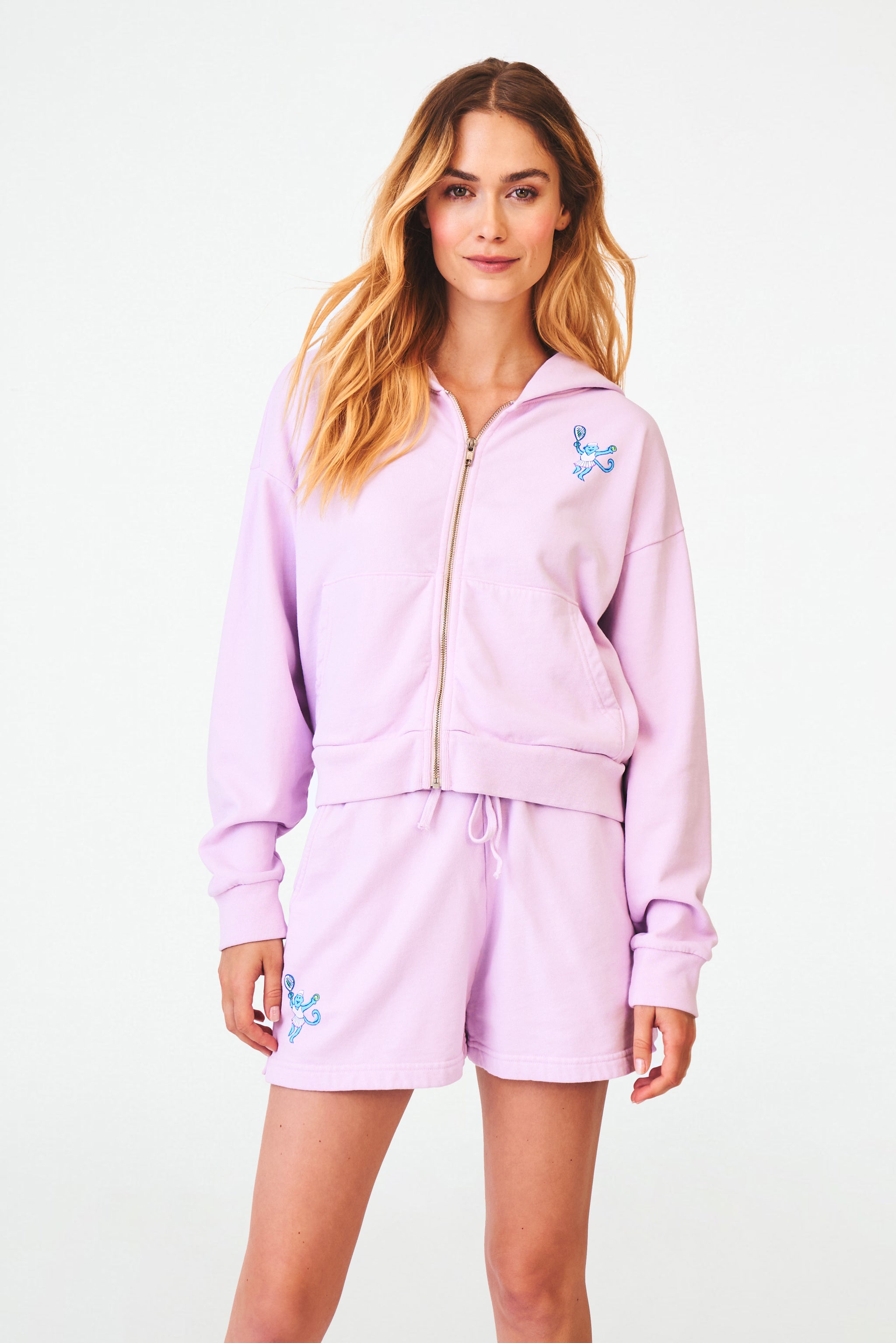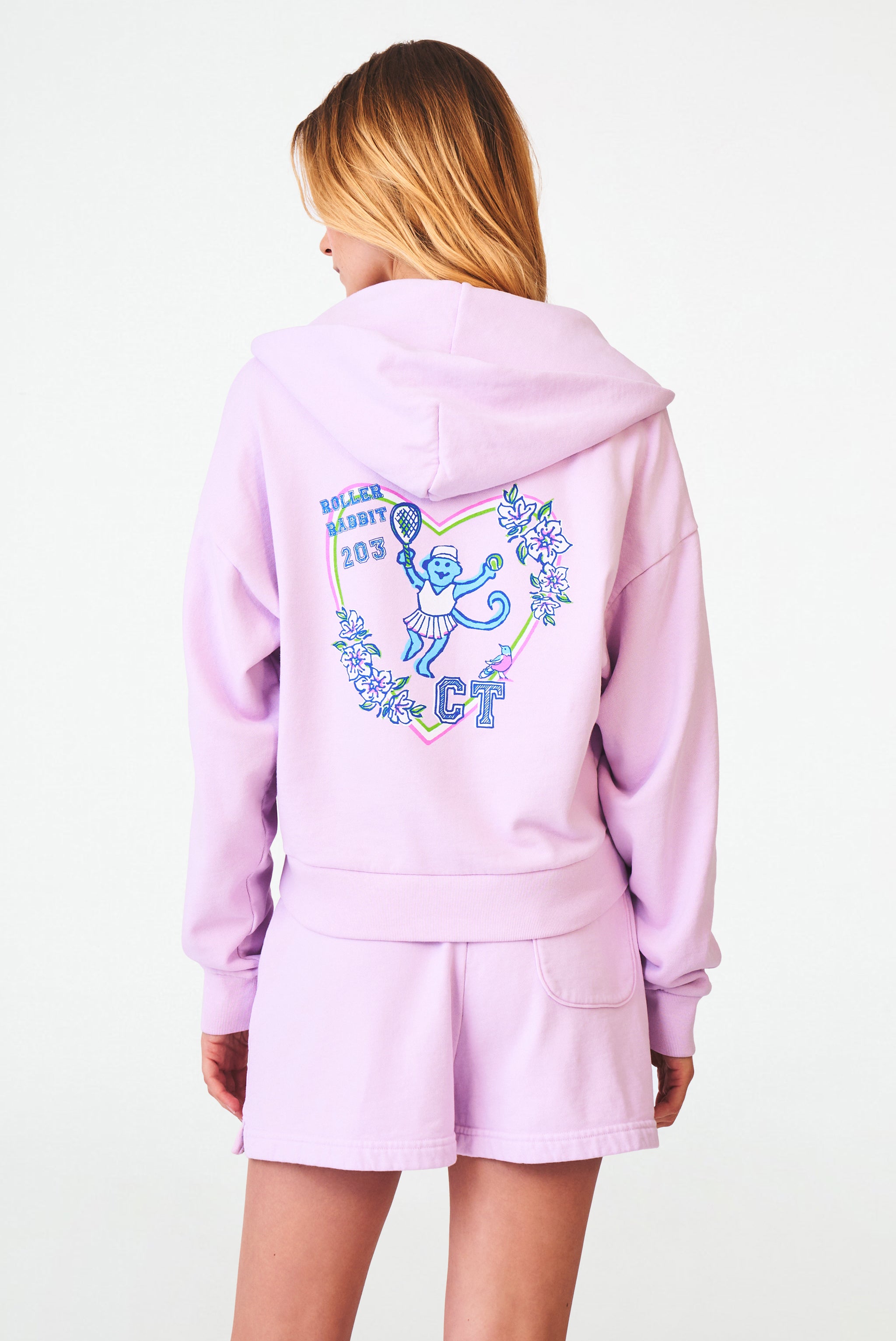 Sail away in the super soft, super cozy Connecticut Monkey Zip up. In true New England spirit, you'll find your favorite Monkey hitting a racquet, and what better way to be cozy than in this stunning pale pink zip up!