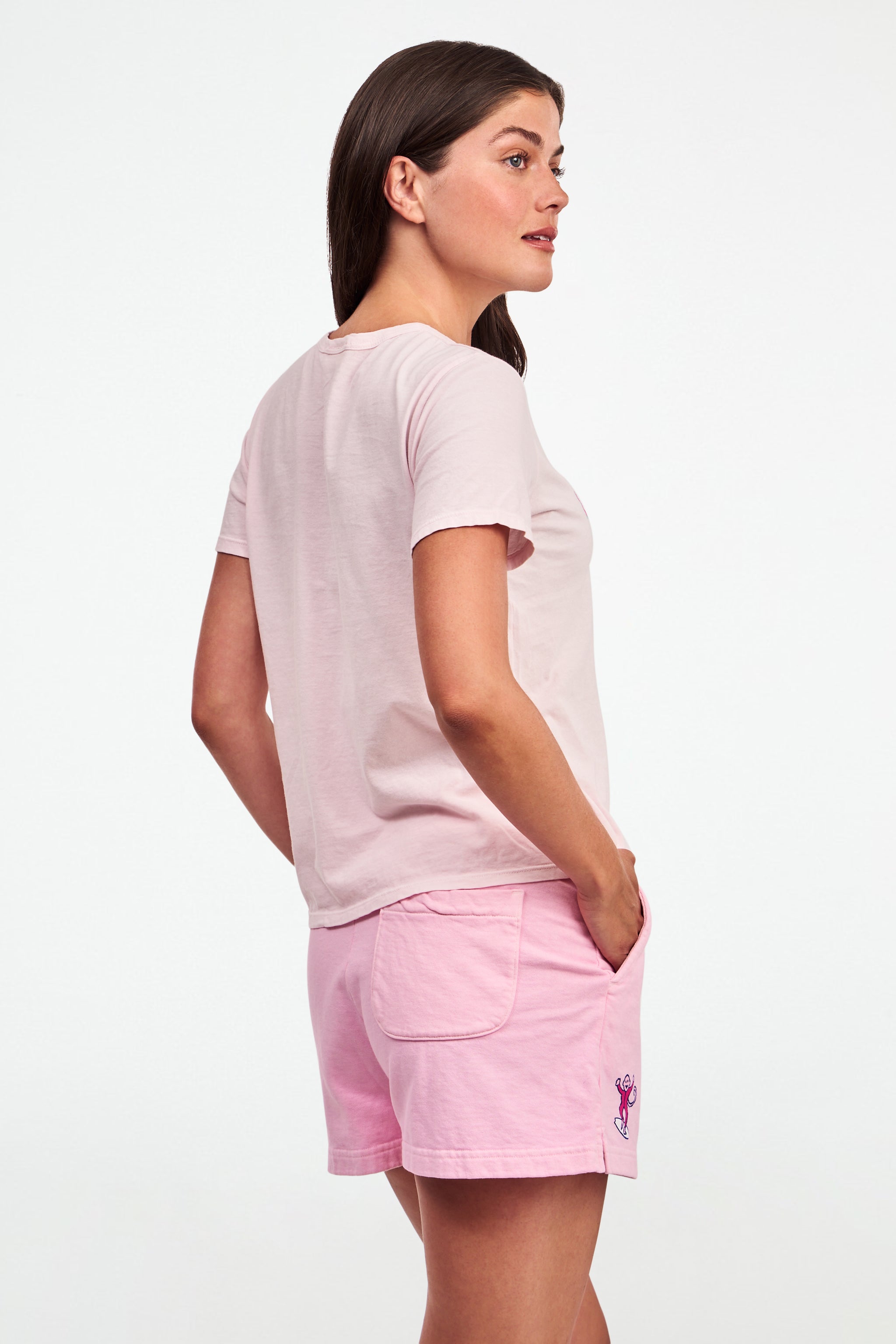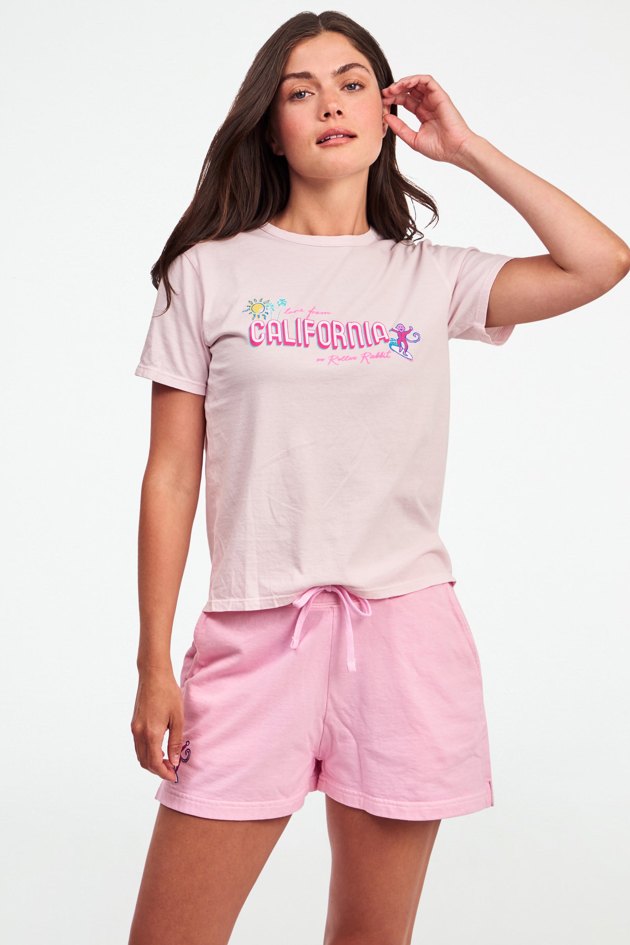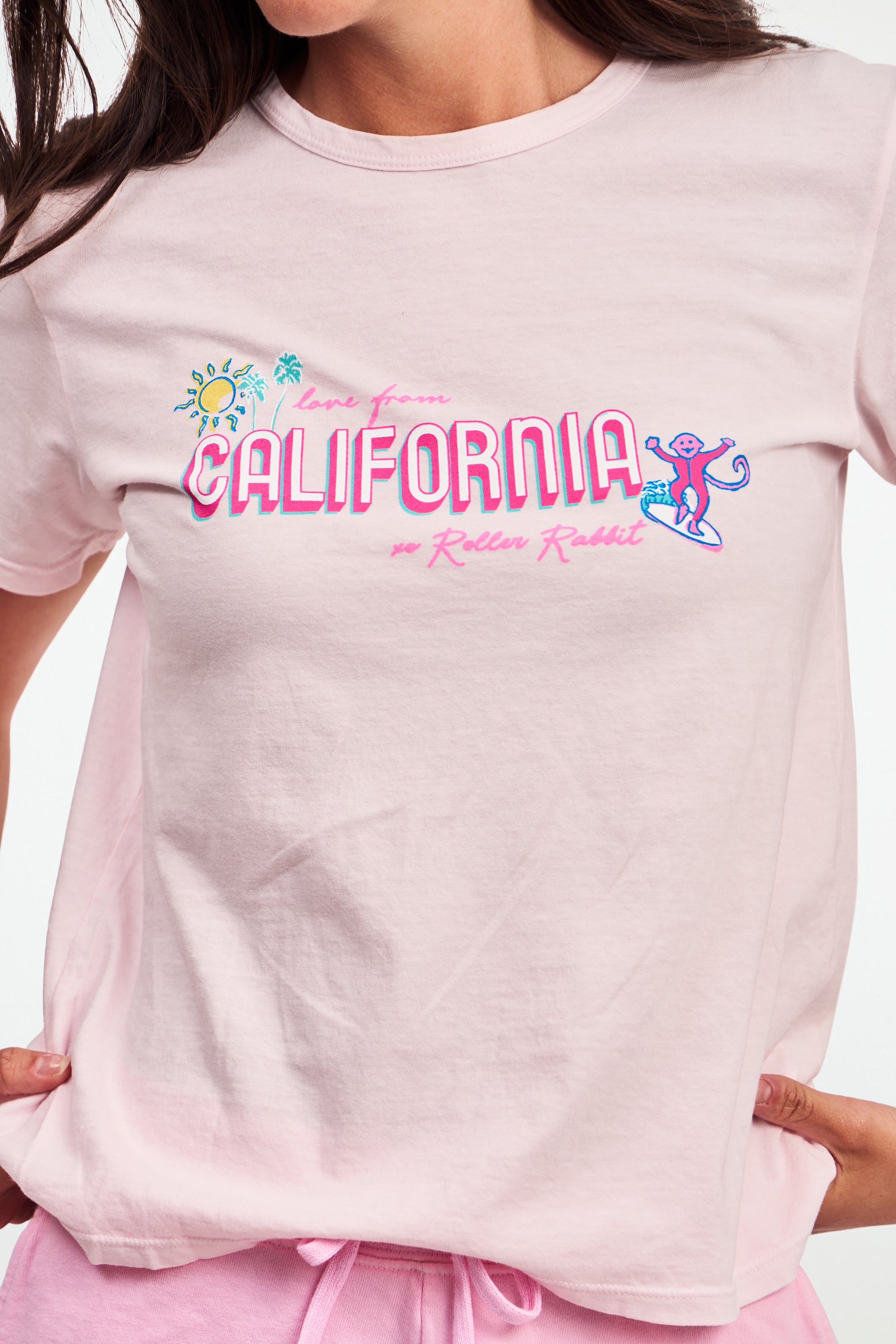A crisp, baby pink tee with love from California. What better way to remember your travels or hometown with this fun loving tee.