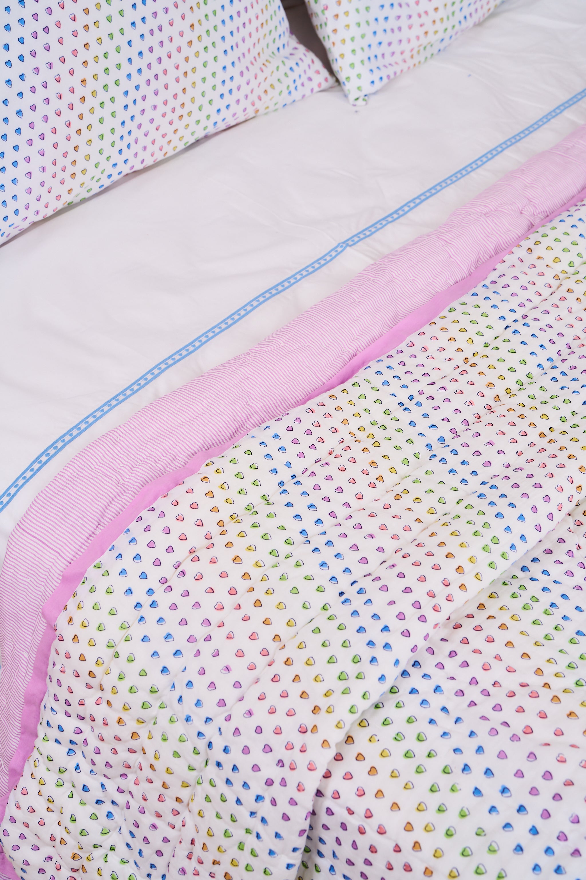 Sweet dreams await when you snuggle up underneath our Disco Hearts quilt. Features our multicolored take on our classic Hearts print, a classic Capellini stripe on the reverse and lilac border.