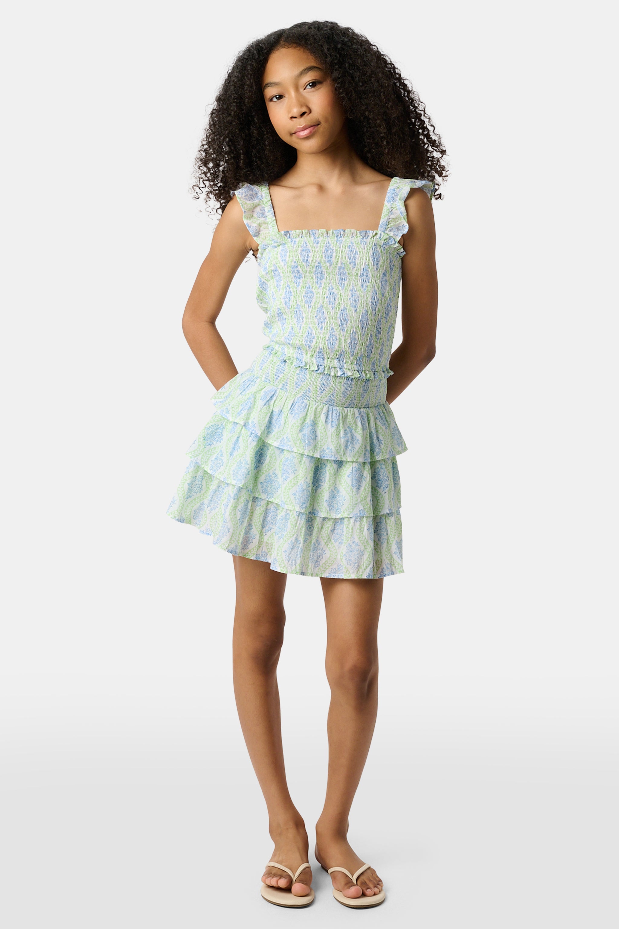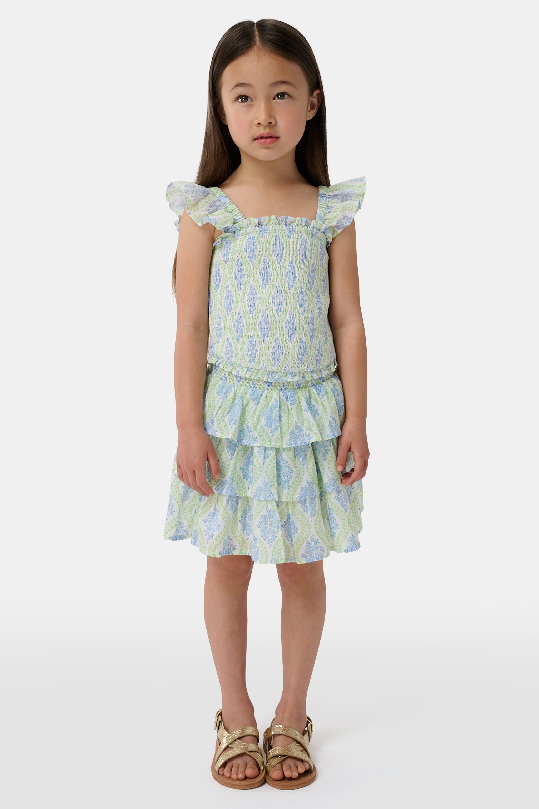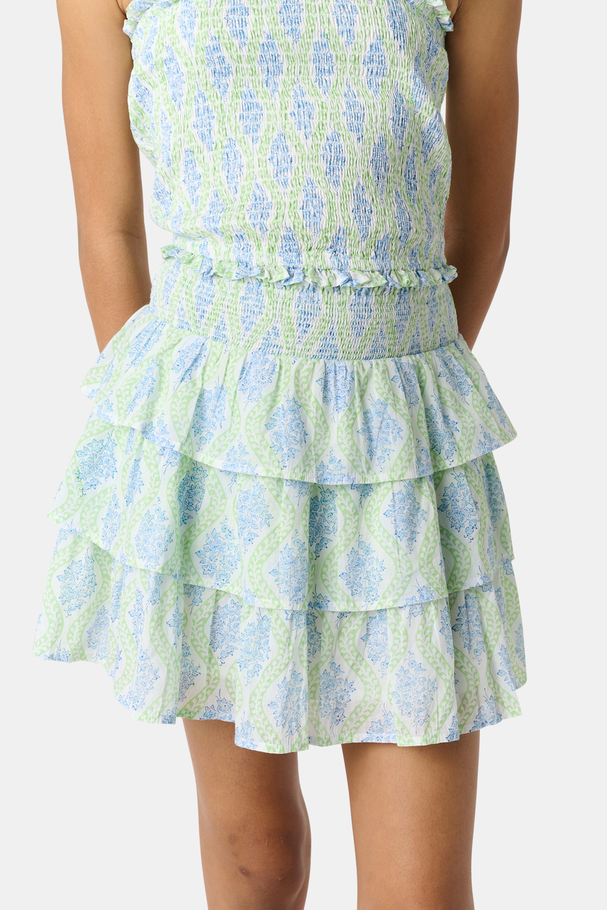 There's nothing cuter than a ruffly summer skirt! Our Sami is a tiered, ruffled mini with a relaxed smocked waistband and pretty green and blue print. Make it an outfit with the matching Tory Top.
