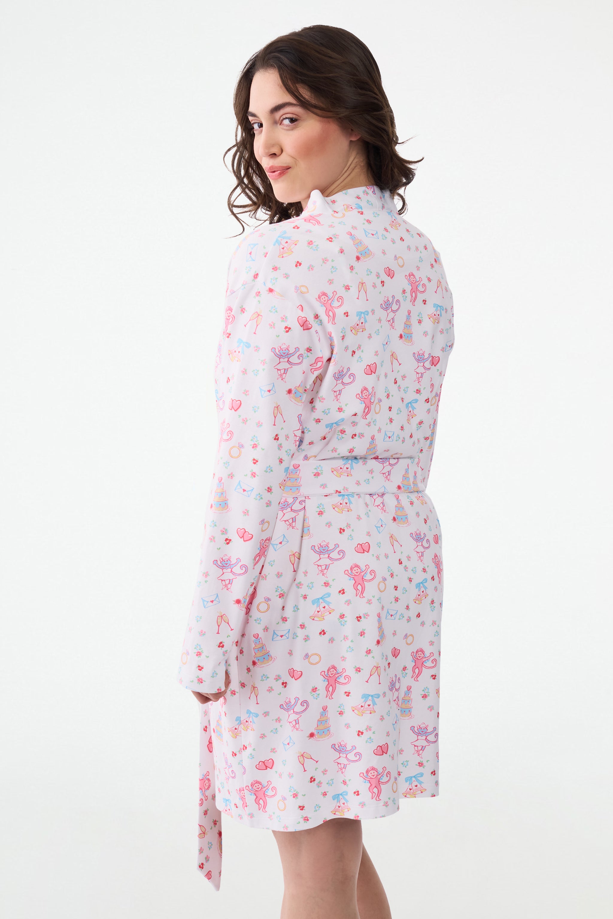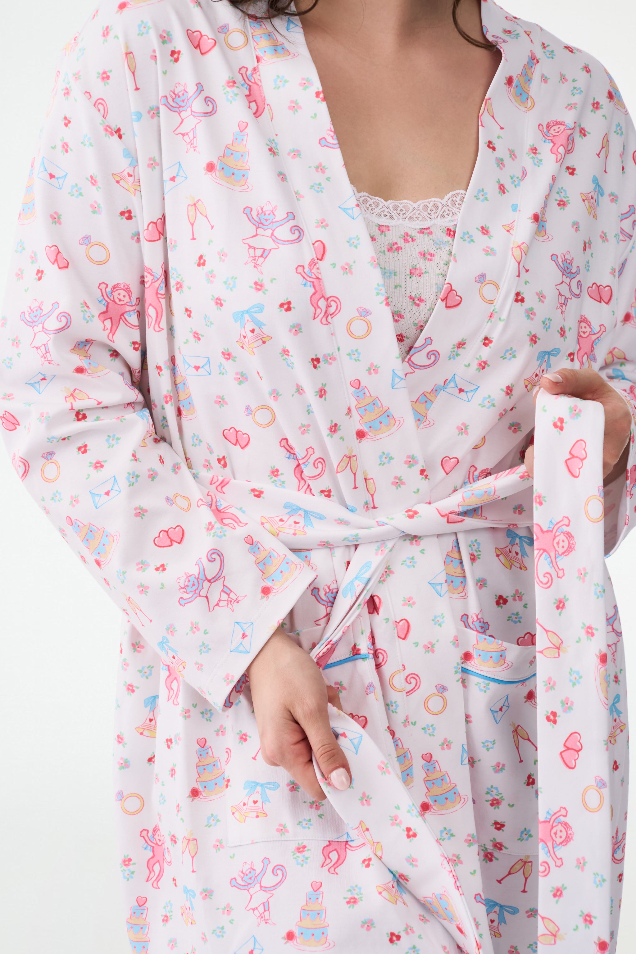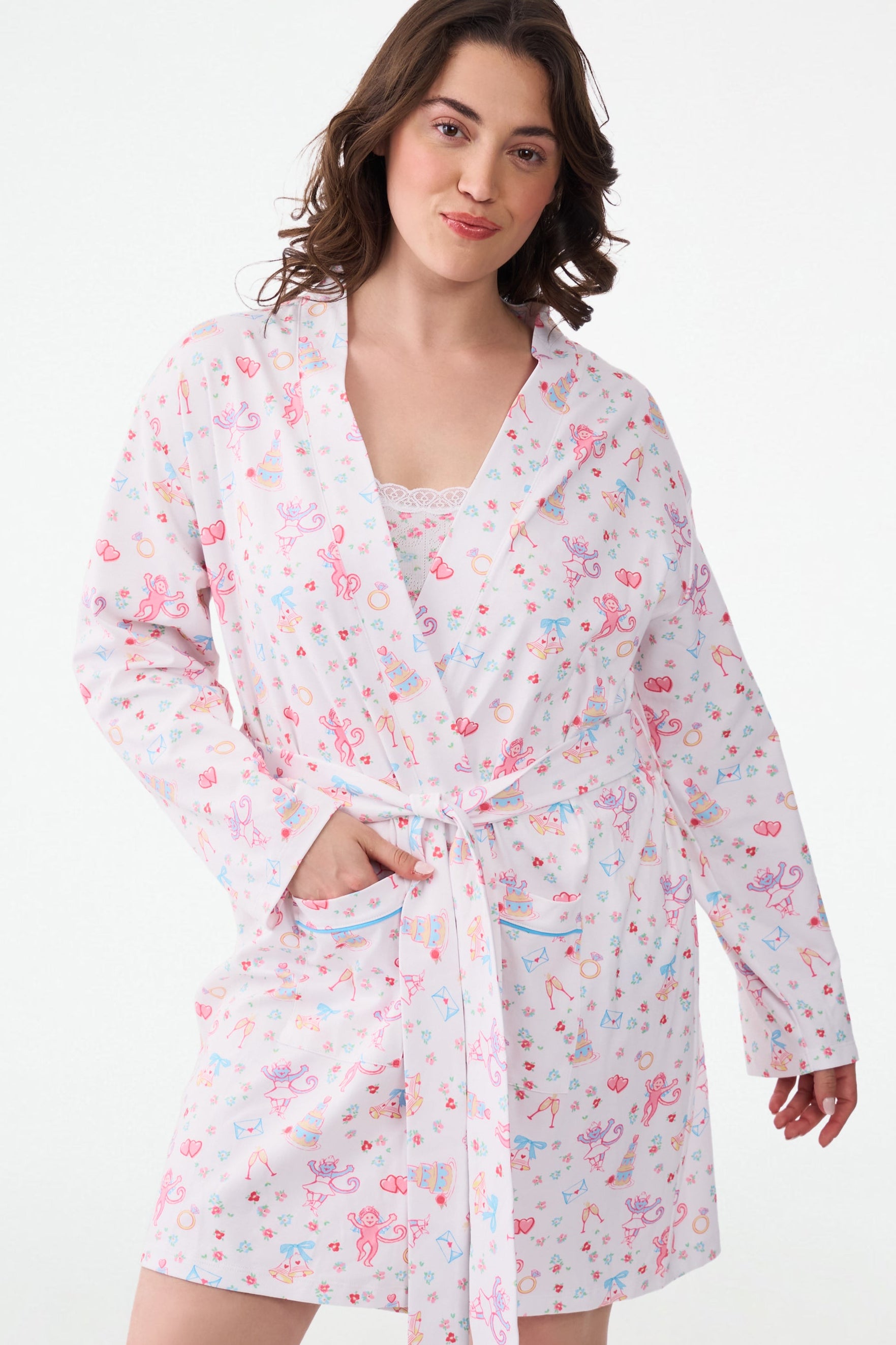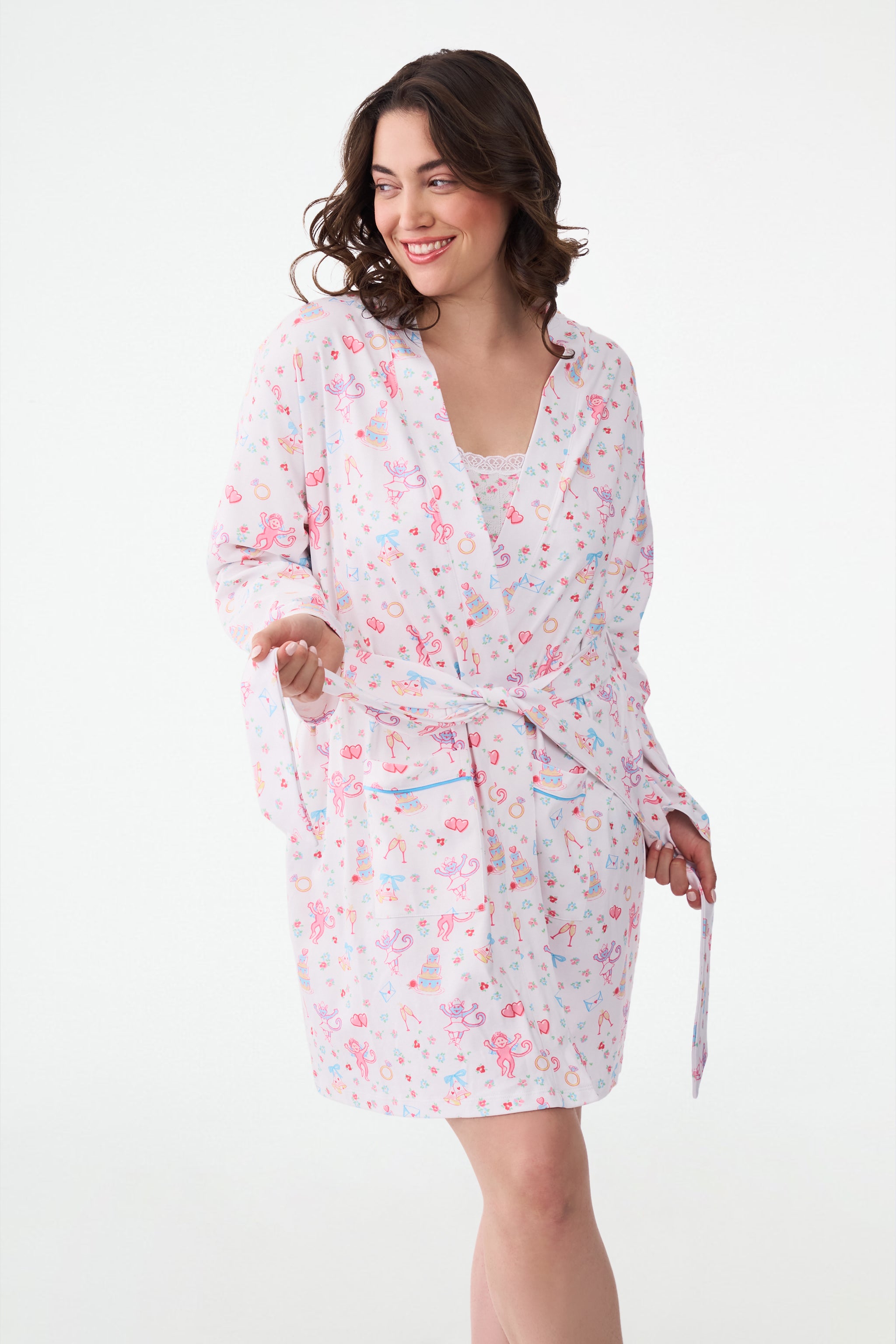 This robe is perfect and just in time for my daughter’s big day. The Monkey Said Yes pattern is just the cutest. The robe is soft and cozy. It will be great for spring and summer as it’s not too heavy. My daughter is 5’2 and 110 pounds, the XS/S was a great fit.