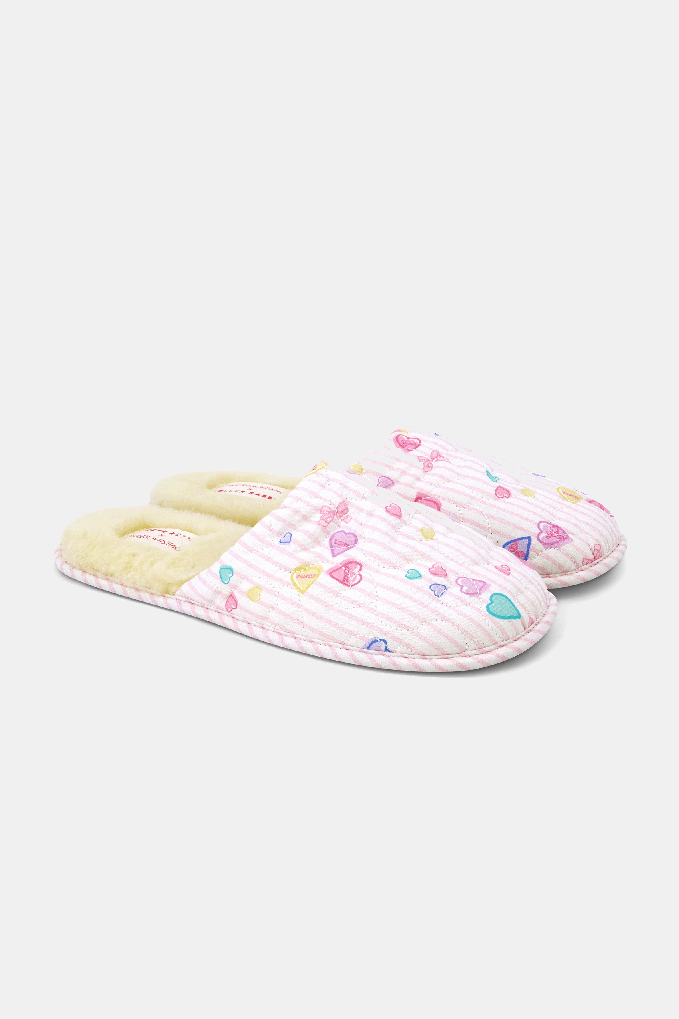 Slip into sweet, cozy comfort both a.m. and p.m. in our Quilted Slippers, a slip-on faux-shearling style in the Roller Rabbit x LoveShackFancy Candy Hearts Stripe print.