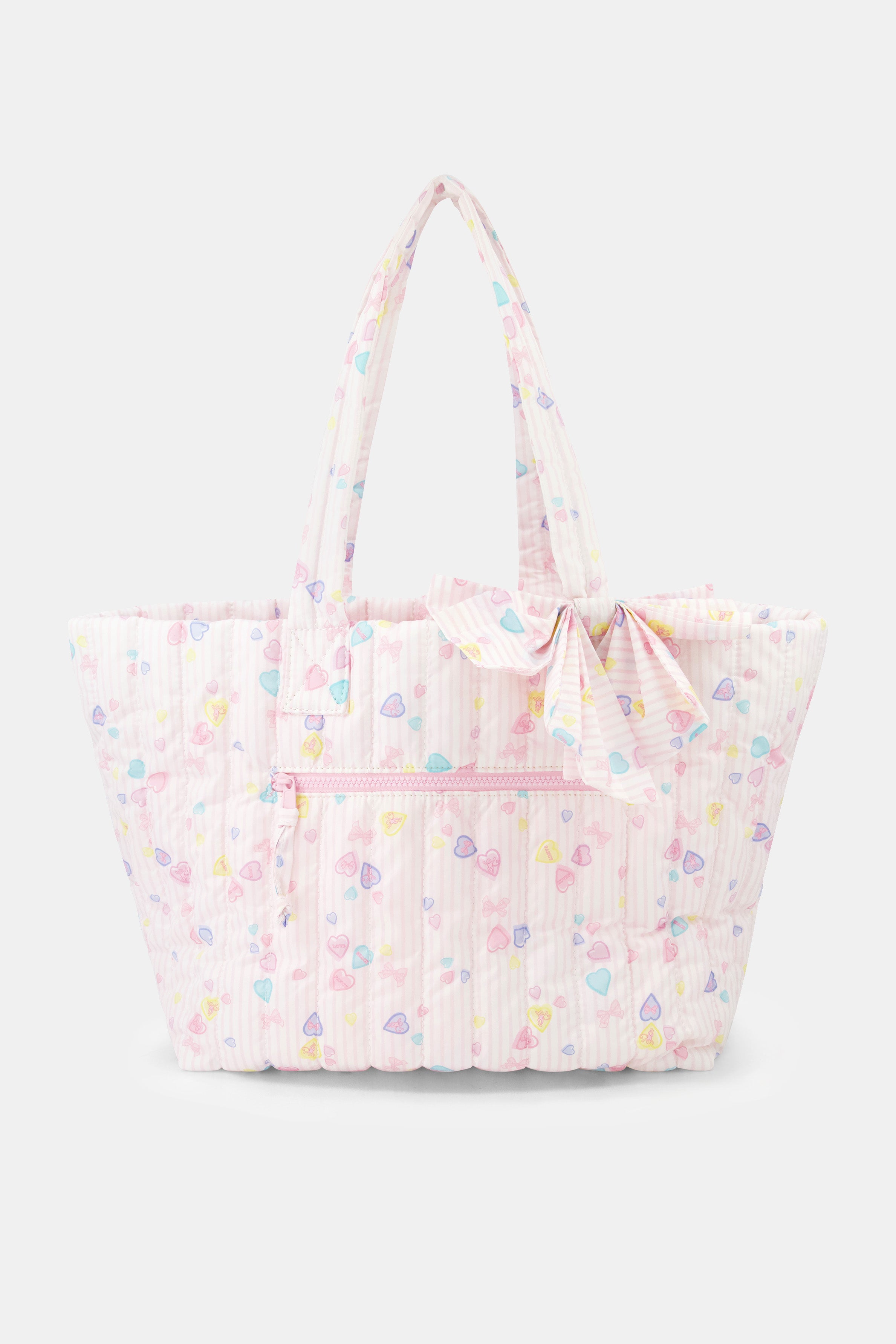 The perfect size for a sleepover or short weekend away, our quilted tote is a classic style with dreamy, flirty details, including the Candy Hearts Stripe print and a sweet bow at the base of one shoulder strap.