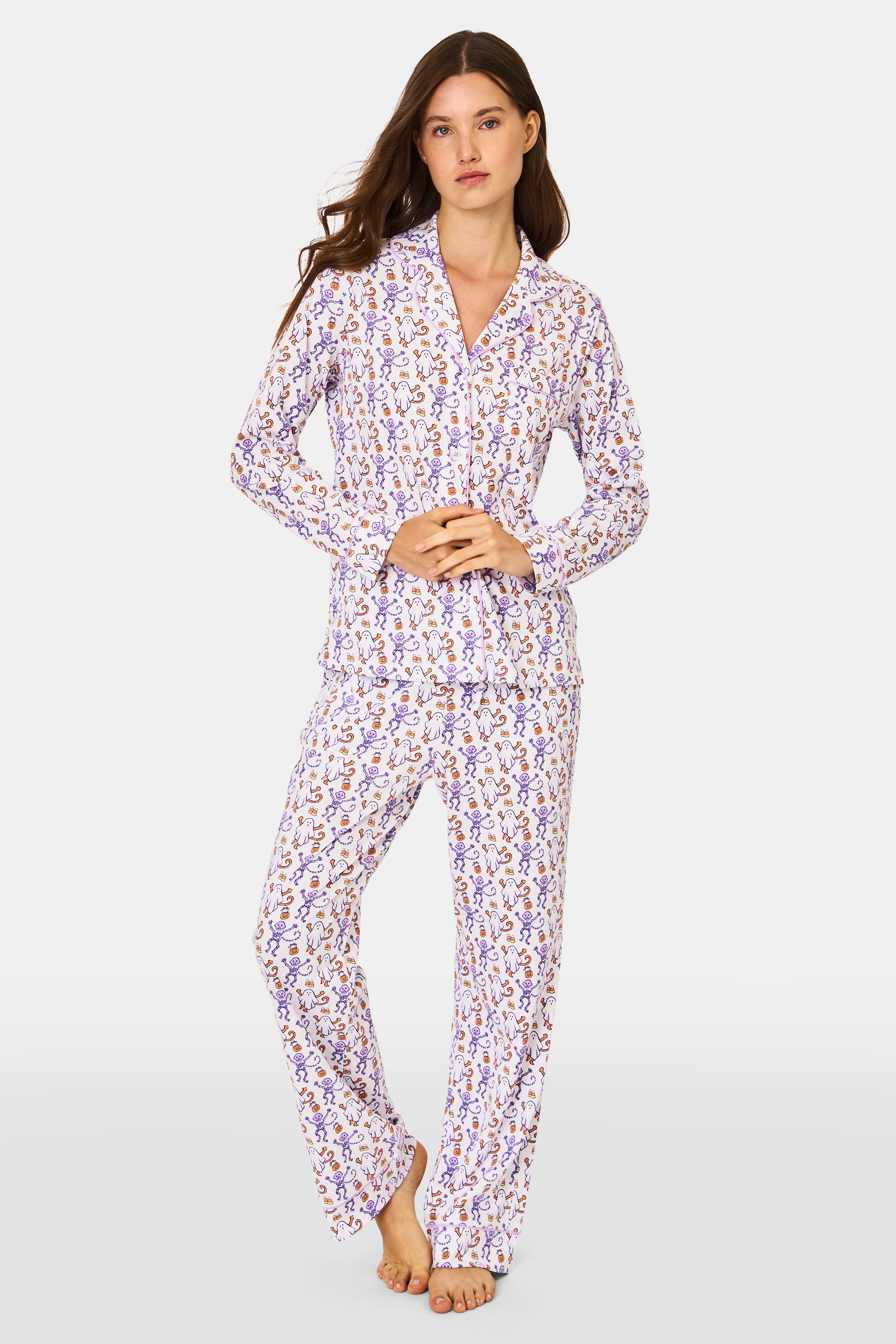 So berry cheerful! The Women's Long Sleeve Polo Pajama is a traditional long-sleeved PJ set with a button front top and long pants, covered in a cheeky Cheer Monkey print. The dreamy Pima cotton is made for all-day relaxing, watching the game on the couch, or hitting the snooze just a little bit longer.
