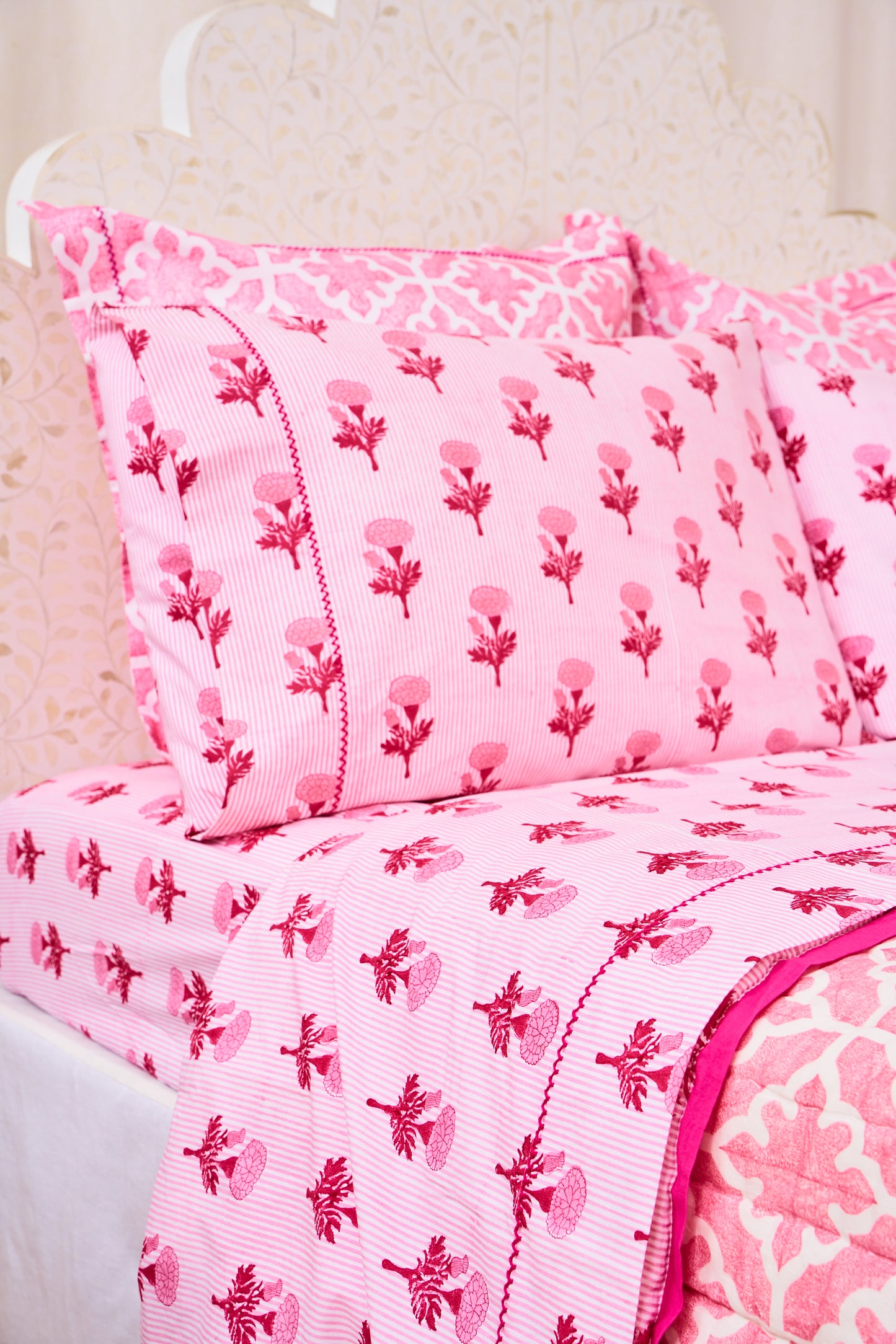 Get your beauty sleep on pretty pink sheets made of soft, breathable 300-thread-count cotton. The Ditsy Marigold Stripe block print is a gorgeous addition to your bed, whether it's a pop of color or a layered pattern.