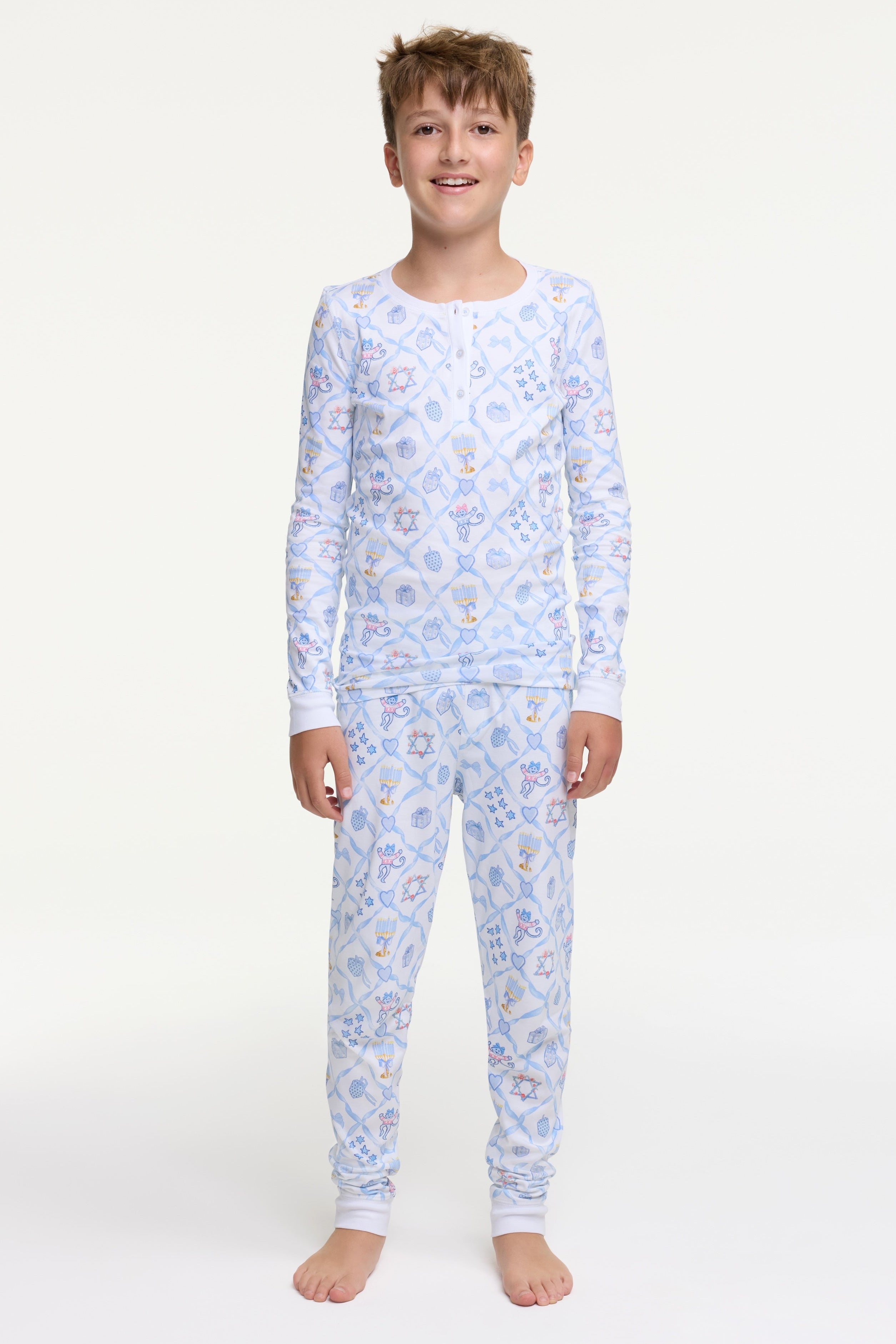 Starry Nights Lattice features dreidels, menorahs, and all of the fun and festive traditions of Hanukkah (and, of course, bows!) amongst a soft-blue ribbon lattice.