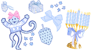 Starry Nights Lattice features dreidels, menorahs, and all of the fun and festive traditions of Hanukkah (and, of course, bows!) amongst a soft-blue ribbon lattice.