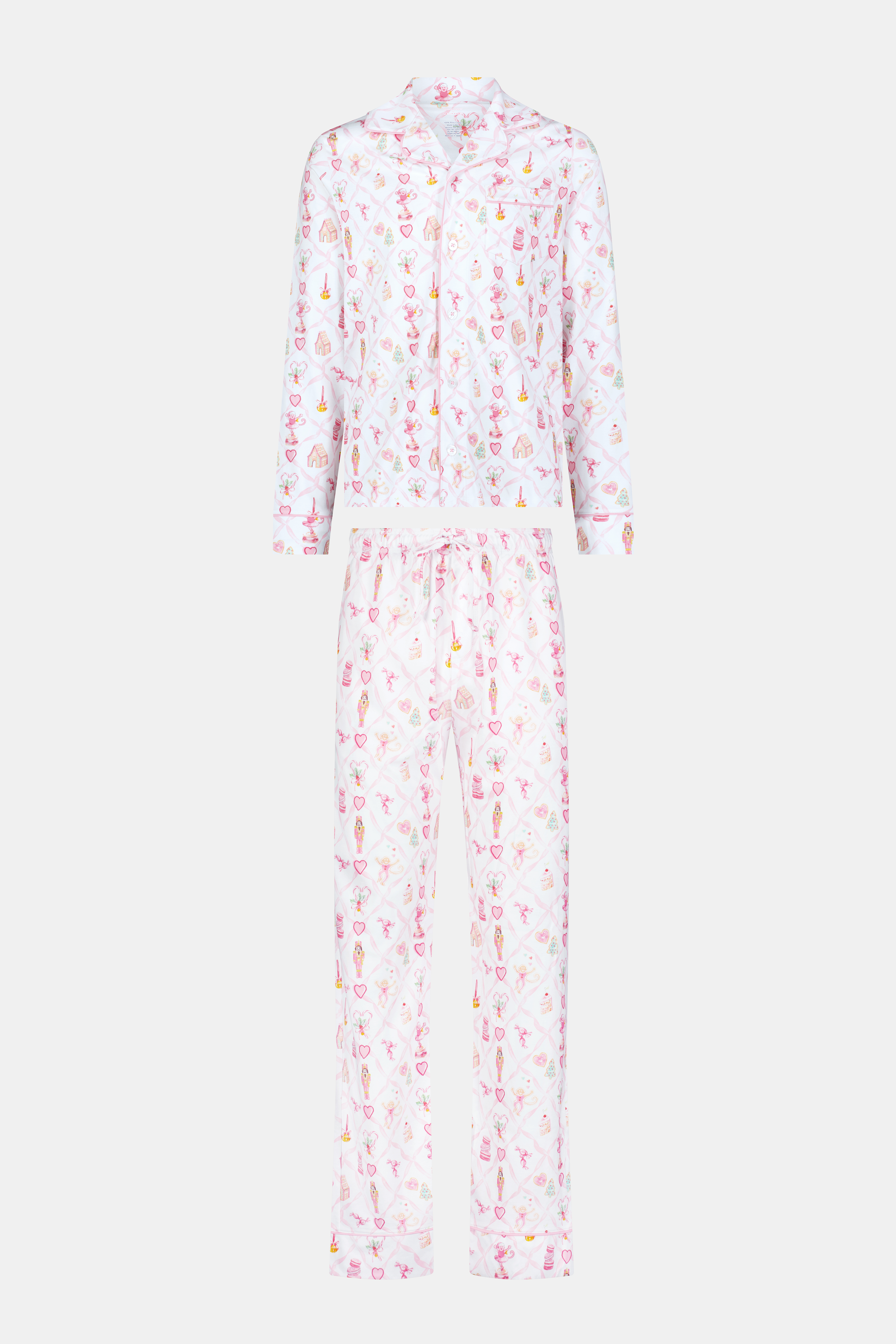 Sugarplum Lattice features gingerbread houses, candy canes, cookies, macaroons and all of our favorite Christmas sweets amongst a dreamy pink ribbon lattice.