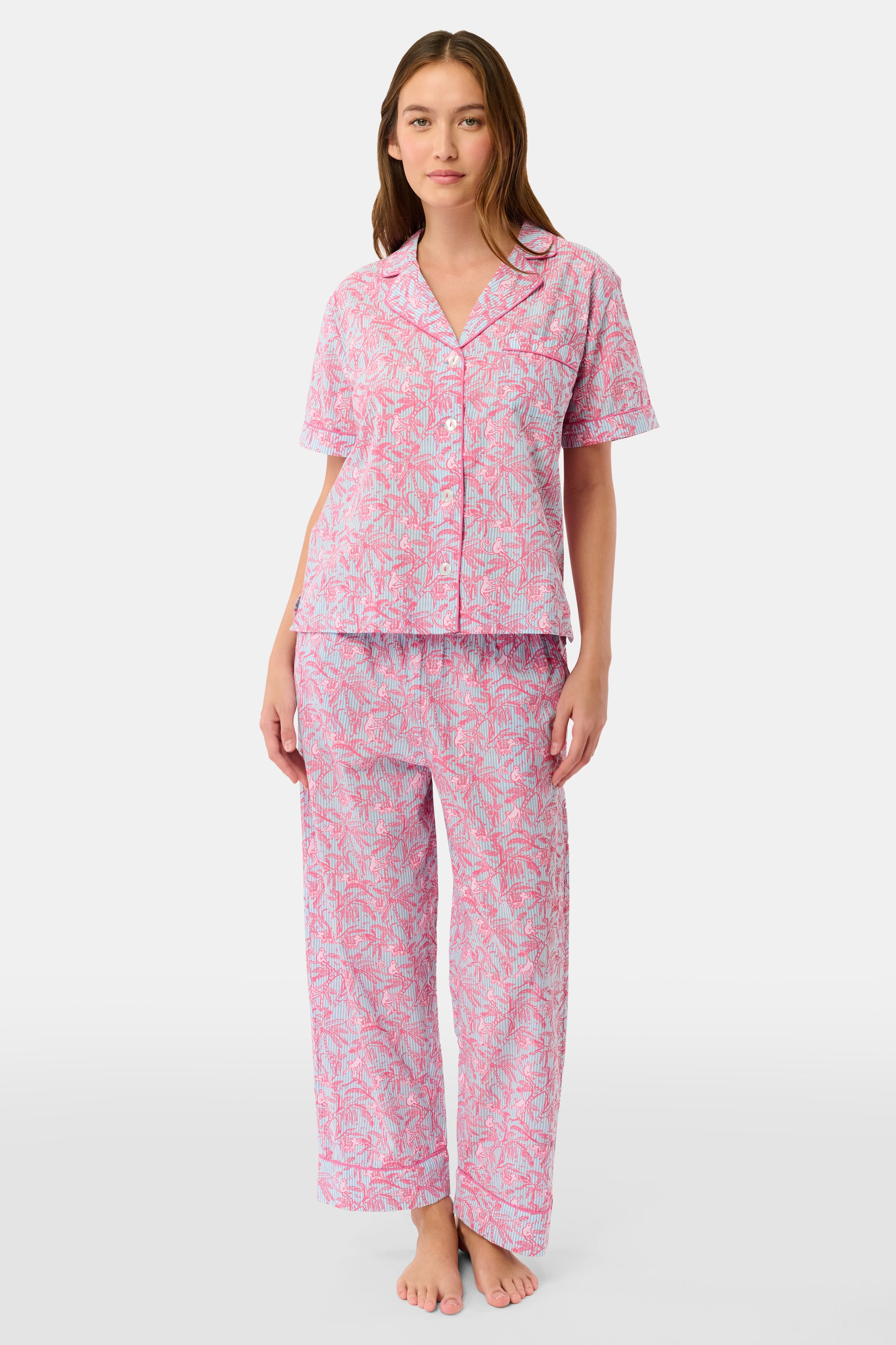Give your sweats the night off and slip into something more sophisticated. The Liza Lounge Set is a timeless two-piece set with a short-sleeved top and classic-fit pants in a vivid pink and blue tropical print enhanced by deep pink piping.