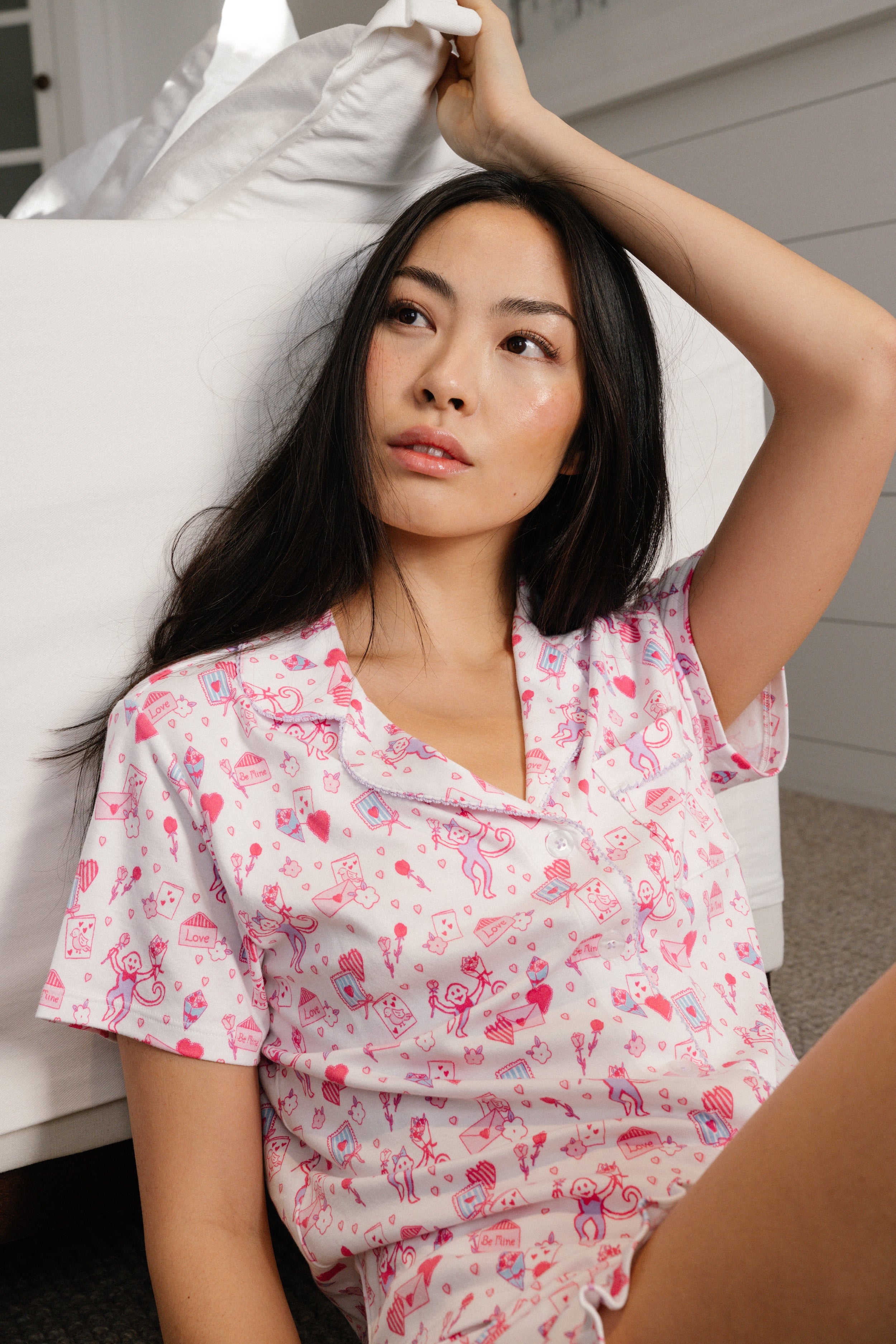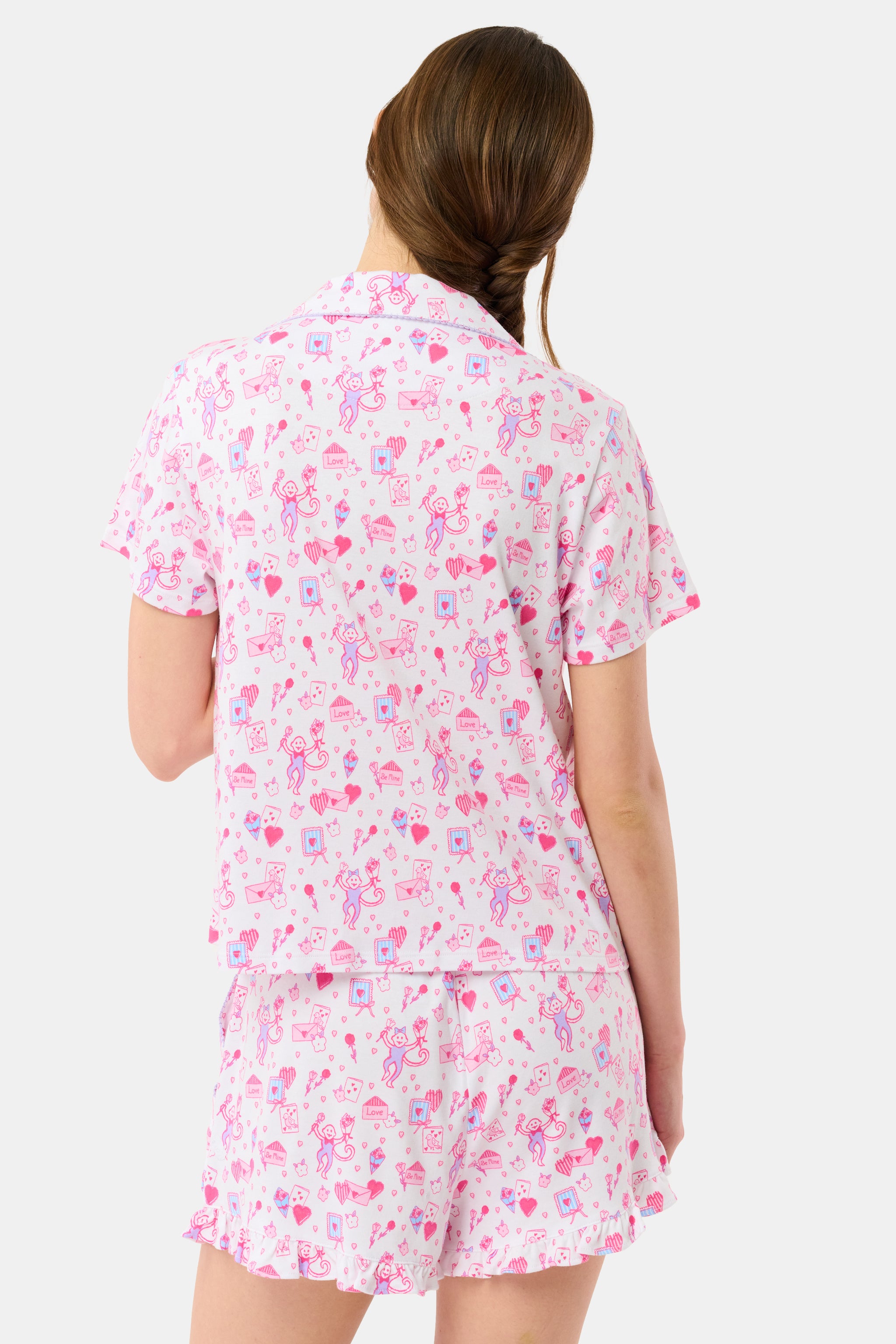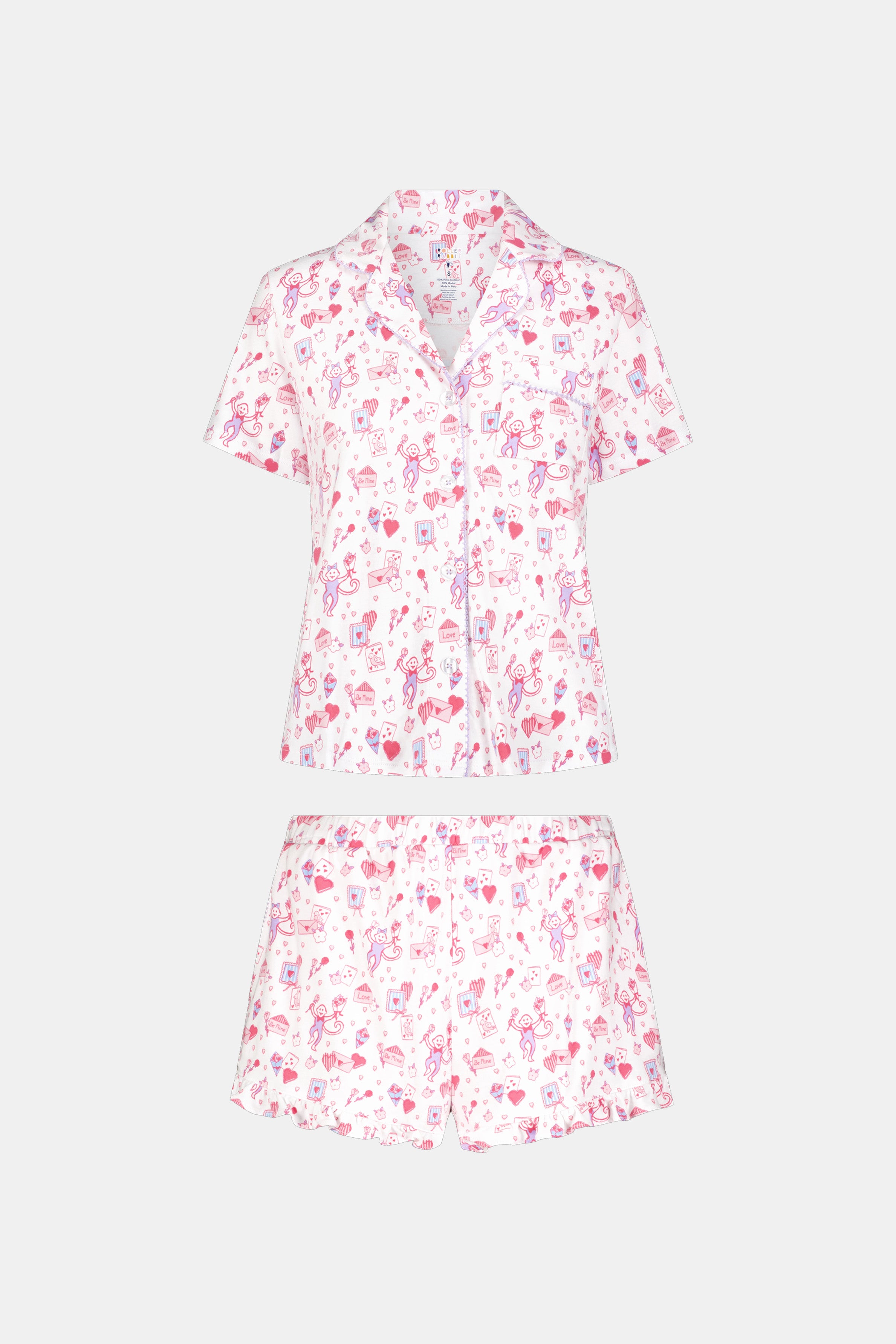 You've got a love letter! Swoon over the sweetness of our Wyatt Lounge Set, a two-piece short-sleeved top and shorts set in a festive pink Valentine print. Our favorite detail? The darling, flirty ruffled hem of the shorts, of course.
