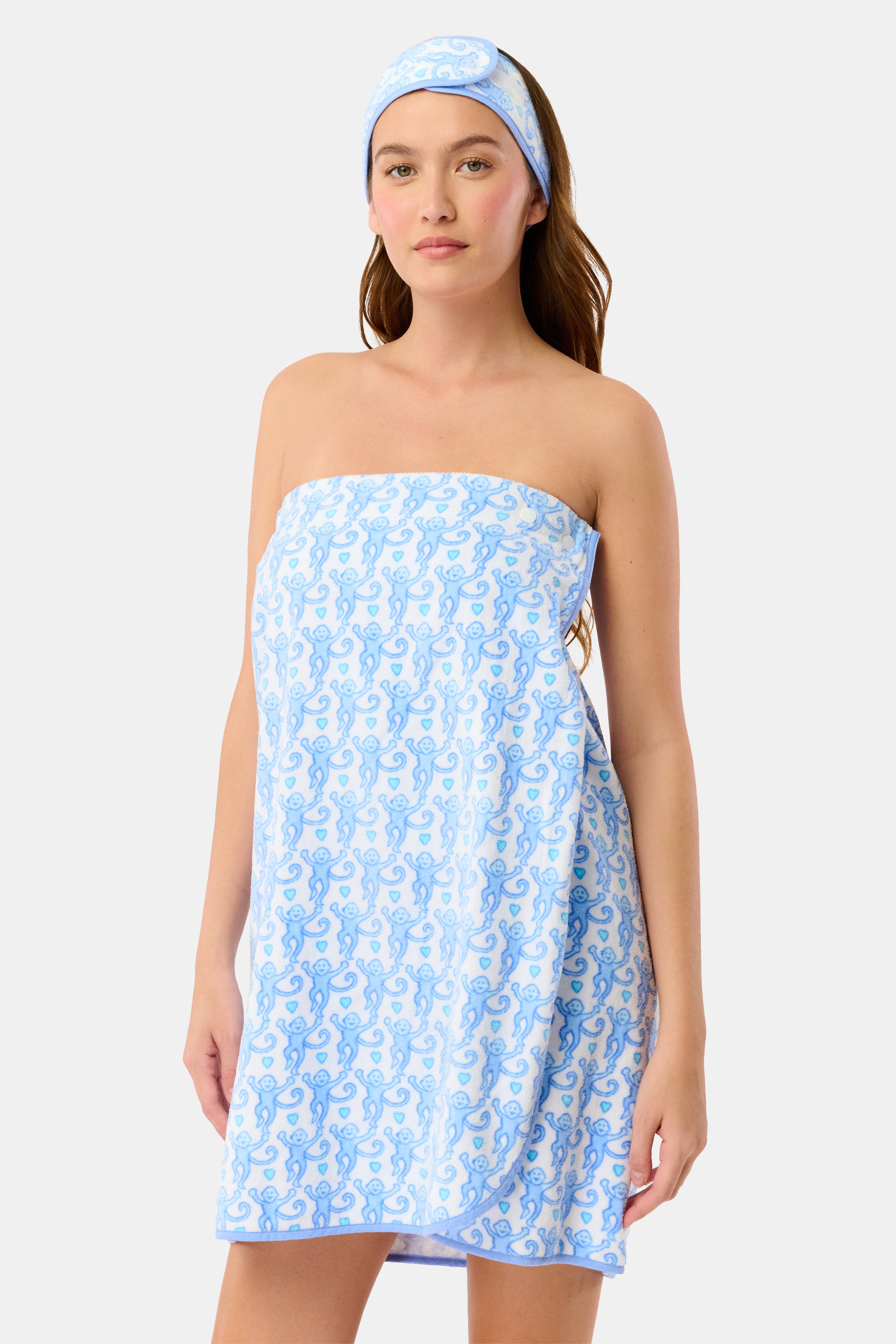 Make getting ready a whole lot cuter in our cheeky Towel Wrap, a light blue terrycloth wrap in our adorable, whimsical Lovely Monkey print. A stretchy panel at the top makes for a comfortable and secure fit.