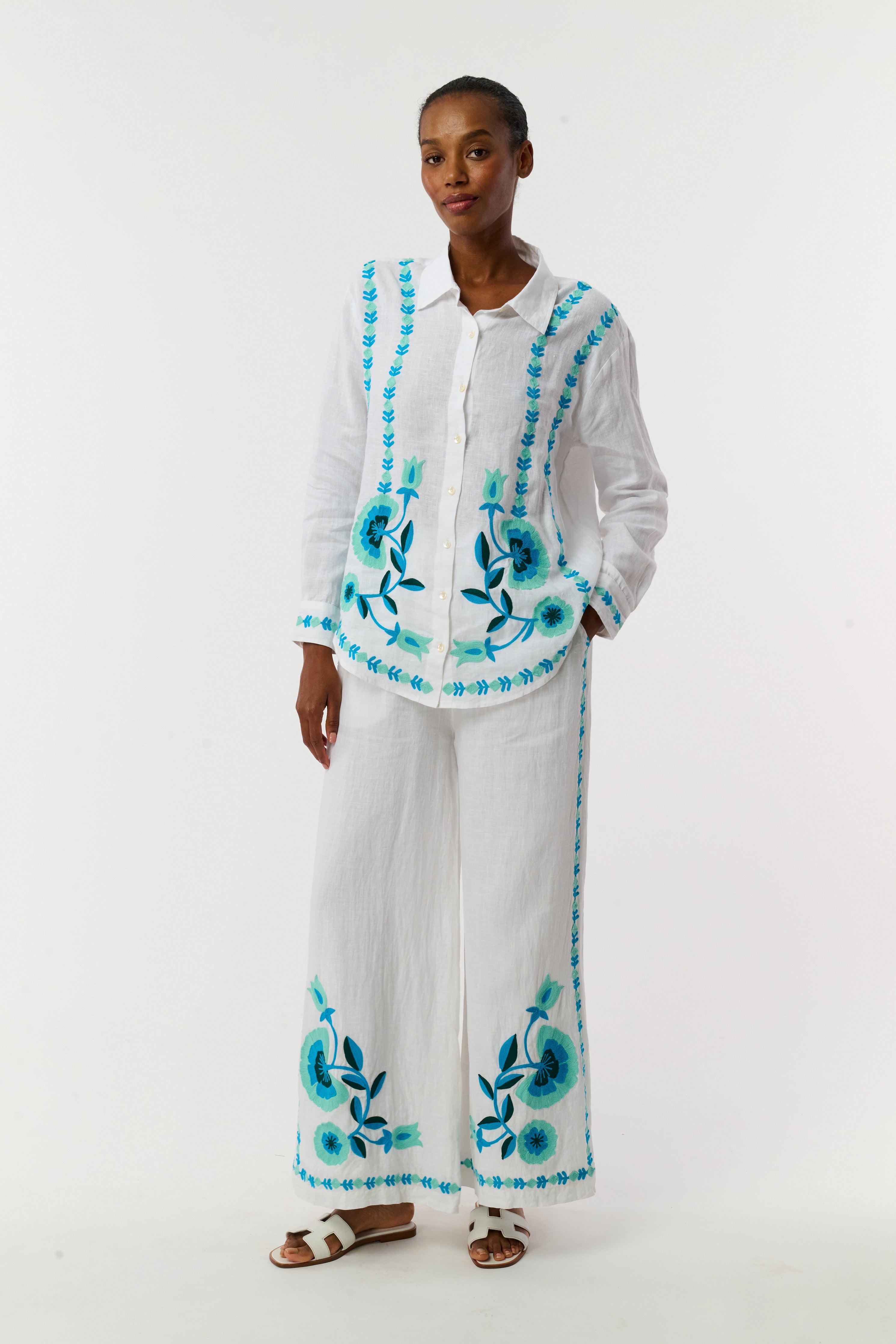 We put a beachy, boho spin on our beloved Boyfriend Shirt, a loose-fitting tailored shirt inspired by traditional menswear. Gorgeous, intricate floral embroidery in gorgeous shades of teal makes the crisp white shirt pop.