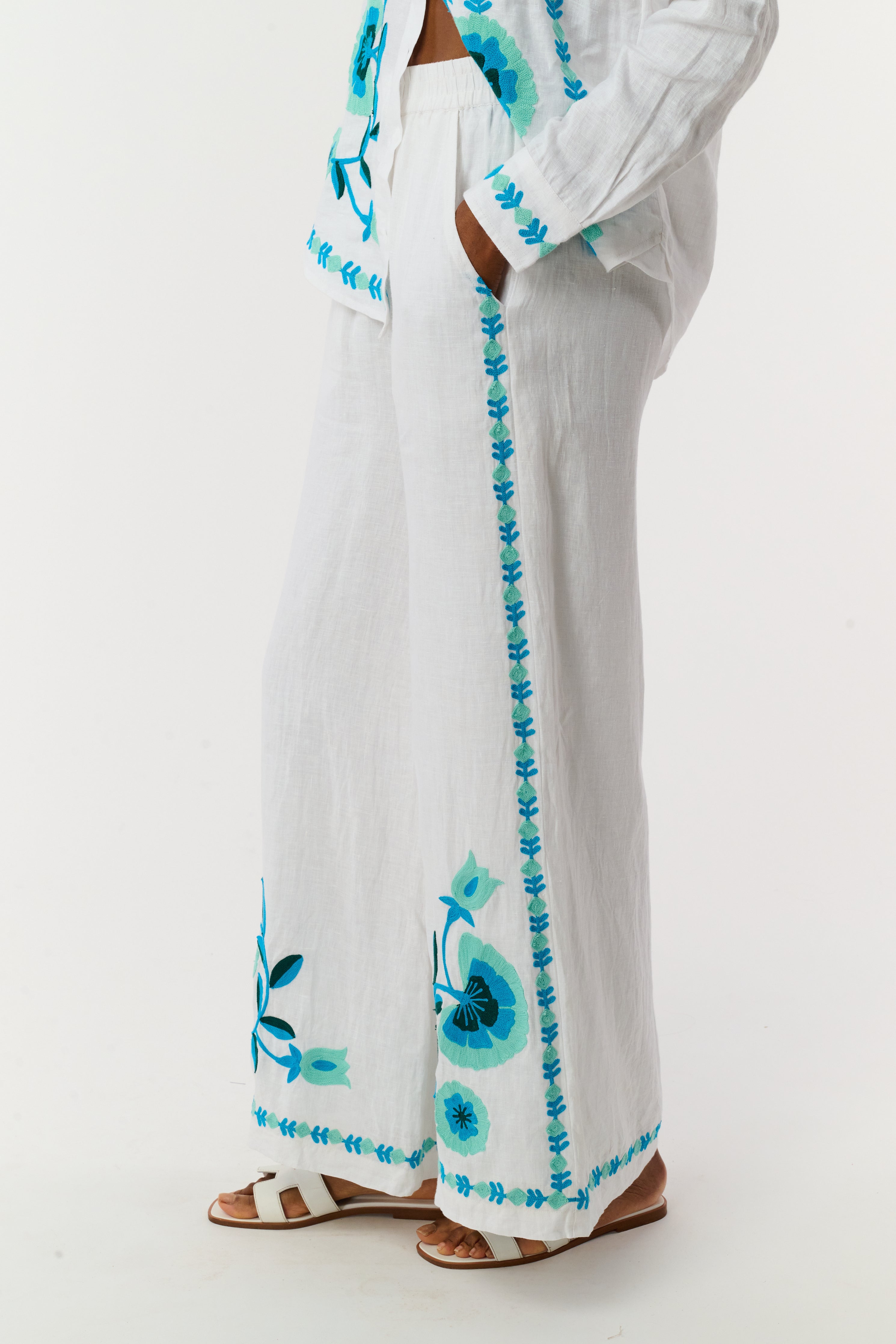White linen pants are a warm-weather essential, but we took things to the next level with richly detailed, colorful turquoise embroidery down the side seams and at the hem. For a full linen look, add the matching Boyfriend Shirt.