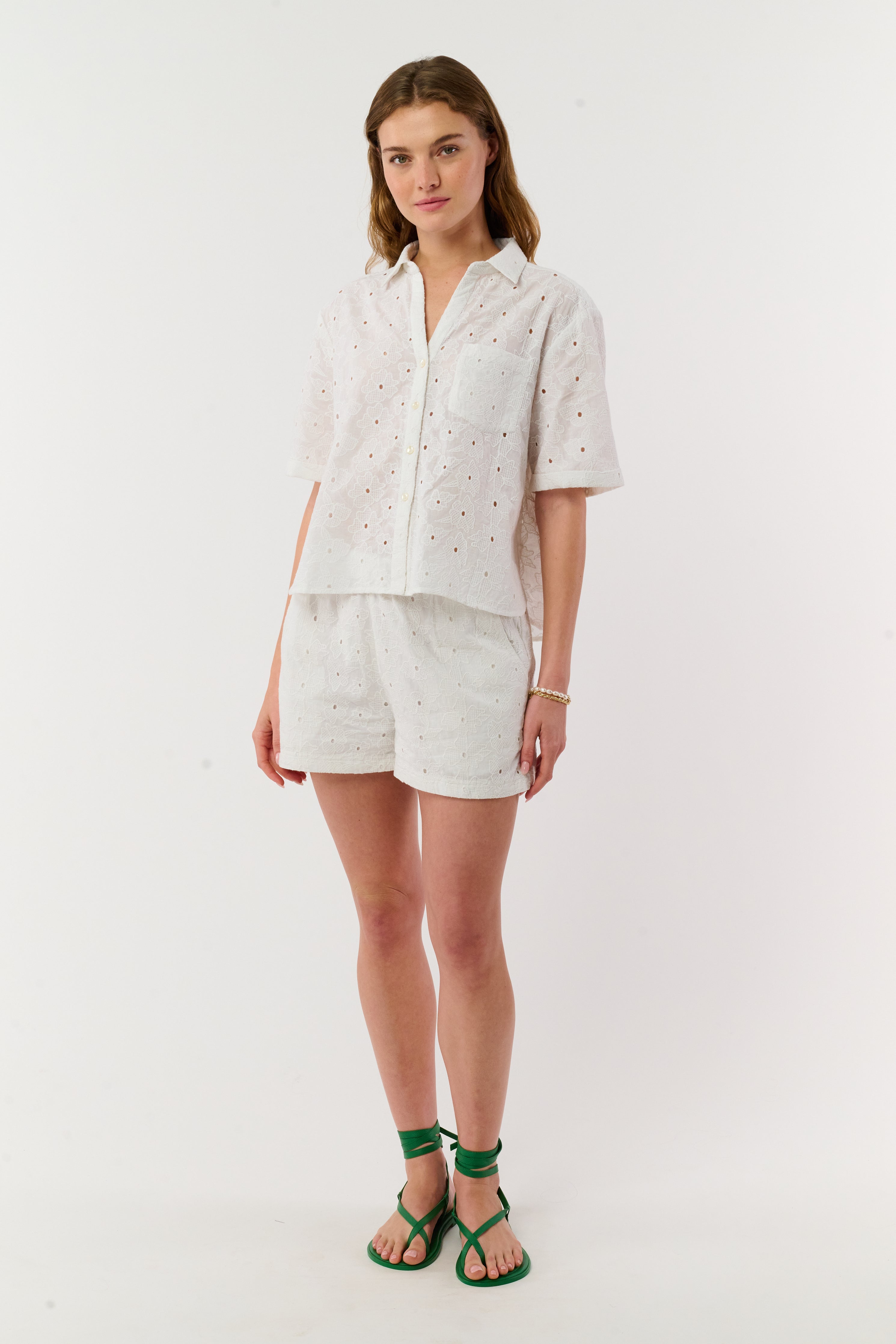 Casual cool doesn't have to feel unattainable. The Frankie Shirt makes getting dressed an (ocean) breeze with its cropped silhouette, soft floral cotton eyelet fabric, and easy button-up style - add the matching Cody Shorts for the full effect.