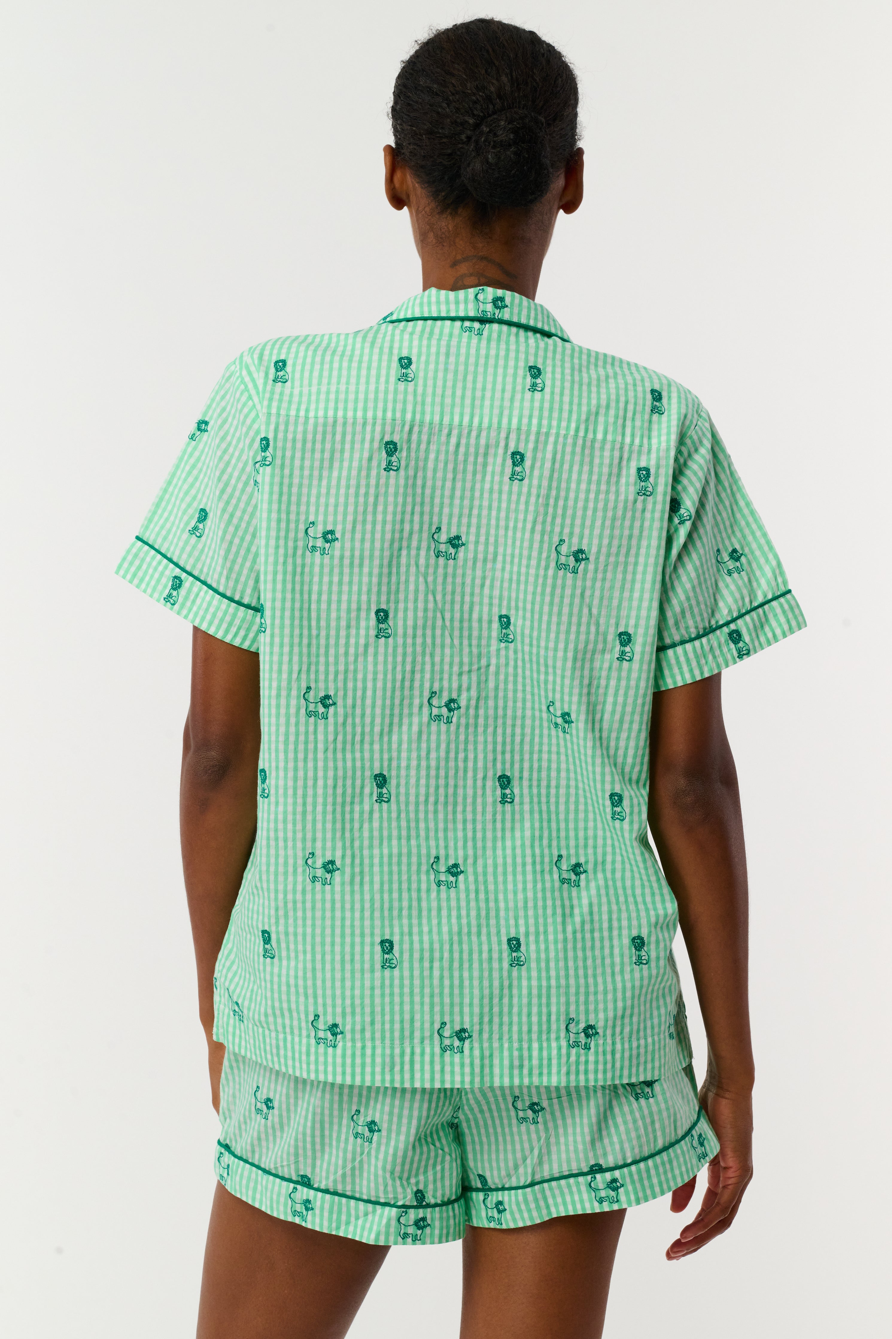 Loungewear shouldn't just be comfortable—it should be cute too! Our Leo Gingham Livy Set, a two-piece short-sleeve set, checks all the boxes: crisp striped cotton, adorable mini lions, and a totally timeless silhouette.